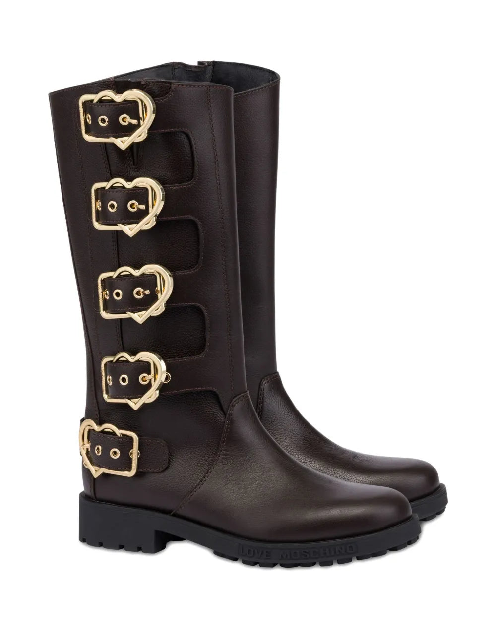 Botas em Pele Castanha Heart Buckle | Love Moschino