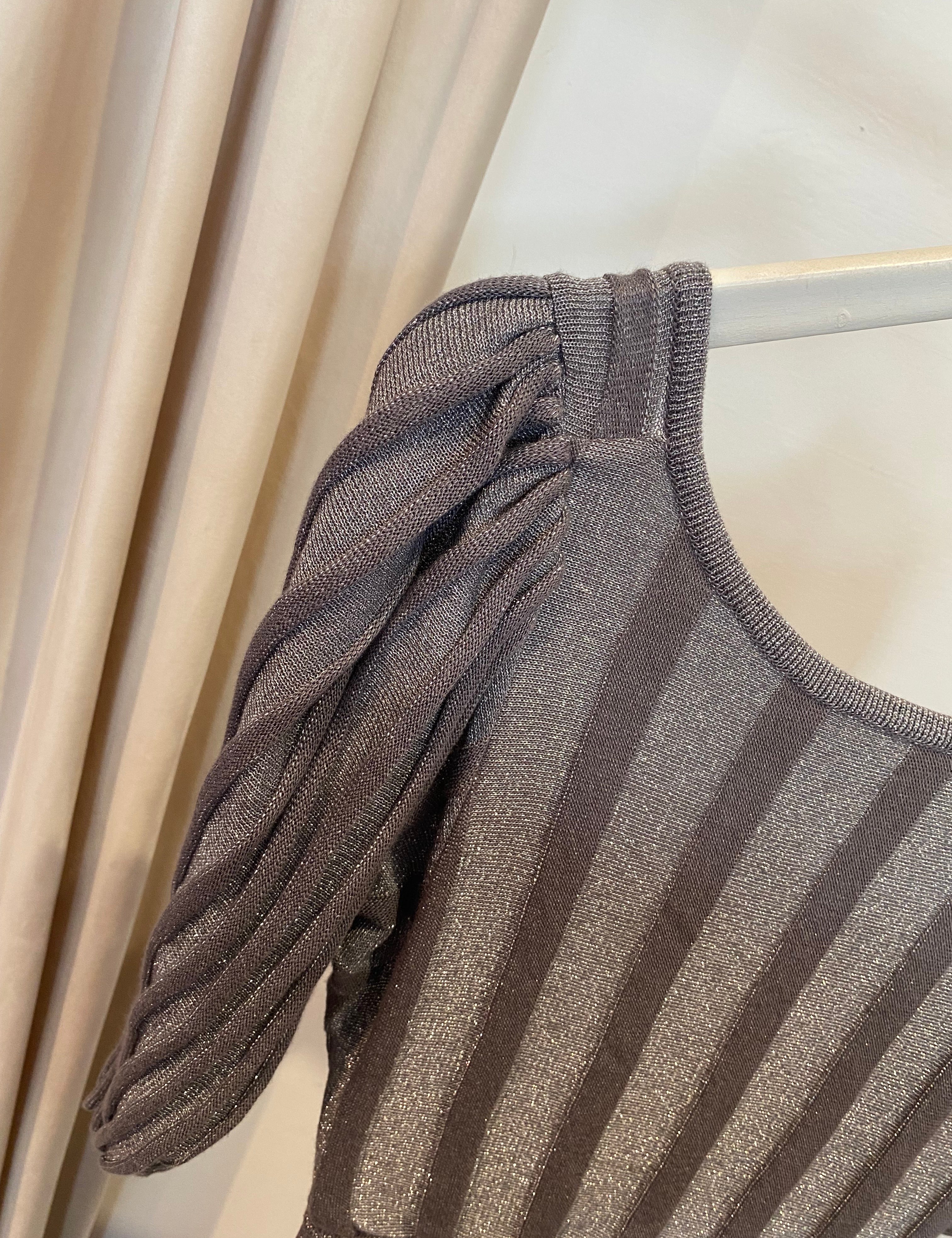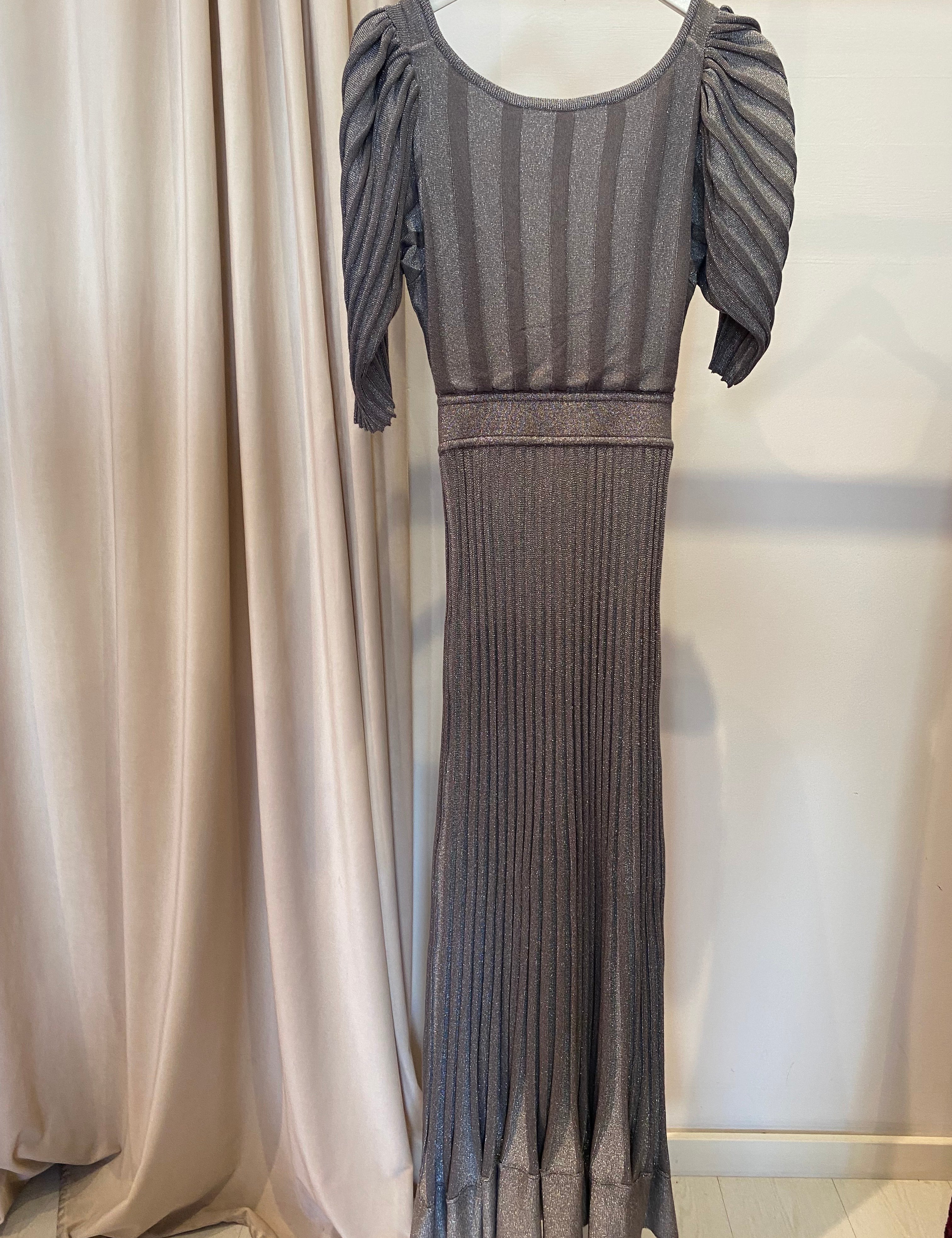 Vestido midi plissado Cecilia Prado em malha lurex prateada