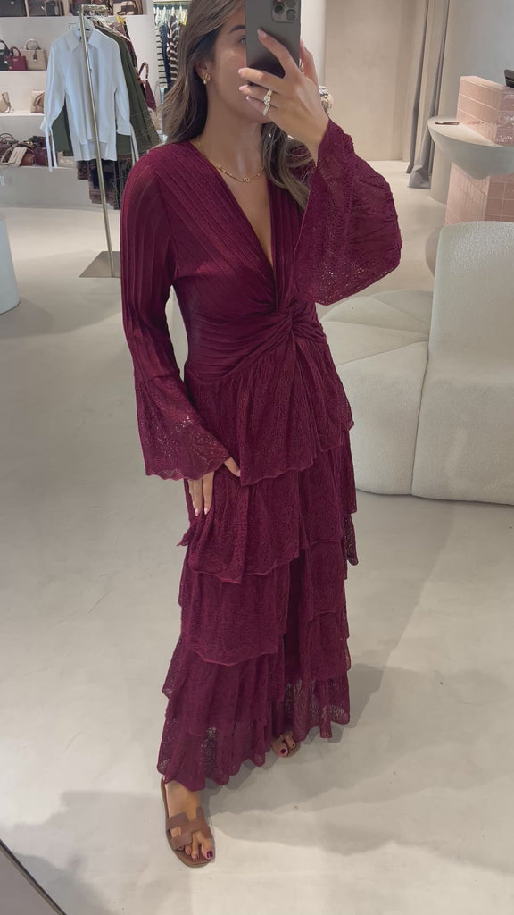 Vestido Comprido de Malha Bordeaux com Folhos | TWINSET