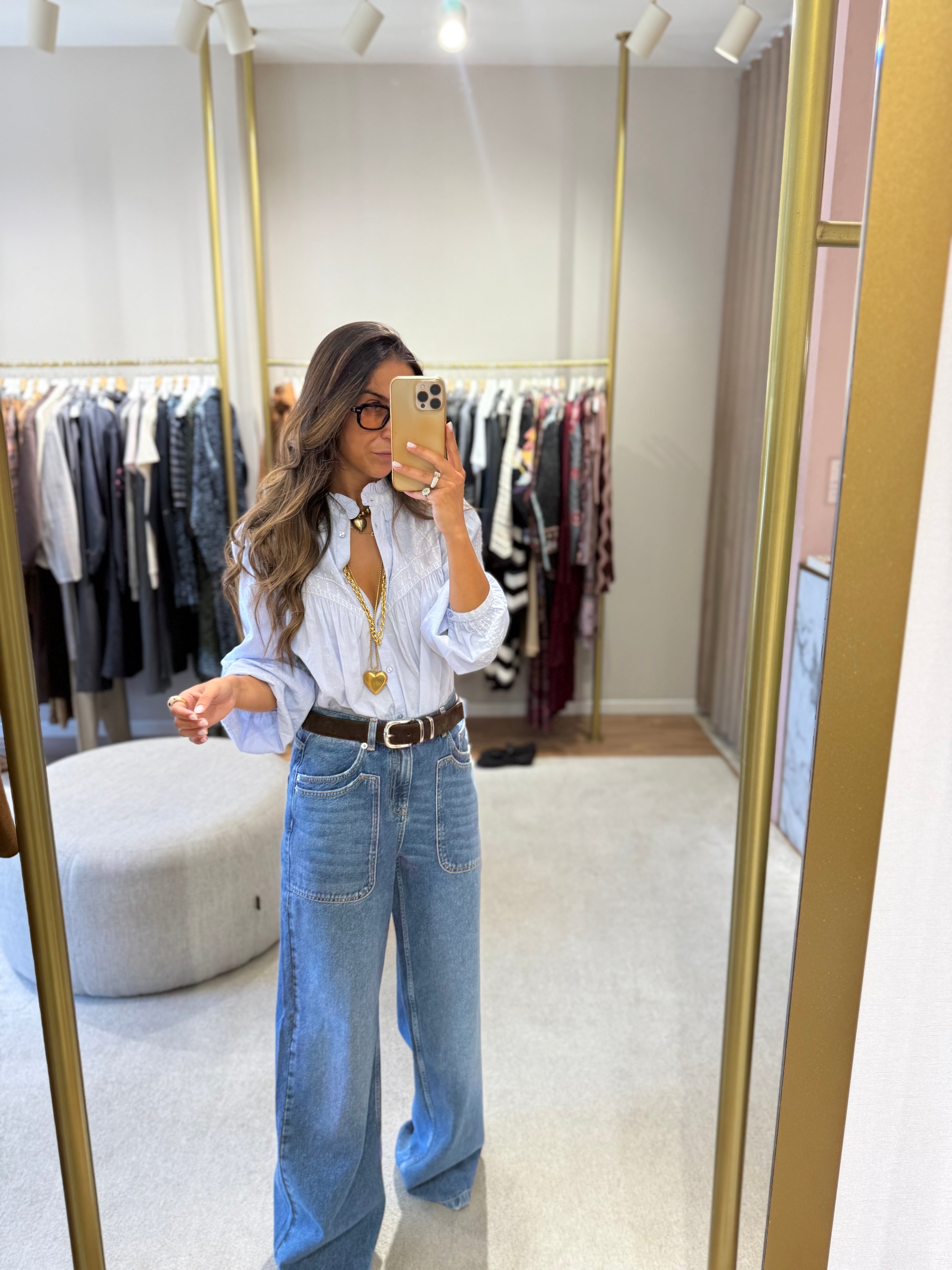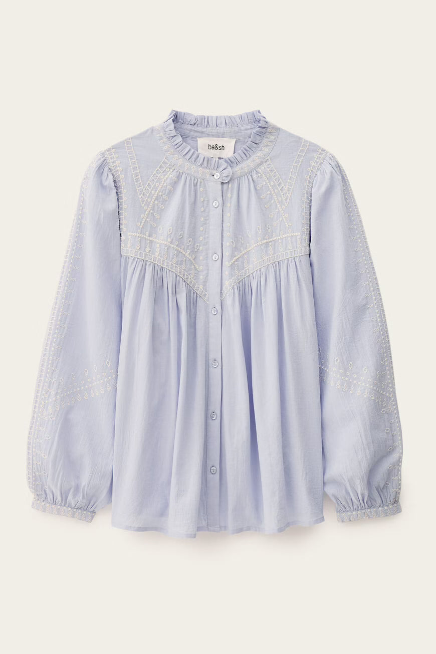A camisa Jaky em tom de azul da ba&sh é a escolha perfeita para quem procura uma peça versátil e sofisticada. Confeccionada em voile de algodão lavado, esta camisa destaca-se pelo seu estilo boémio refinado. O plastrão frontal bordado tom sobre tom adiciona um toque de delicadeza, enquanto as mangas longas com punhos franzidos e botões pérola conferem-lhe um acabamento elegante. A sua silhueta ampla e as pregas discretas garantem conforto e movimento, tornando-a ideal para diversas ocasiões.