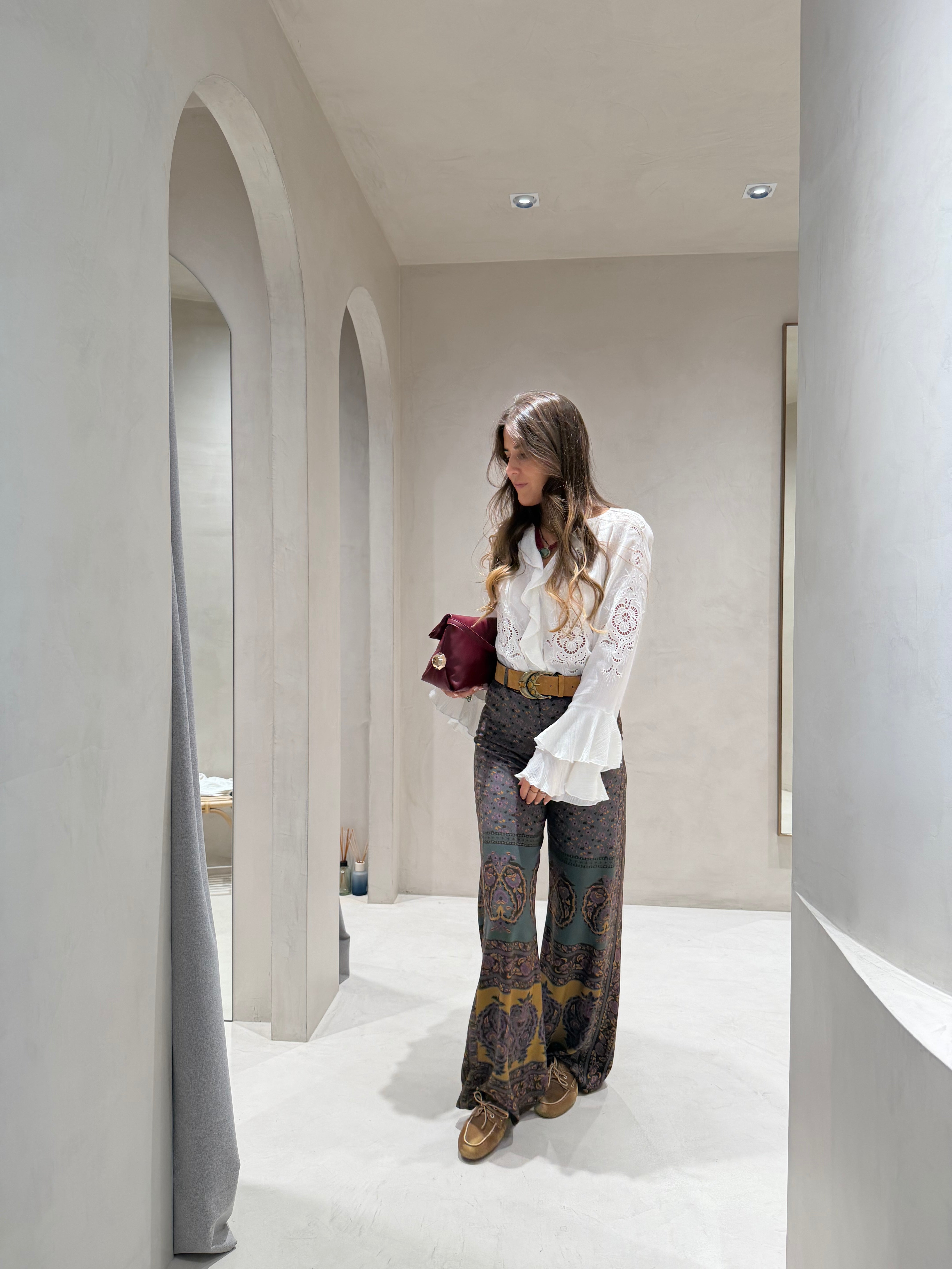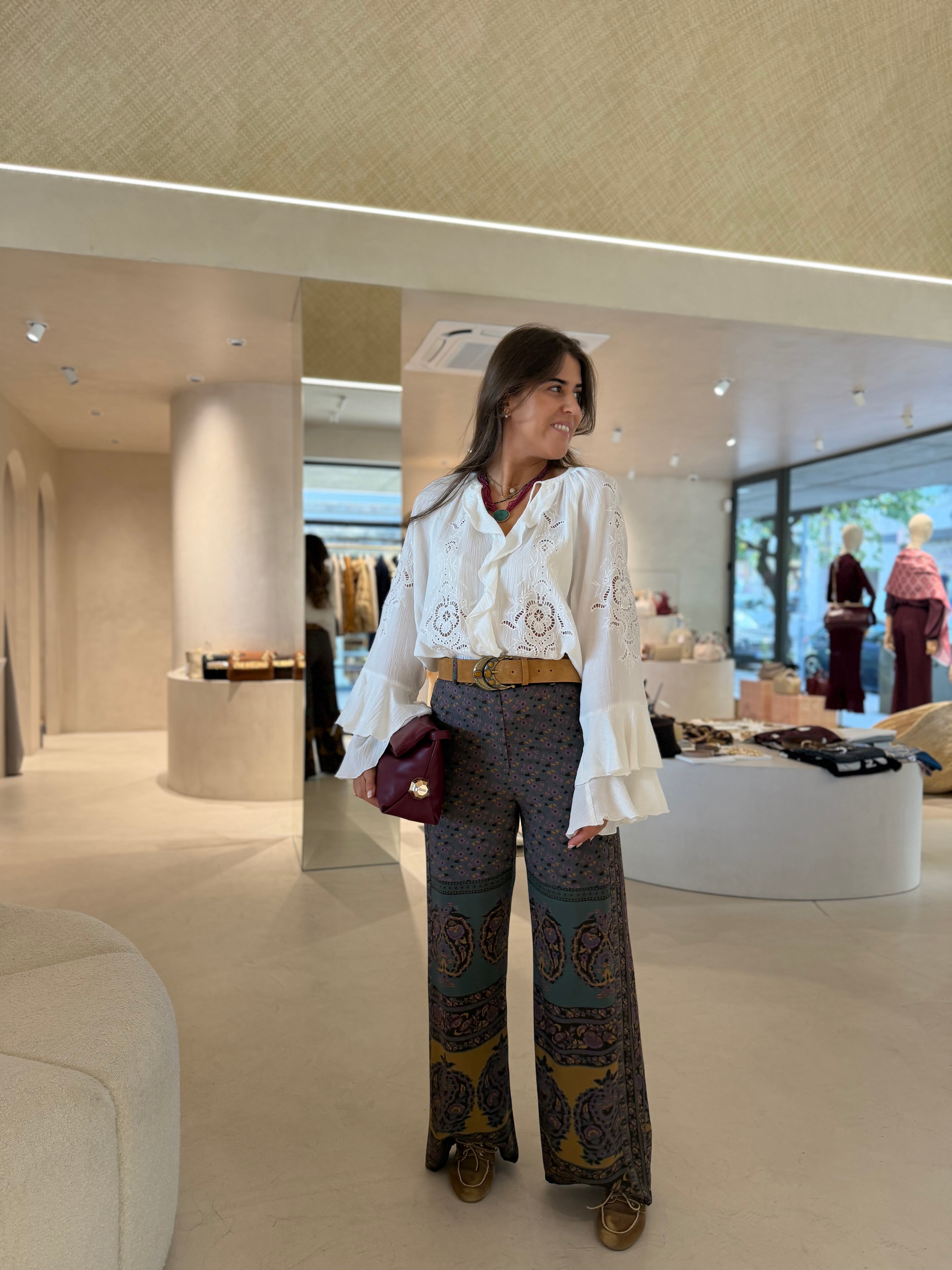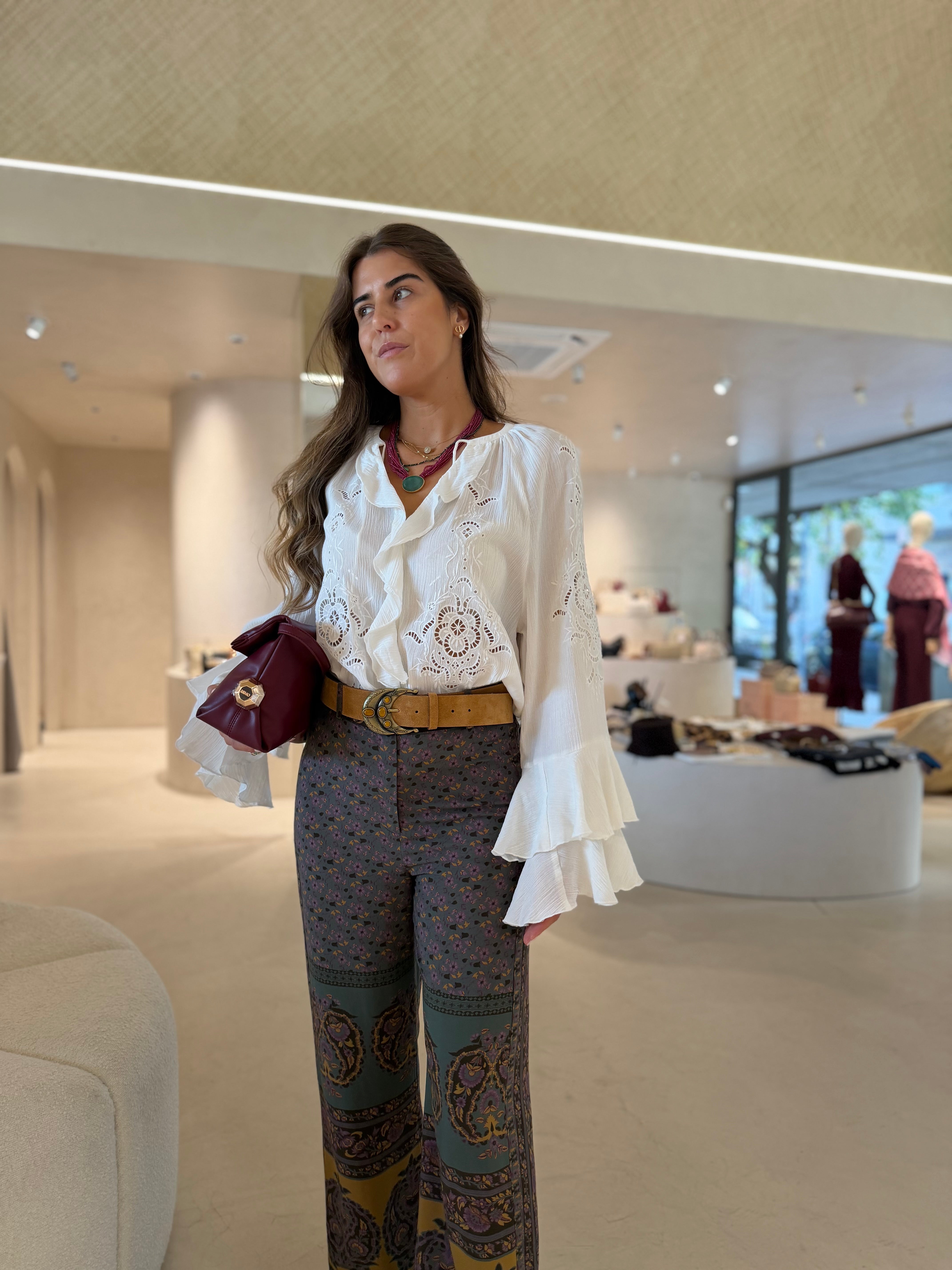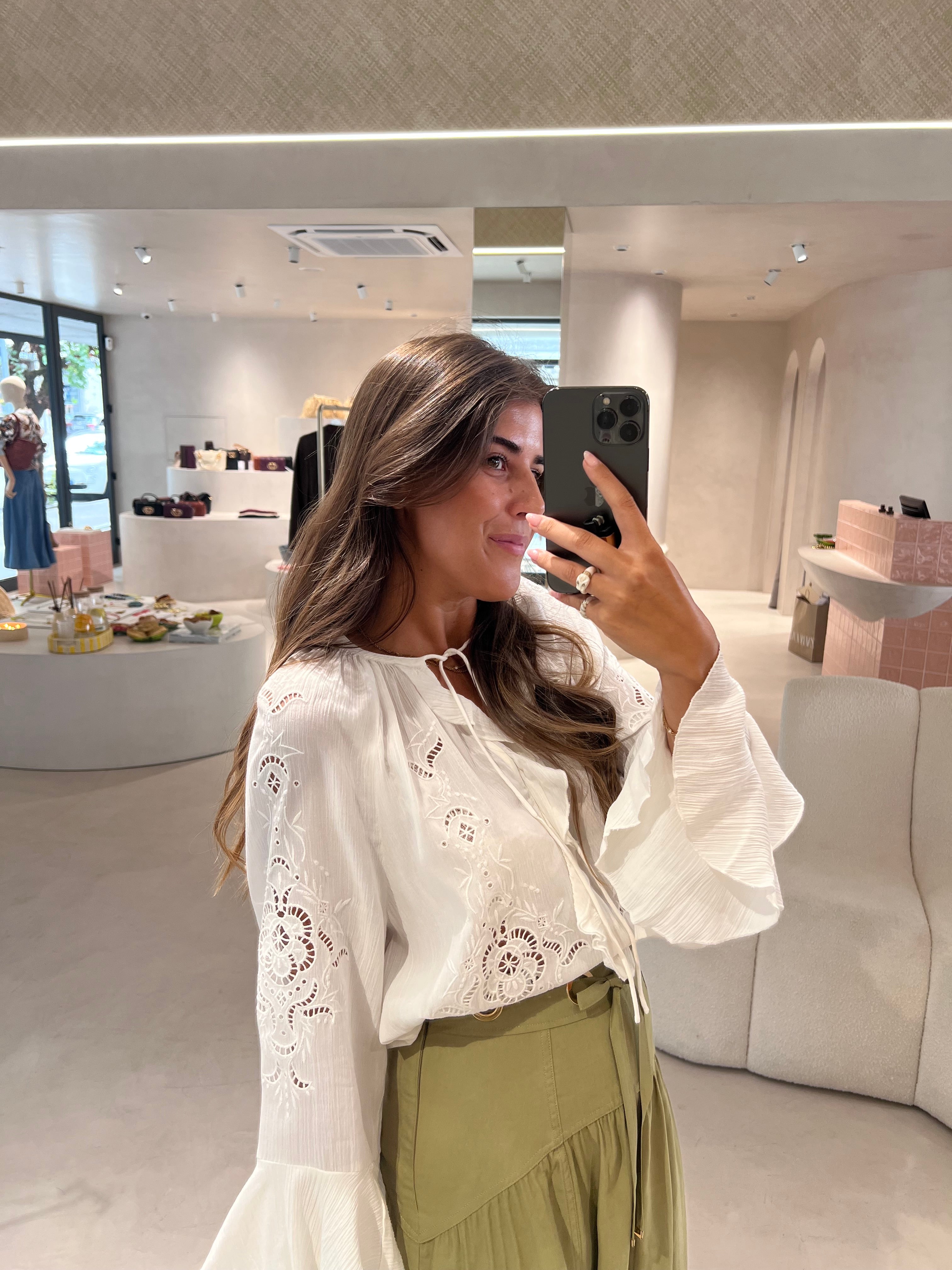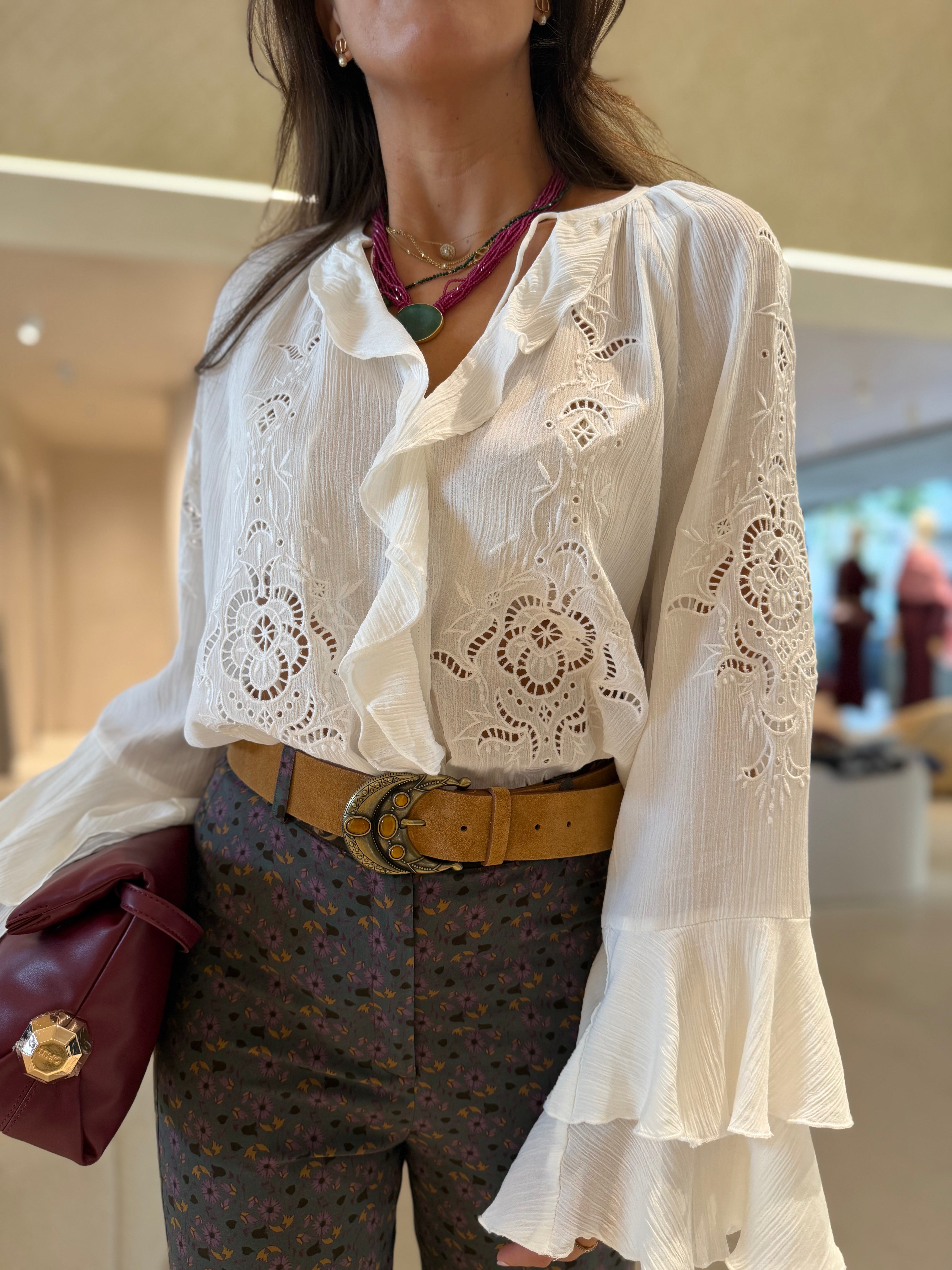 A blusa OMAR da ba&sh é a fusão perfeita entre romantismo moderno e elegância boémia. Com um corte amplo e fluido, esta peça destaca-se pelos delicados folhos, bordado inglês e decote em V com fecho de laço — detalhes que acrescentam um toque leve e feminino, ideal para mulheres com um estilo livre, urbano e sofisticado.