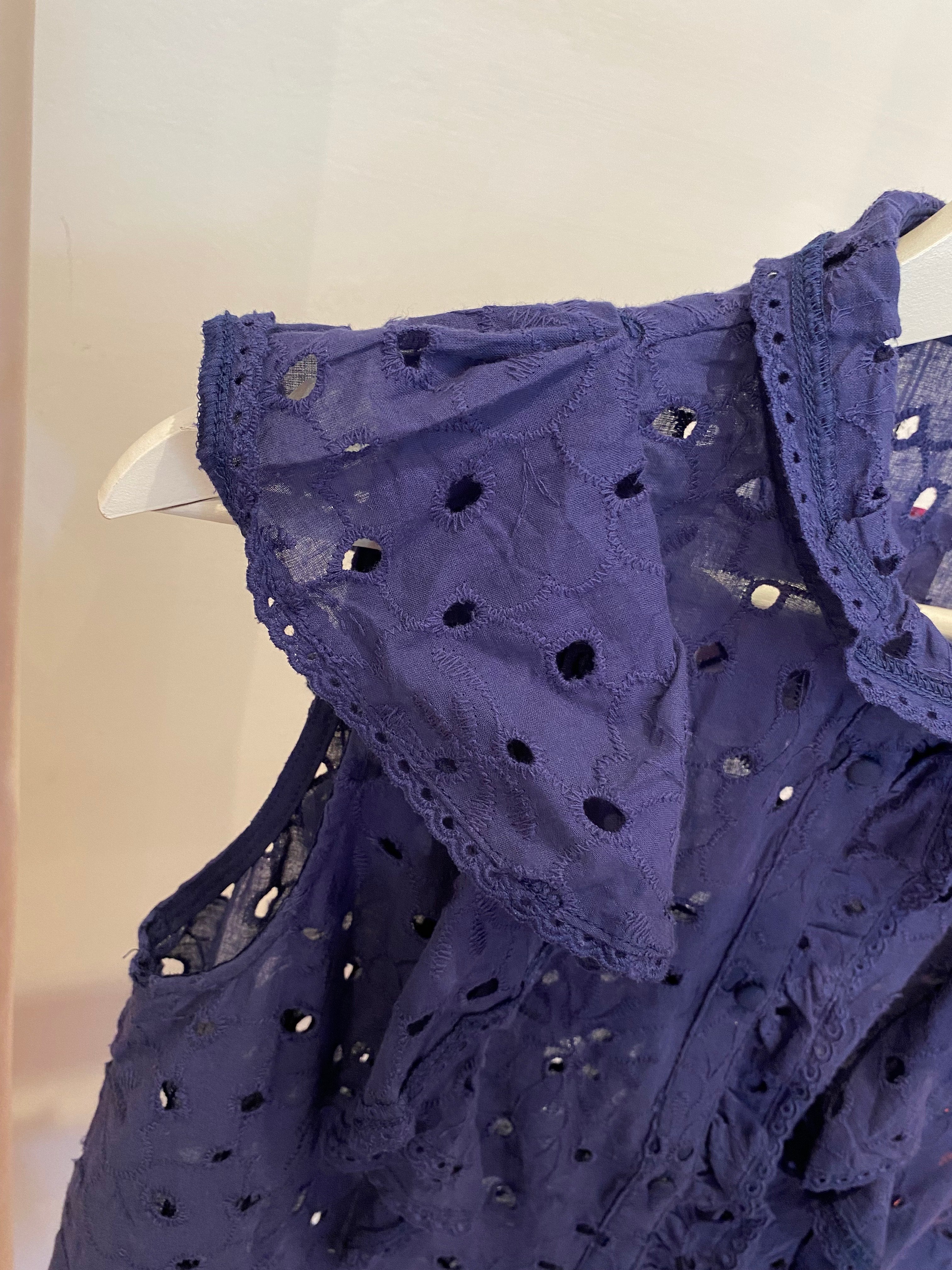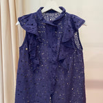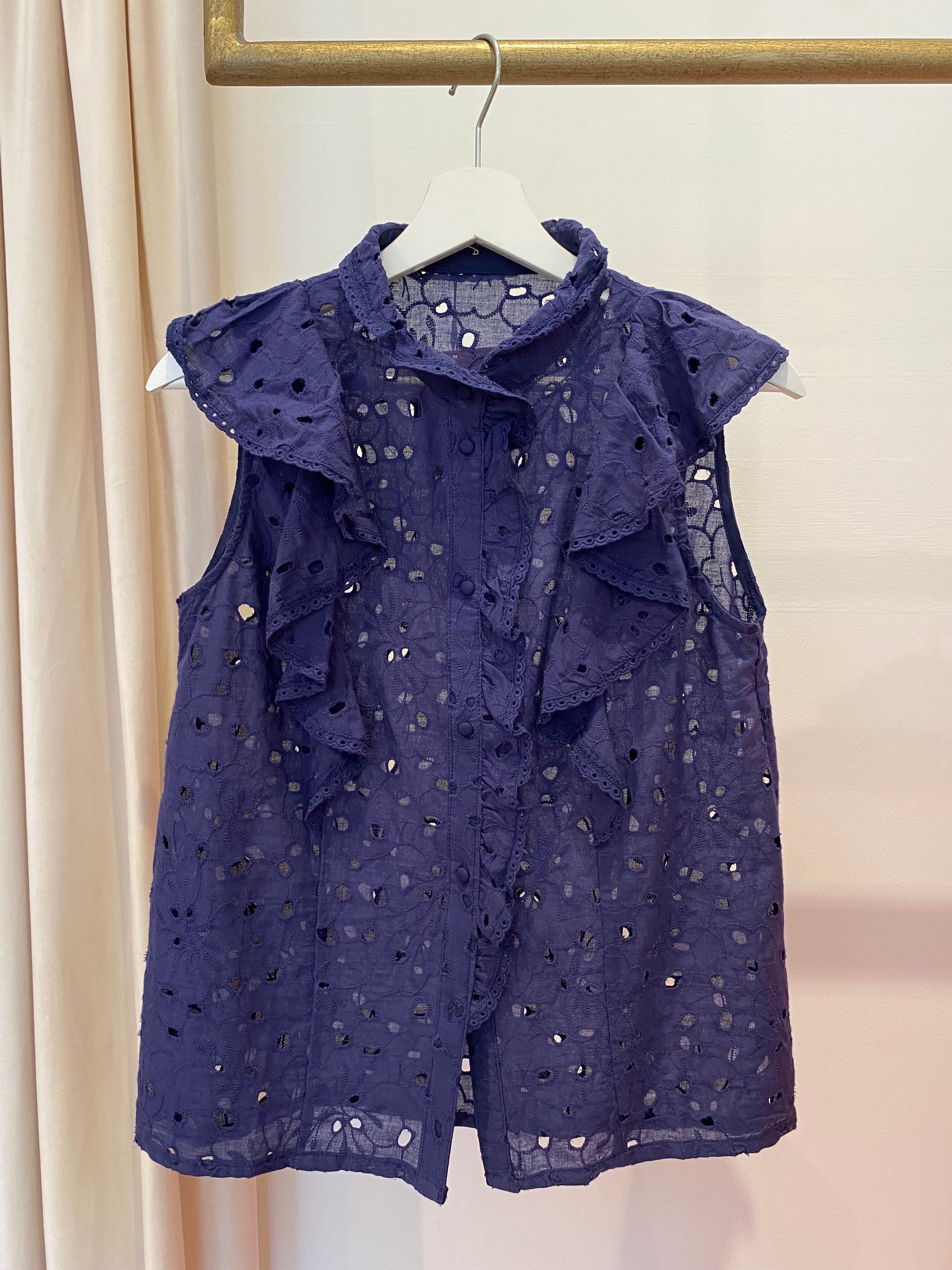 Blusa em azul marinho de manga à cava, botões à frente, com bordados e folhos.