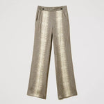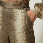 Calça de cetim, com corte de perna larga, com estampa de lagarto, botões decorativos, bolsos laterais e fecho lateral.