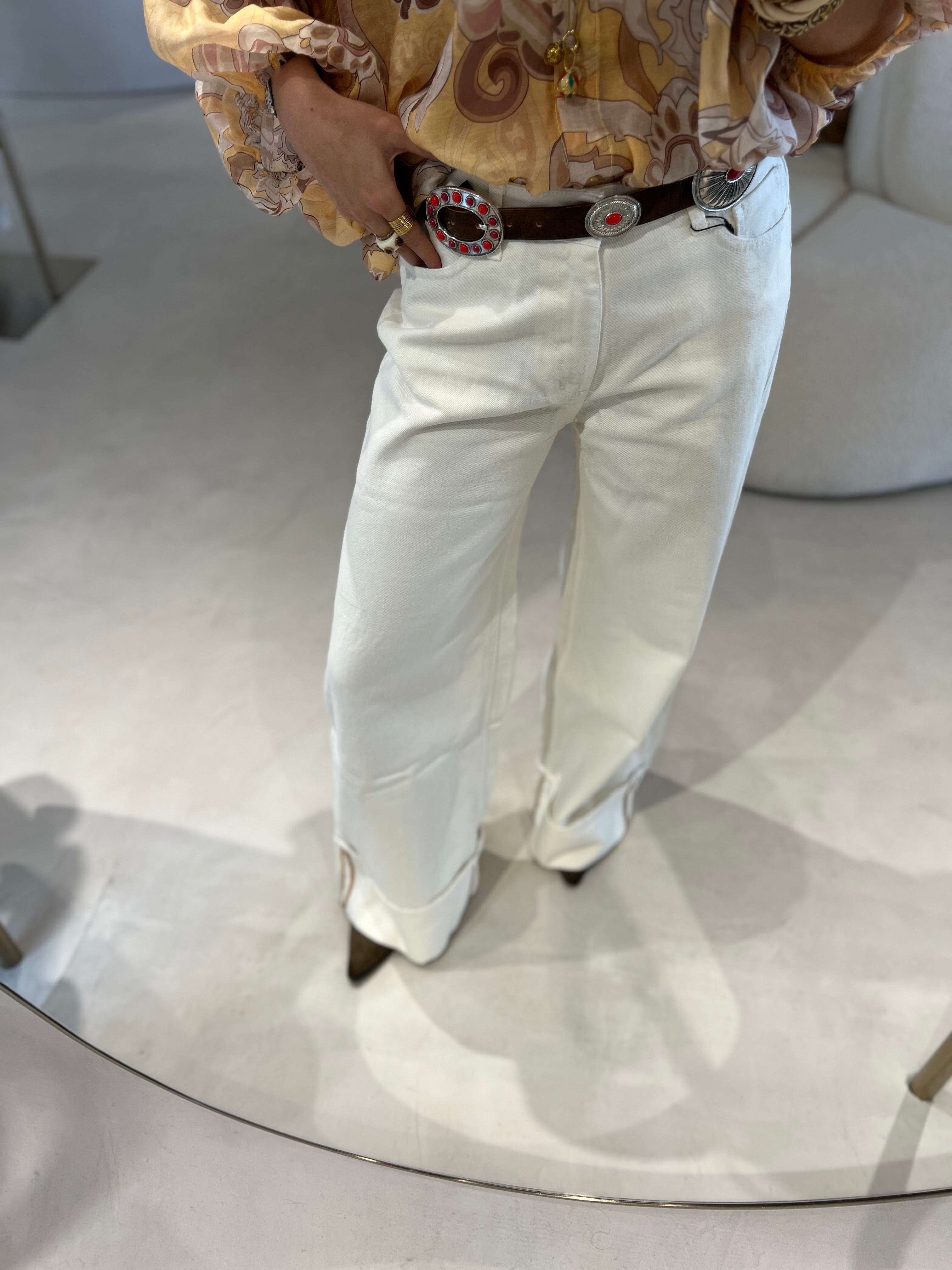 Calças de ganga de cintura subida com 4 bolsos. Perna larga com dobra na bainha.