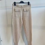 Calça de malha, ajuste justo, tornozelo elástico com acabamento canelado, bolsos frontais, cintura elástica.