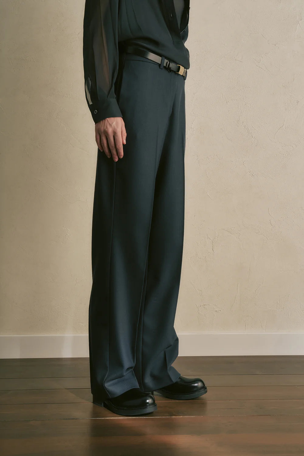O Calça Agaria da Semicouture é a definição de sofisticação quotidiana. Confeccionado em flanela de lã com um toque de elastano, apresenta uma cintura assimétrica com passantes e pregas frontais que conferem estrutura e fluidez. O corte regular e o comprimento até ao tornozelo tornam-no versátil, ideal para looks formais ou coordenados mais descontraídos. Fabricado em Itália, é uma peça chave para quem valoriza qualidade e estilo.