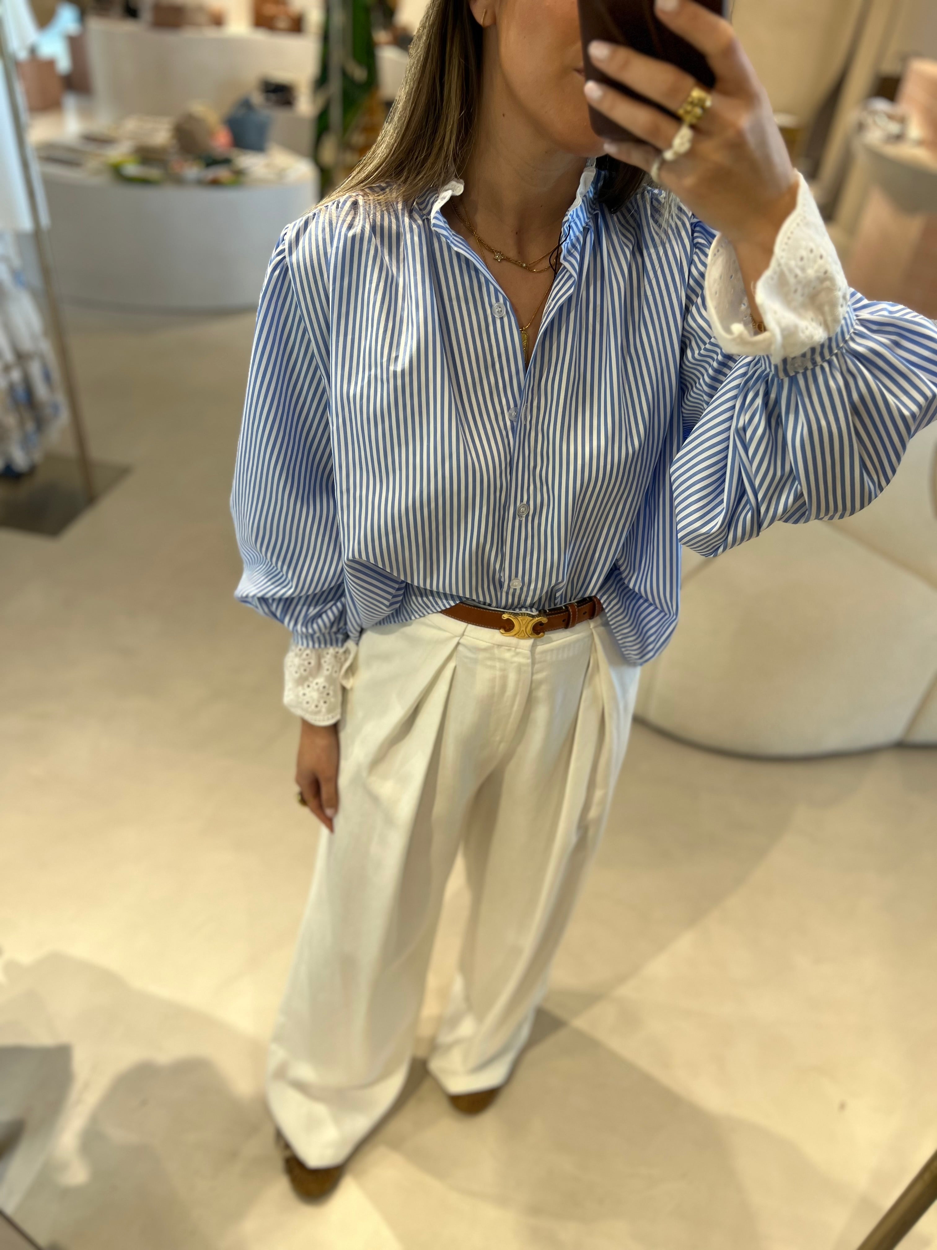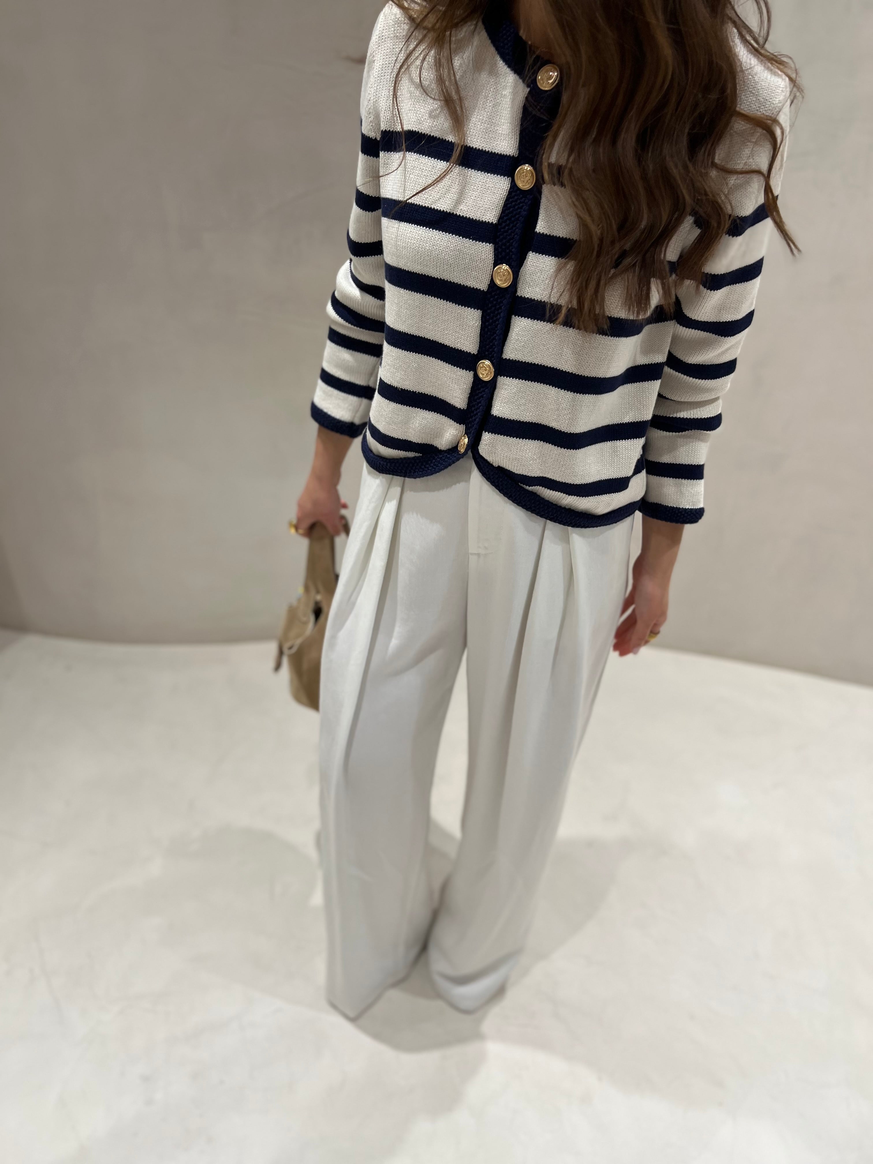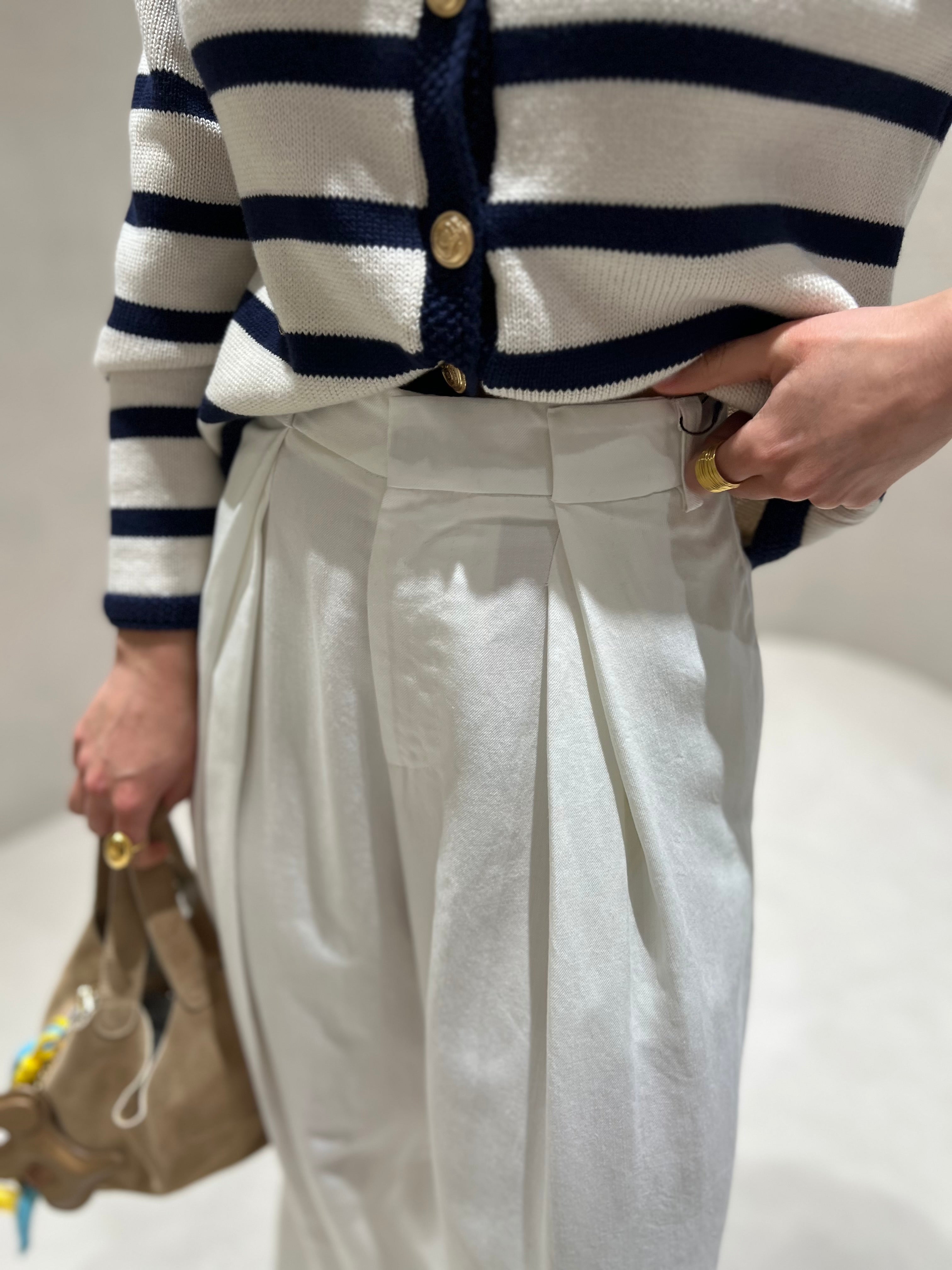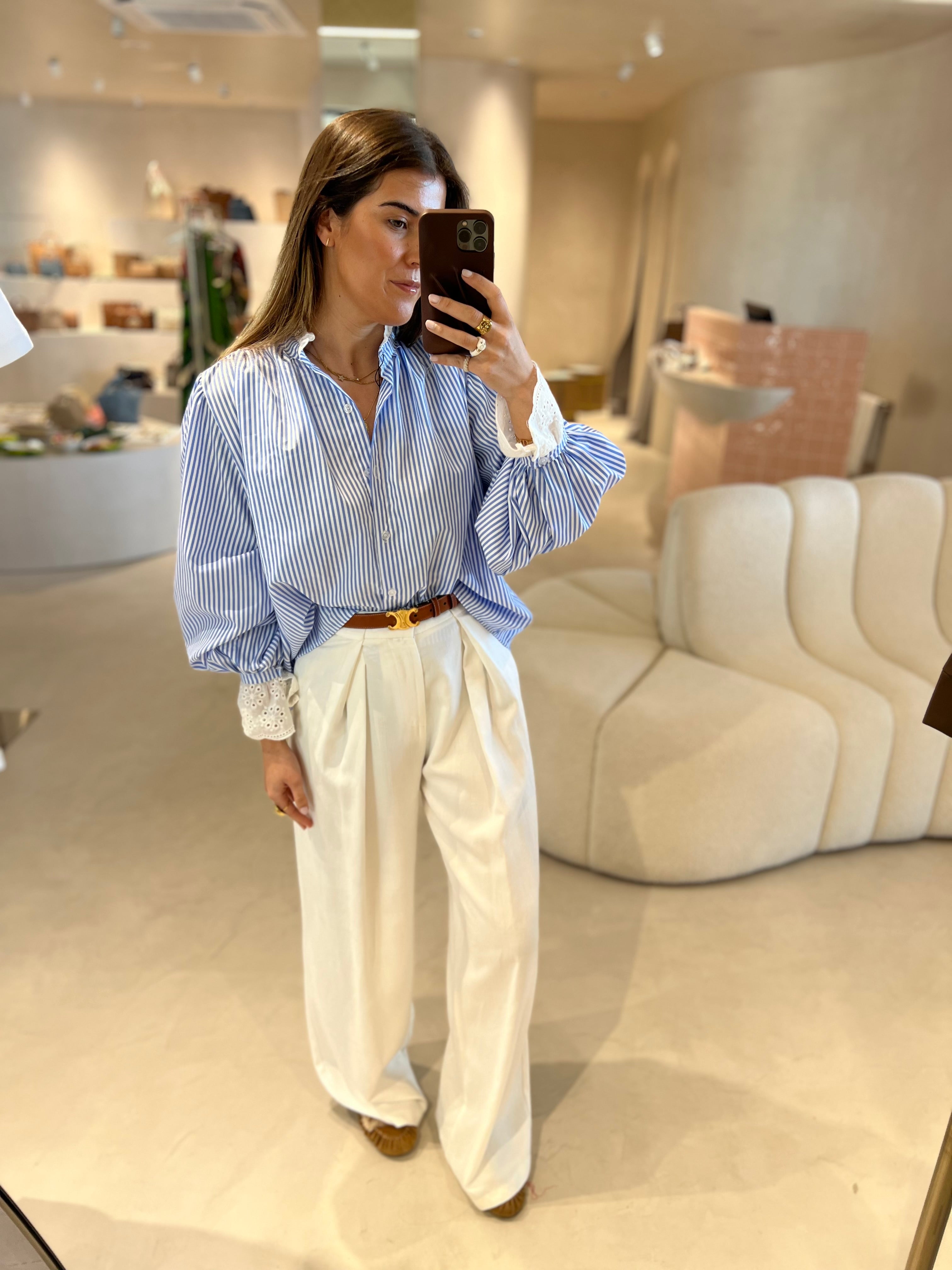 Calça de cintura subida, fecho de correr e botão, bolsos e pregas nas laterais.