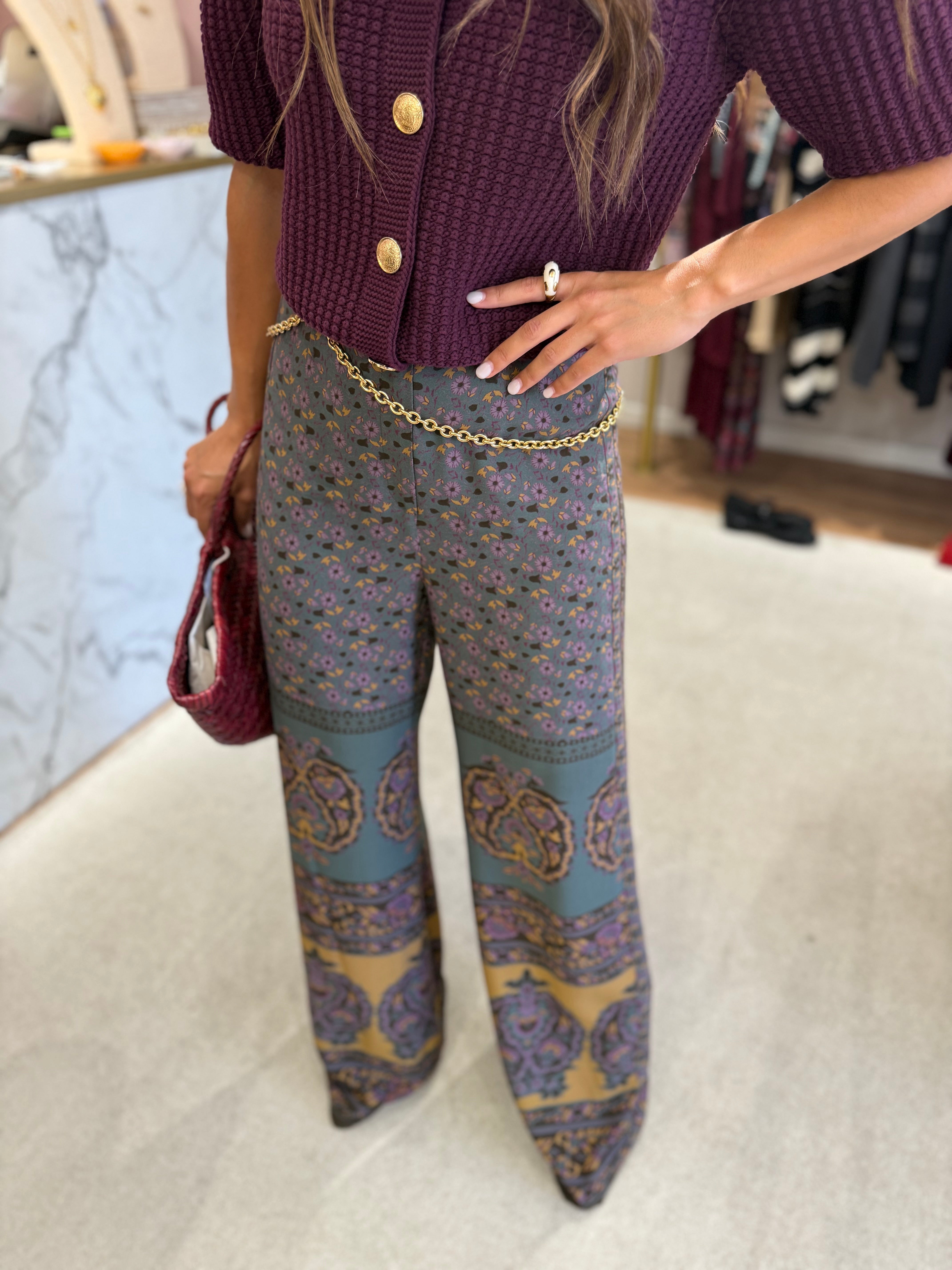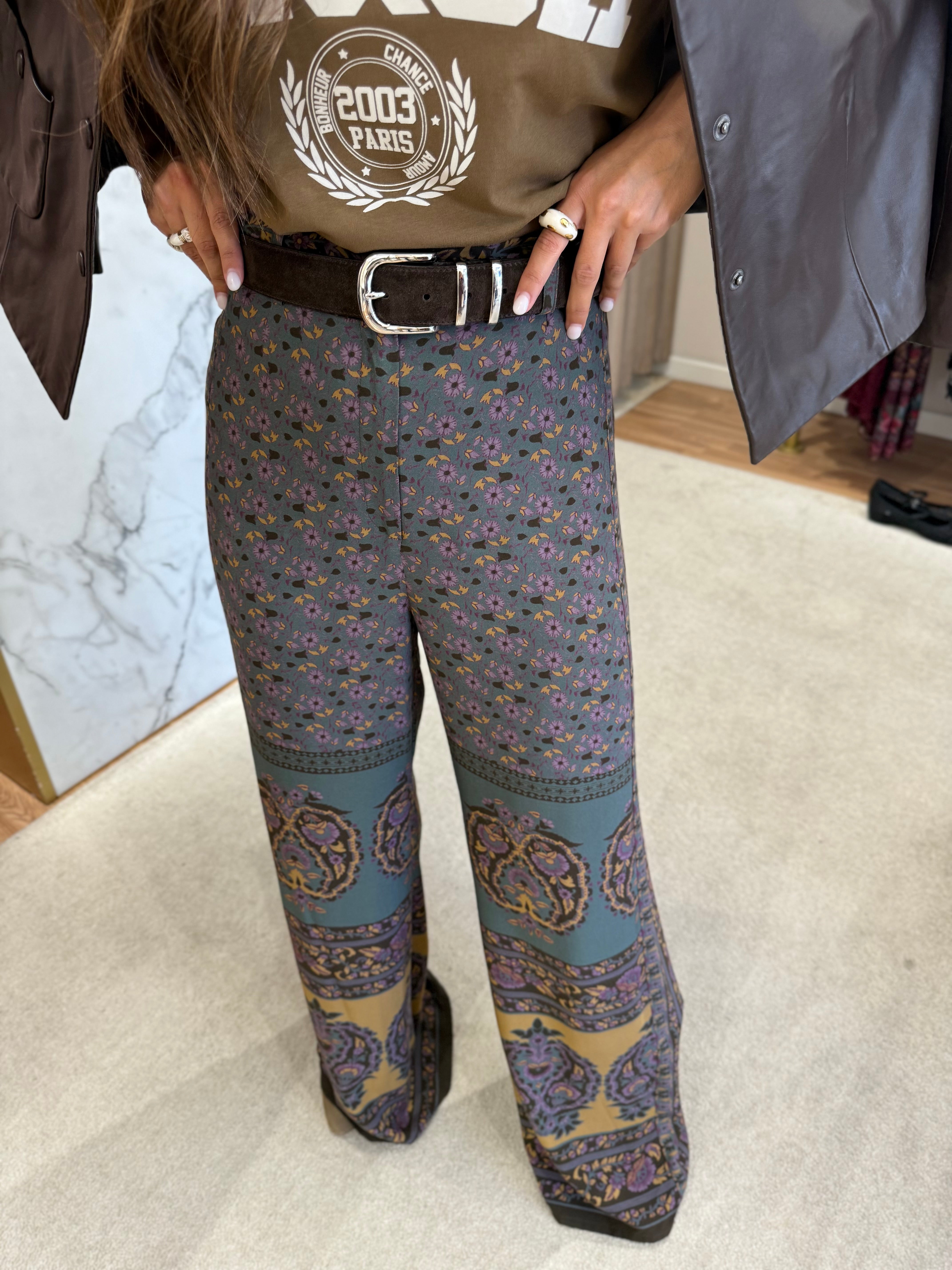 Descobre a elegância relaxada dos calças Brany, concebidas para se tornarem peça-chave nos teus coordenados contemporâneos. O tecido suave molda-se ao corpo com natural leveza, criando um caimento fluido que realça qualquer silhueta. Com cintura subida e corte fluido, estas calças oferecem conforto sem sacrificar a presença. O padrão geométrico discreto acrescenta profundidade ao visual, enquanto a silhueta ampla traz um toque de modernidade e movimento.