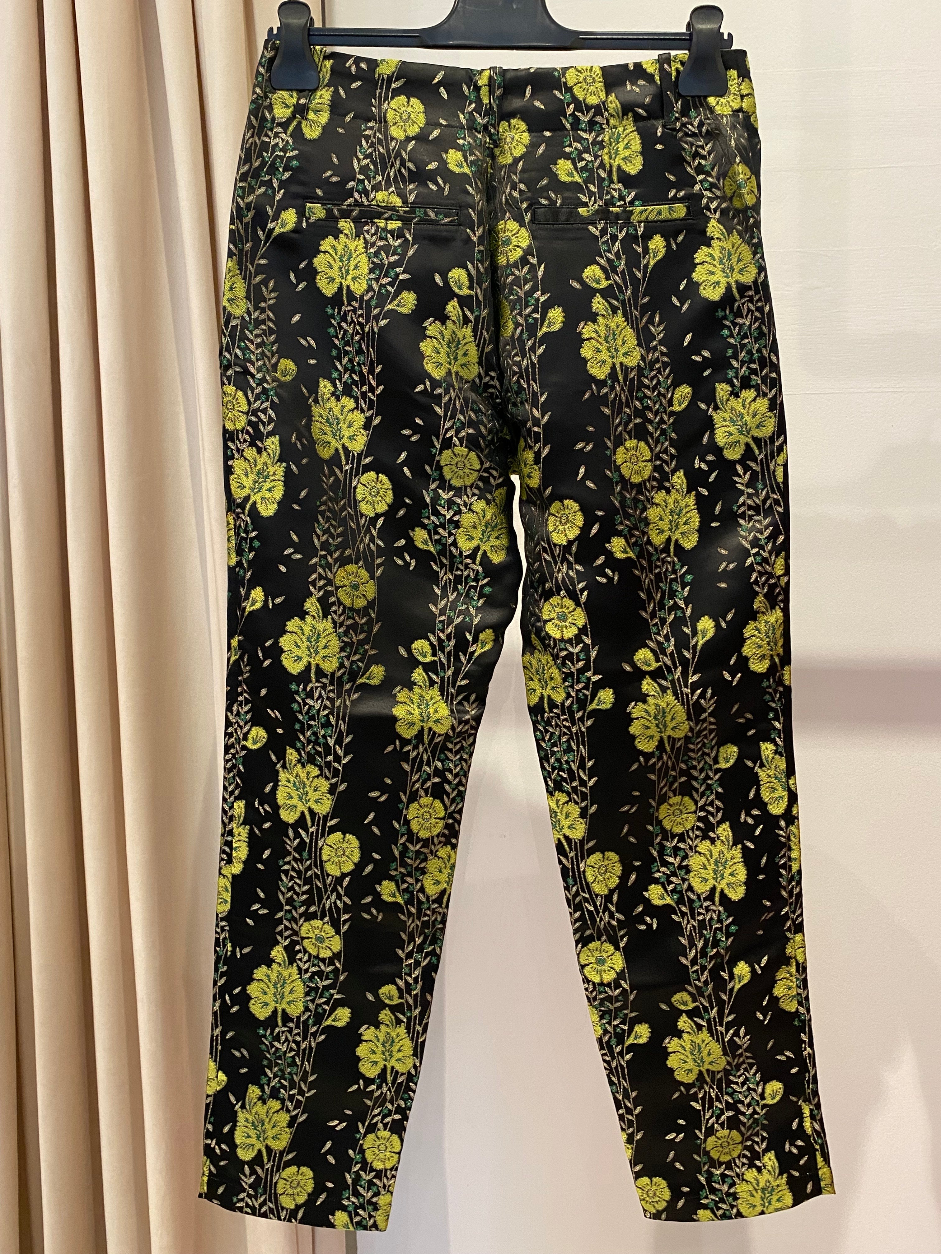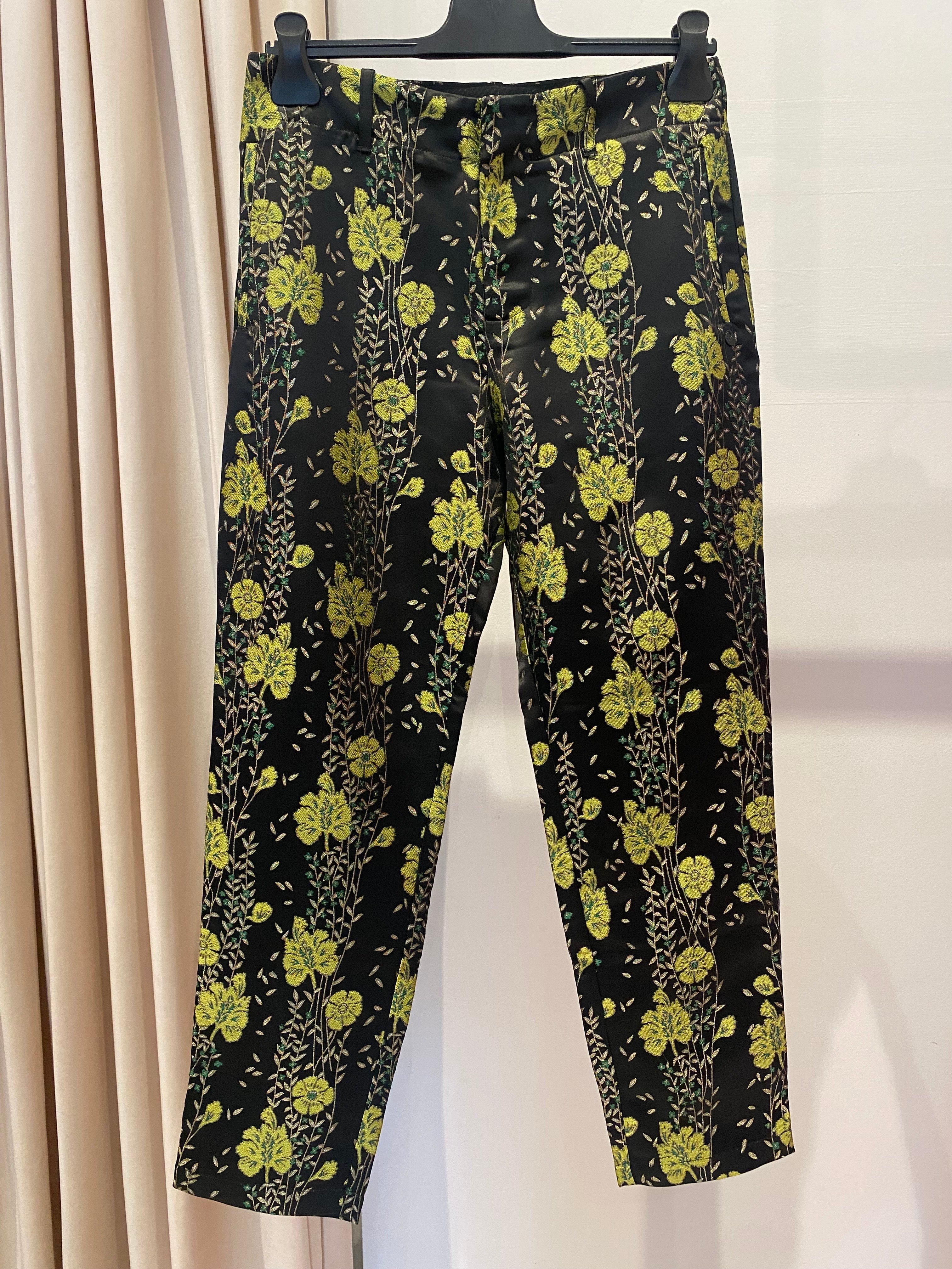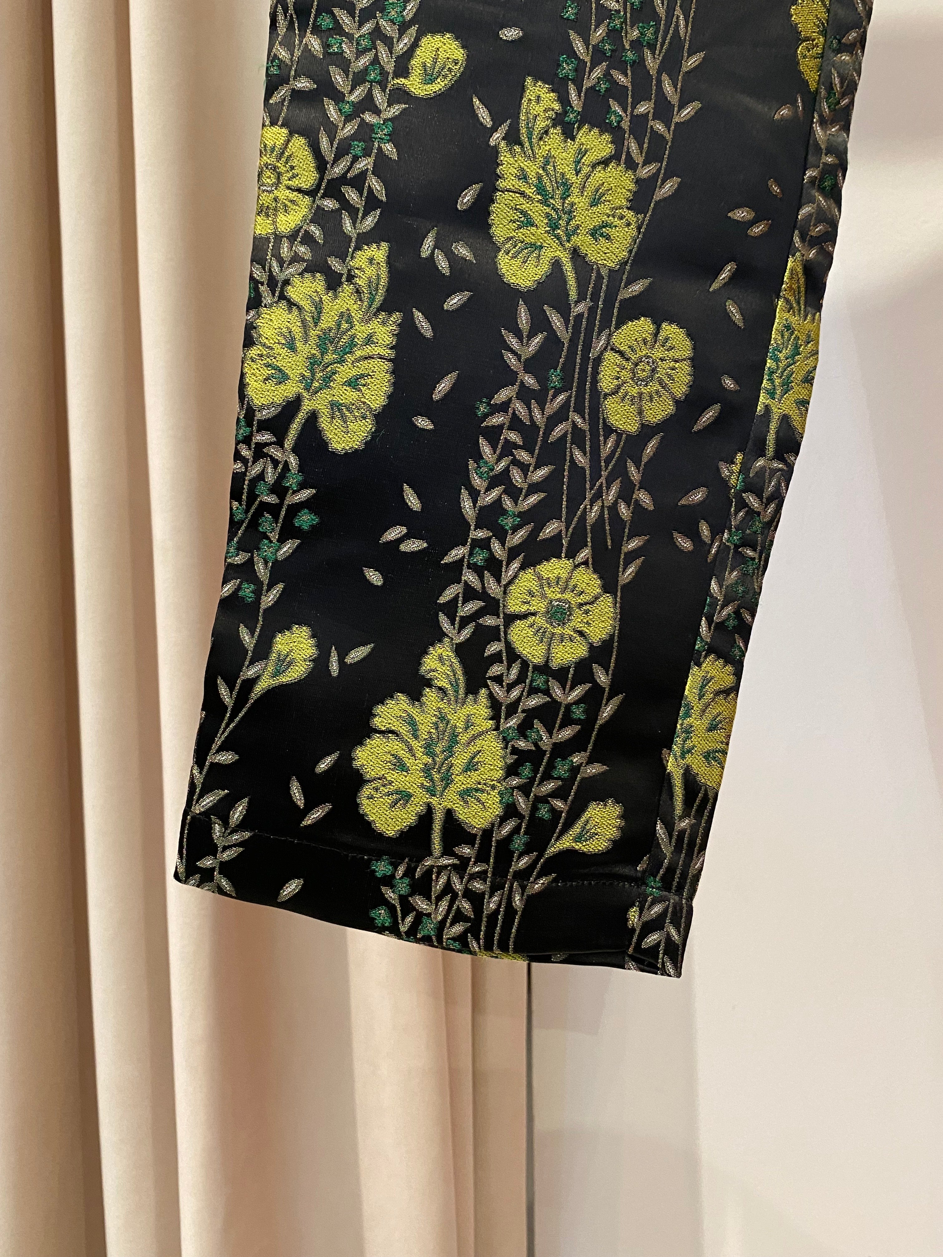 Calças SCOTCH&SODA de cetim com bordados de folhas e flores em verde. Dois bolsos à frente e dois bolsos falsos atrás.