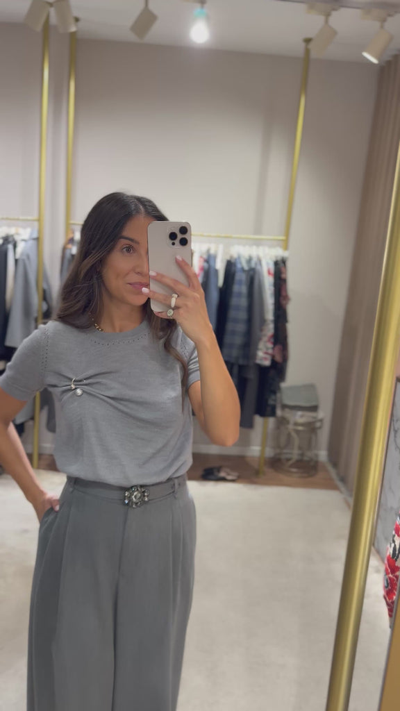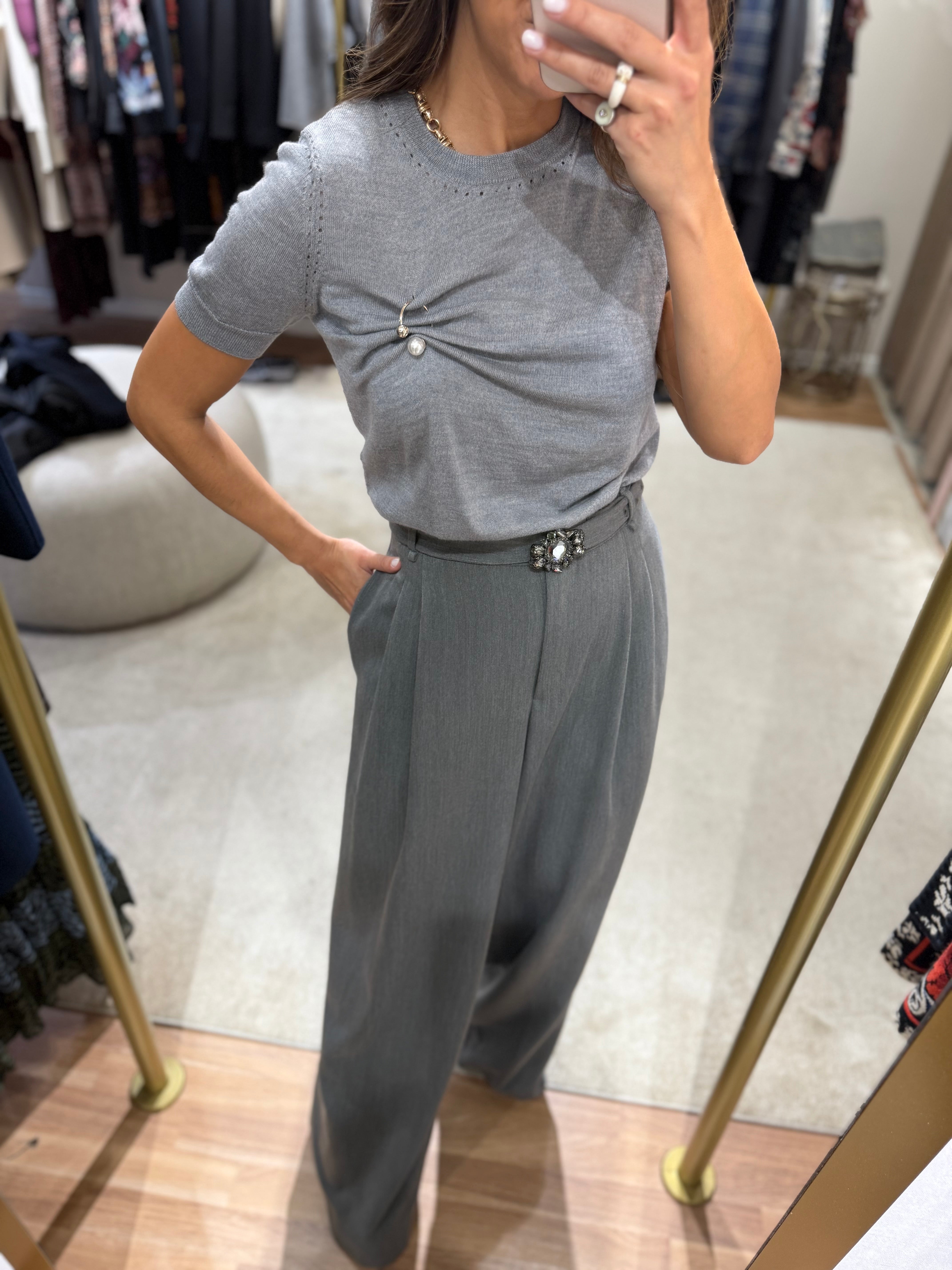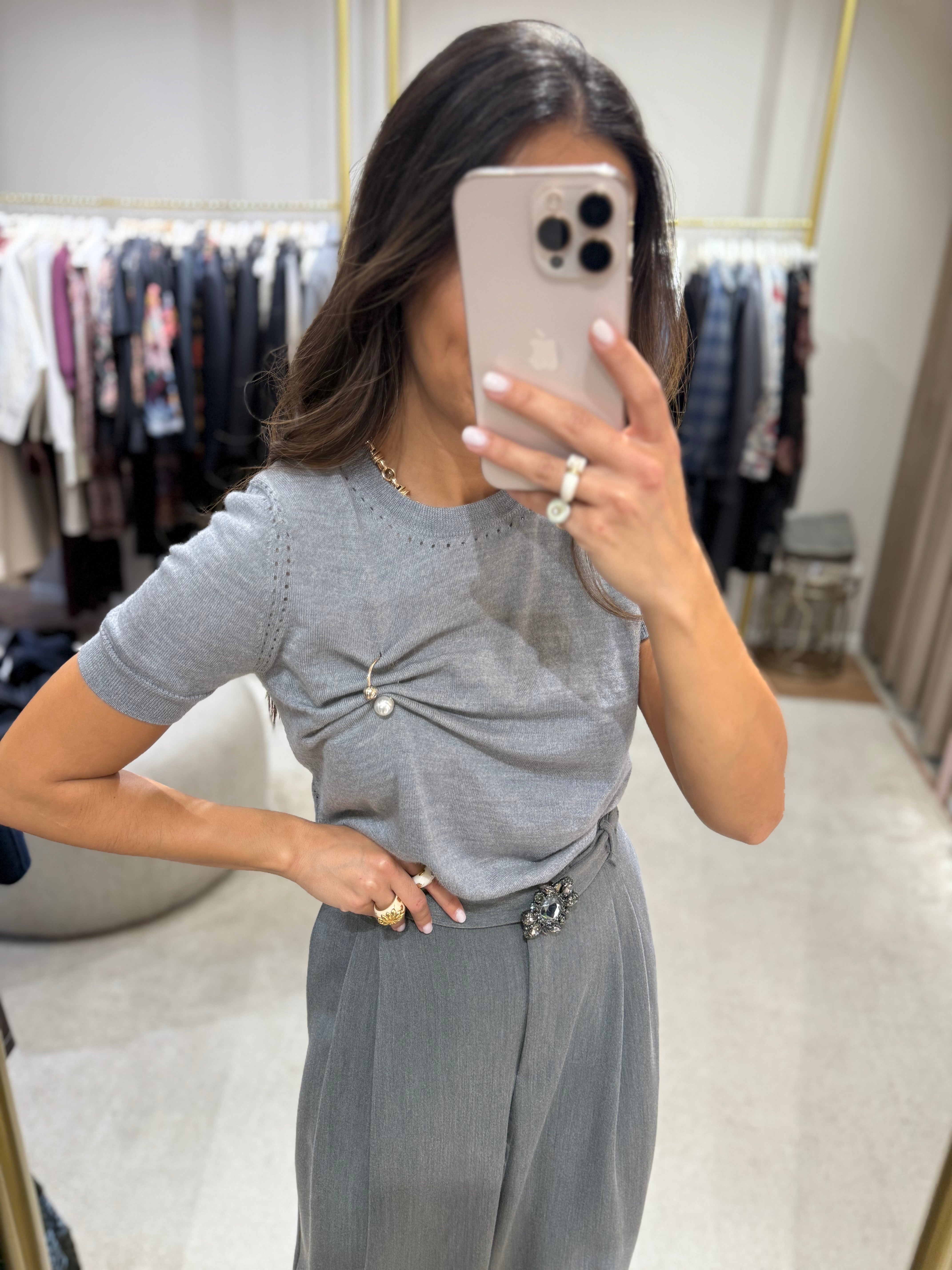 Sweater de gola redonda em mistura de lã, na elegante tonalidade cinza. Com corte clássico e textura versátil, com detalhe metálico com uma pérola no peito, é peça chave para looks sofisticados e confortáveis em estações mais frescas.