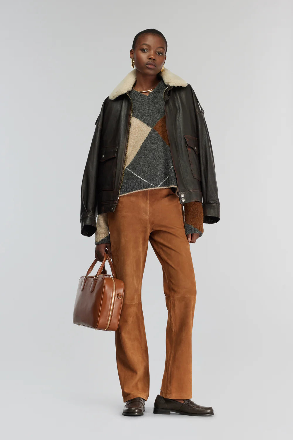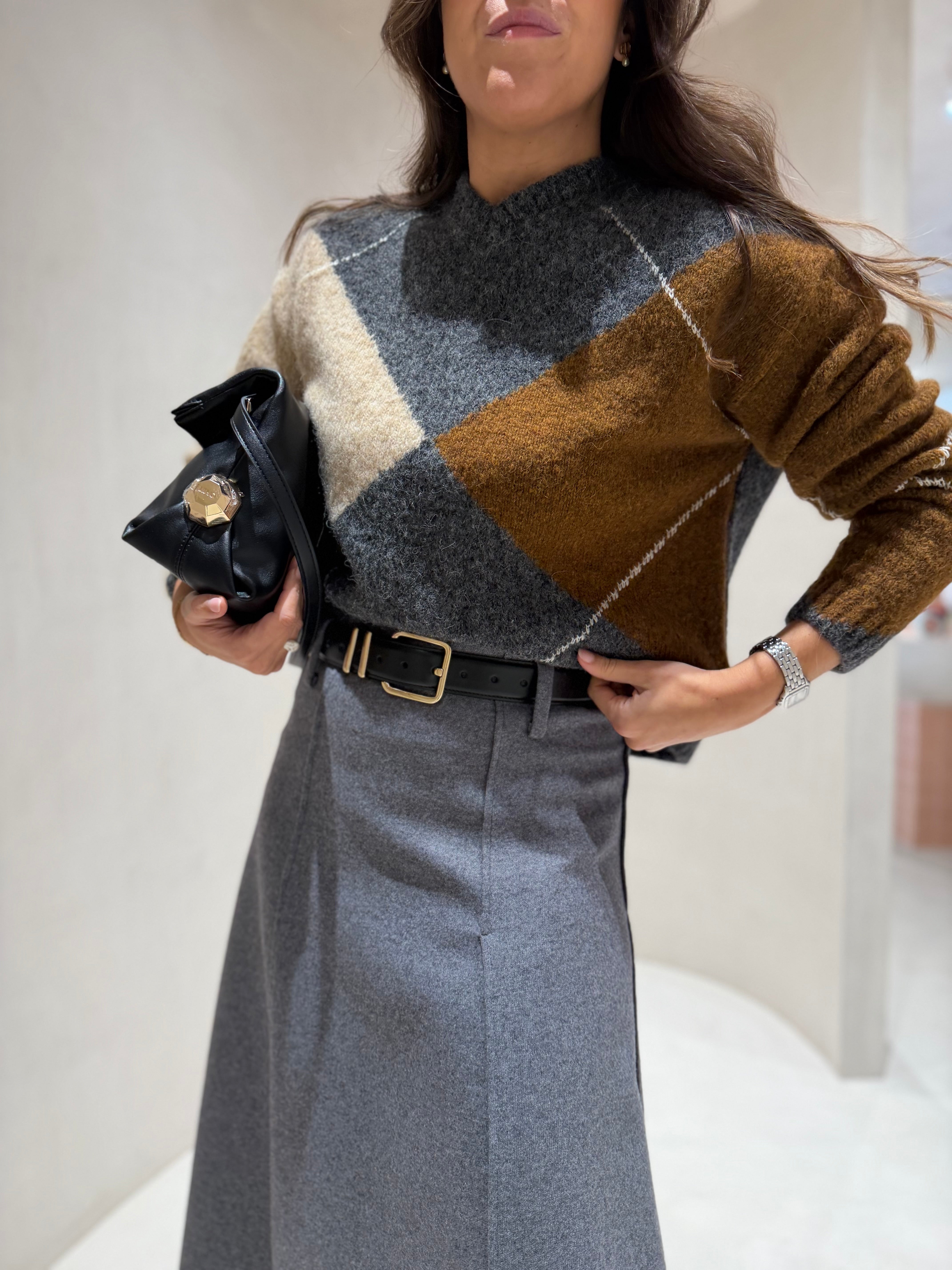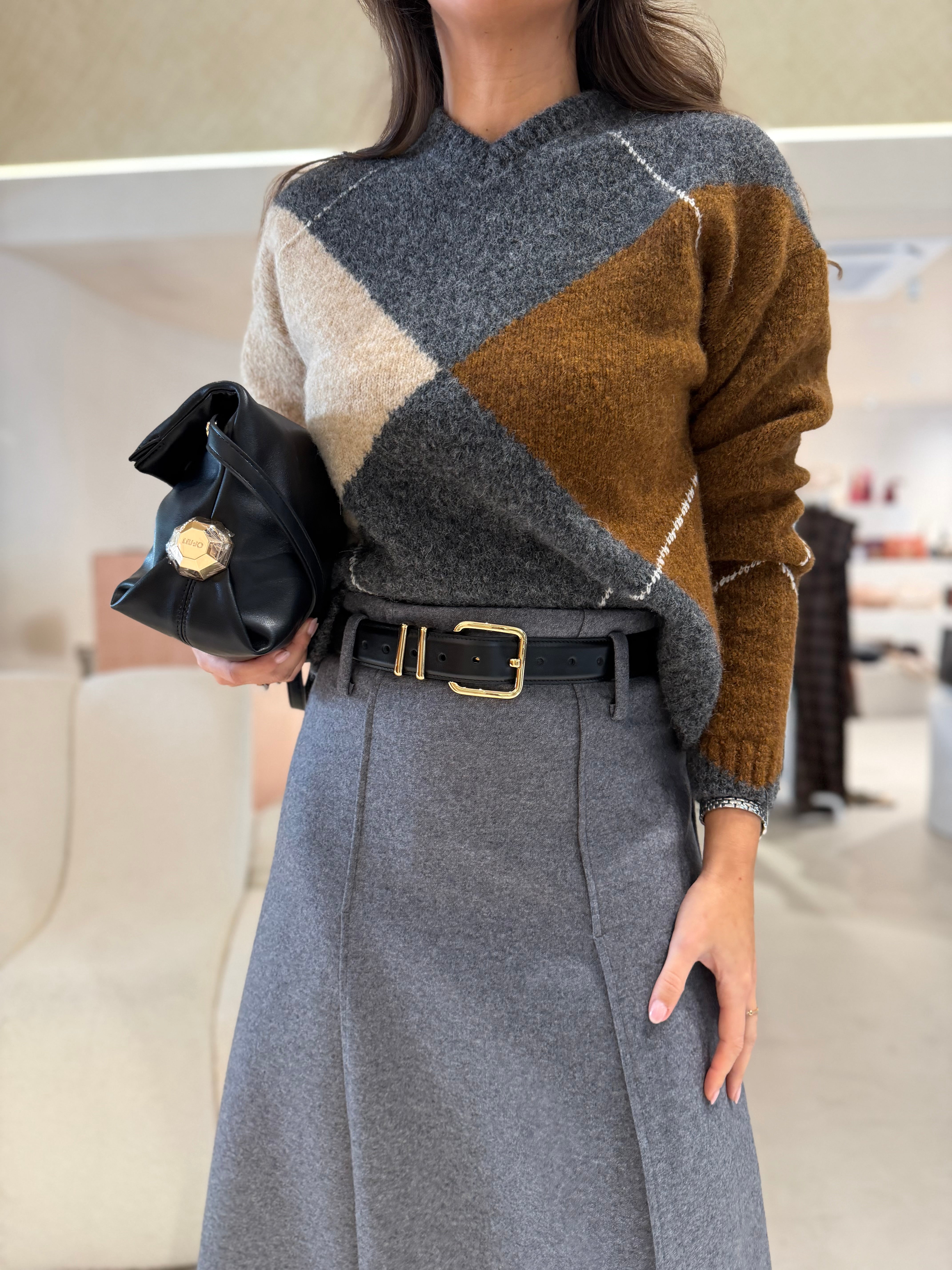 A camisola Gaston da Semicouture é uma peça statement que alia conforto e estilo. Confeccionada numa mistura de alpaca, lã, poliamida e poliéster, apresenta um corte oversized com padrão diamante, decote em V e mangas longas. O comprimento à anca e a fluidez do tecido conferem-lhe um ar sofisticado e moderno, tornando-a ideal para looks casuais ou coordenados mais sofisticados. Fabricada em Itália, é uma escolha elegante e versátil para o dia a dia.