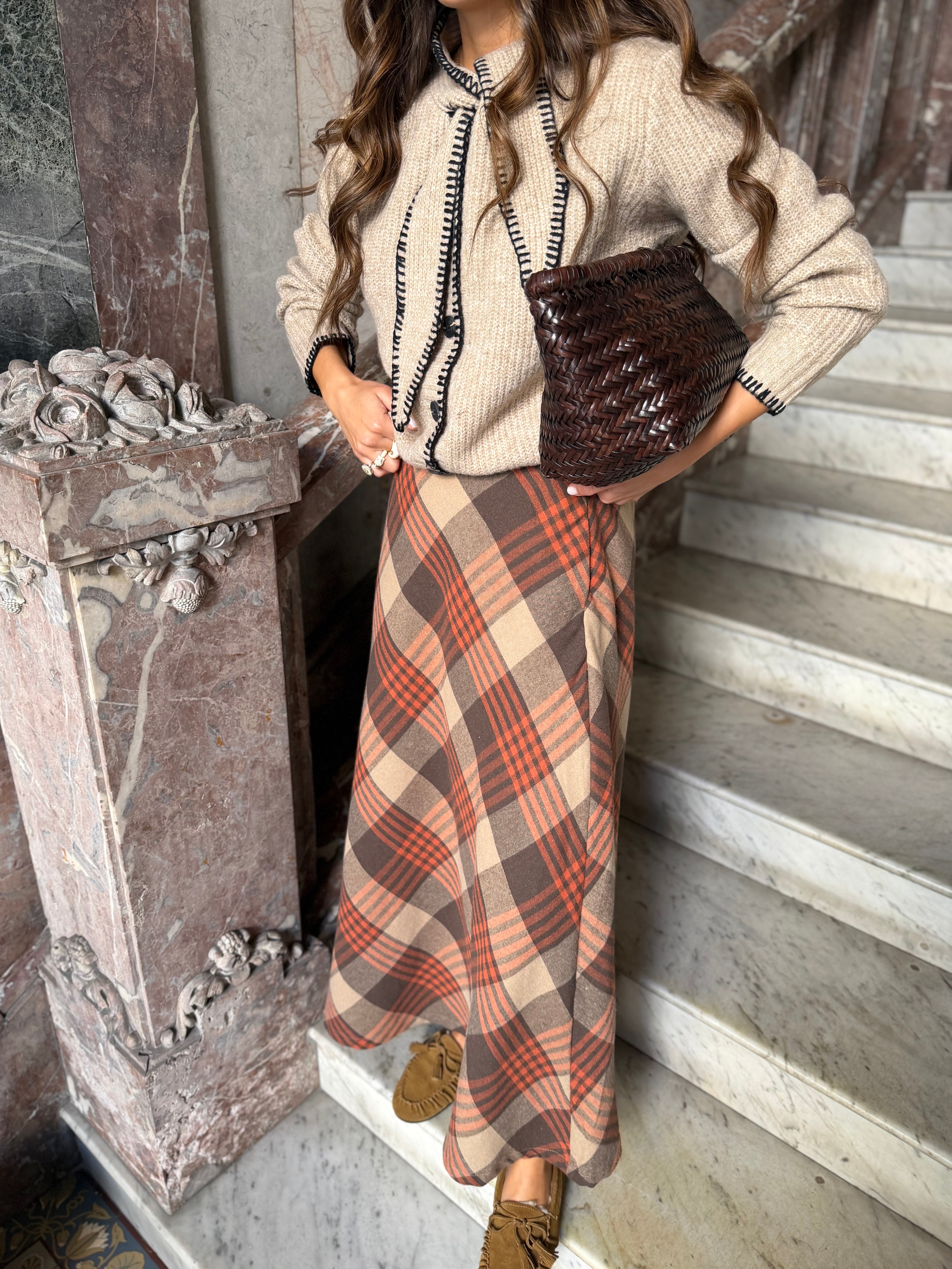 Este cardigan de malha combina charme e feminilidade com um design delicado e confortável. Tem um colarinho tipo mandarim (alto), laço frontal que confere um toque romântico, e ribagens contrastantes em branco que realçam os detalhes. As mangas longas tornam-no perfeito para usar nos dias mais frescos, seja para um look casual ou no trabalho.