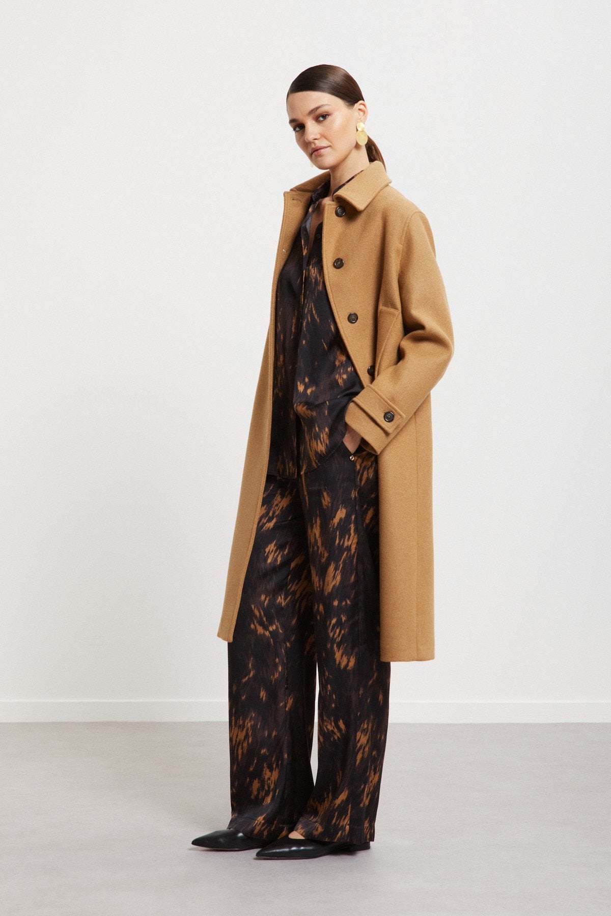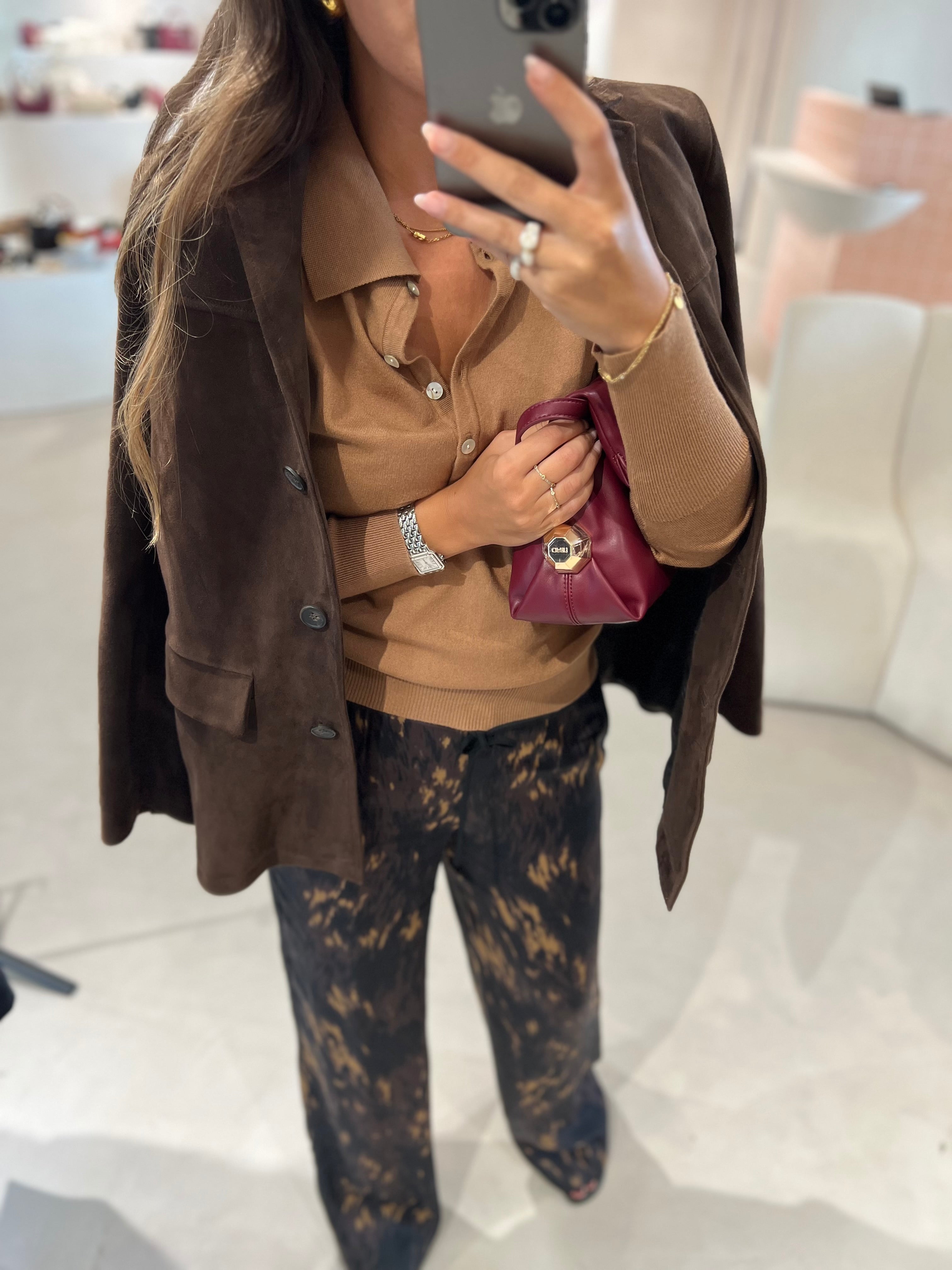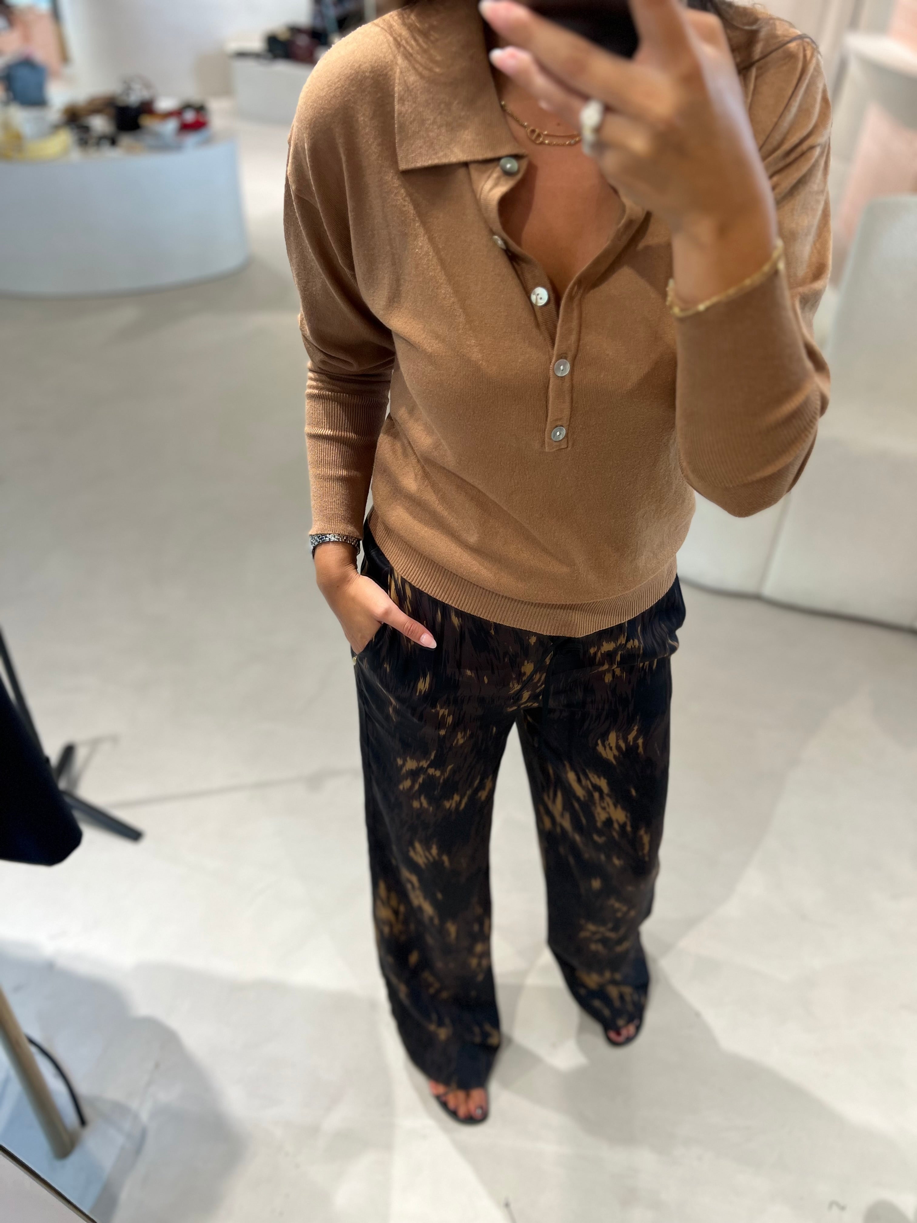Este fato coordenado da Ottod’Ame é composto por uma camisa oversized e umas calças palazzo, ambas em 100 % viscose estampada, leve e fluida. A camisa tem um corte descontraído que proporciona movimento e conforto, ideal para um visual elegante e relaxado. As calças apresentam uma cintura elástica com cordão ajustável, garantindo um fit prático e confortável, sem comprometer o estilo.