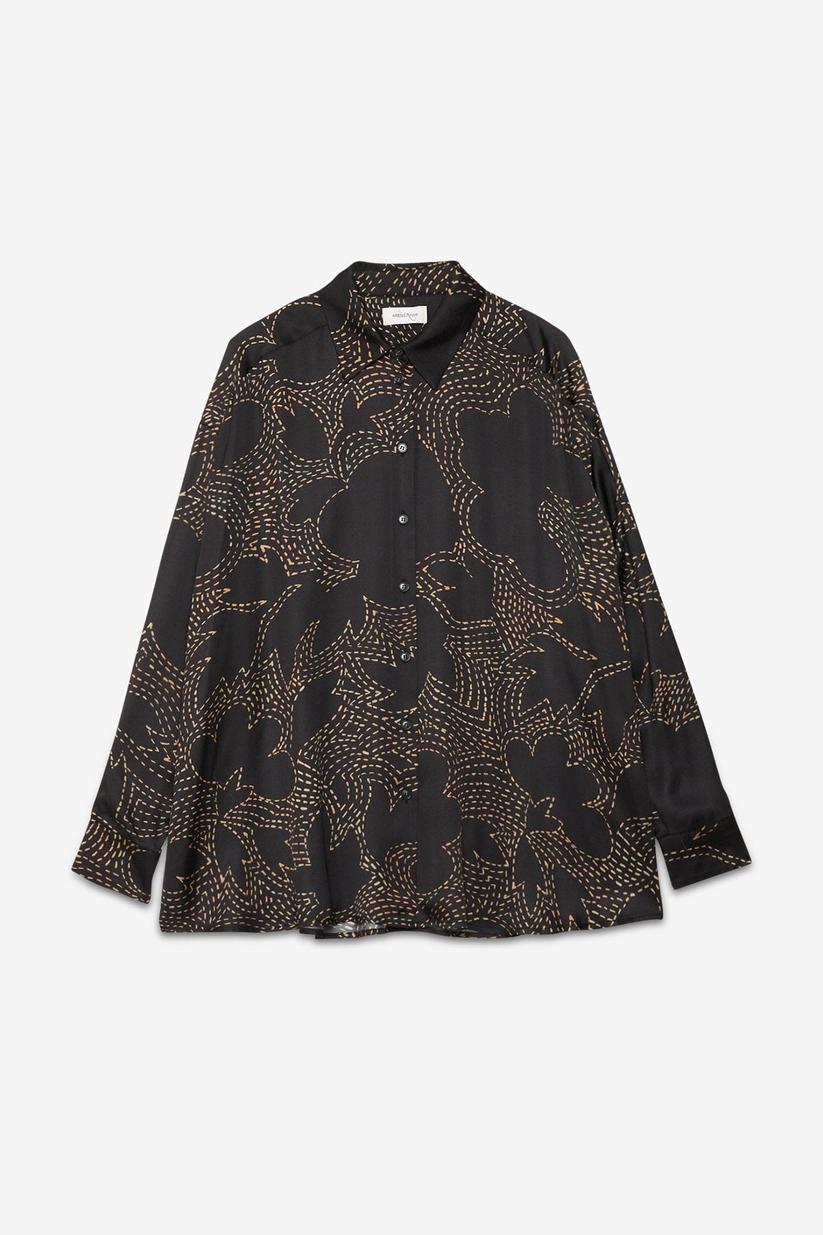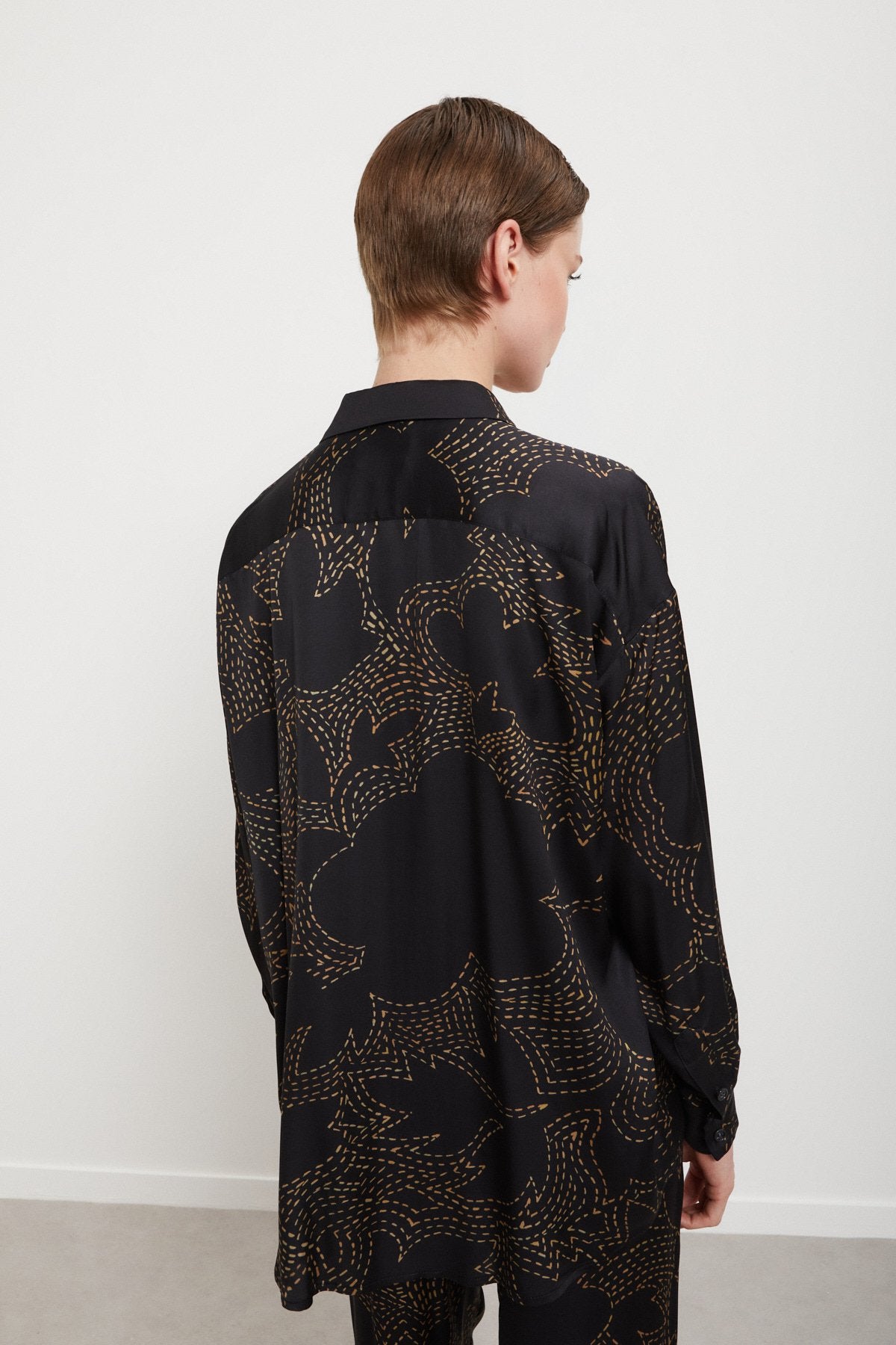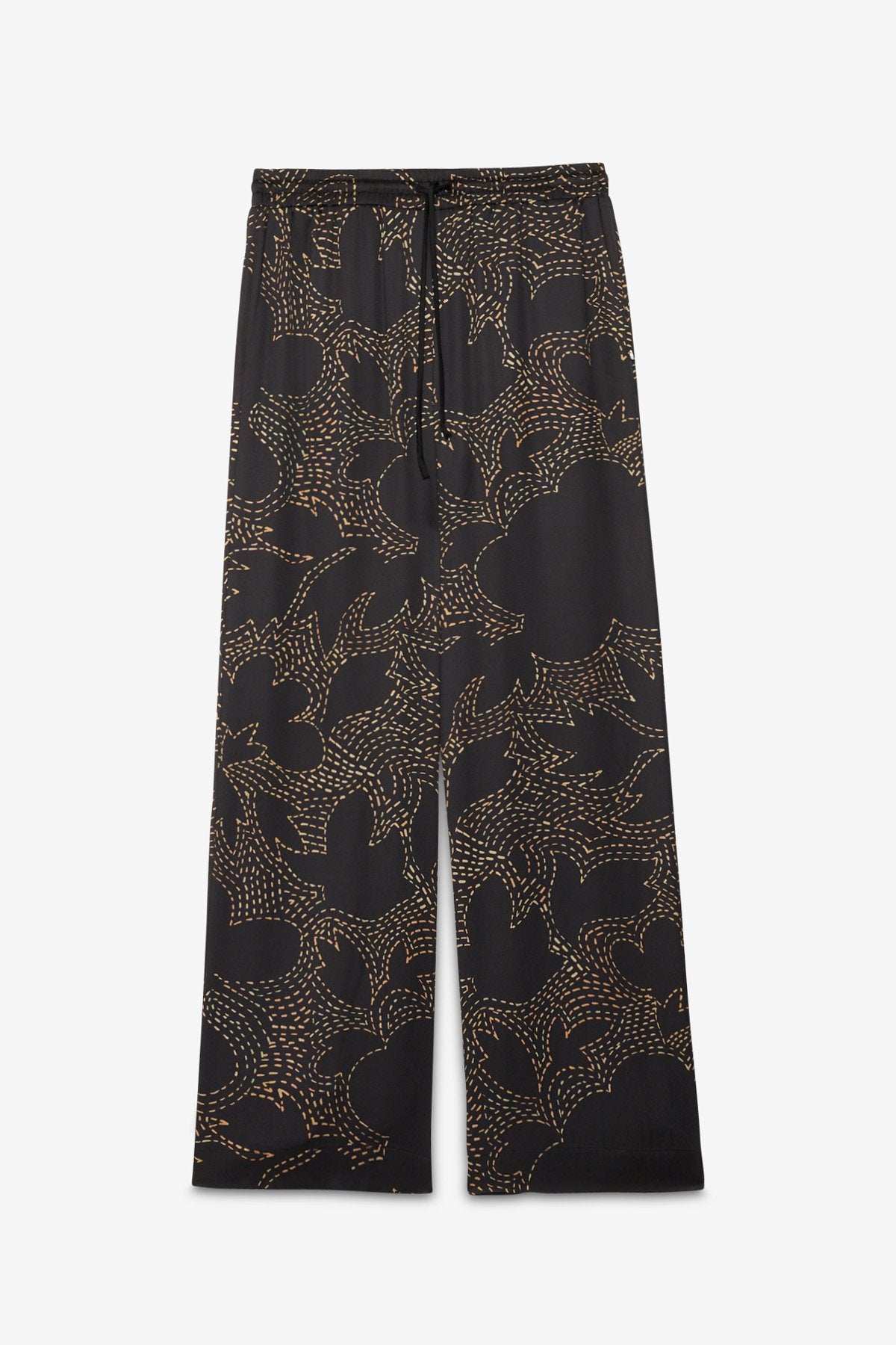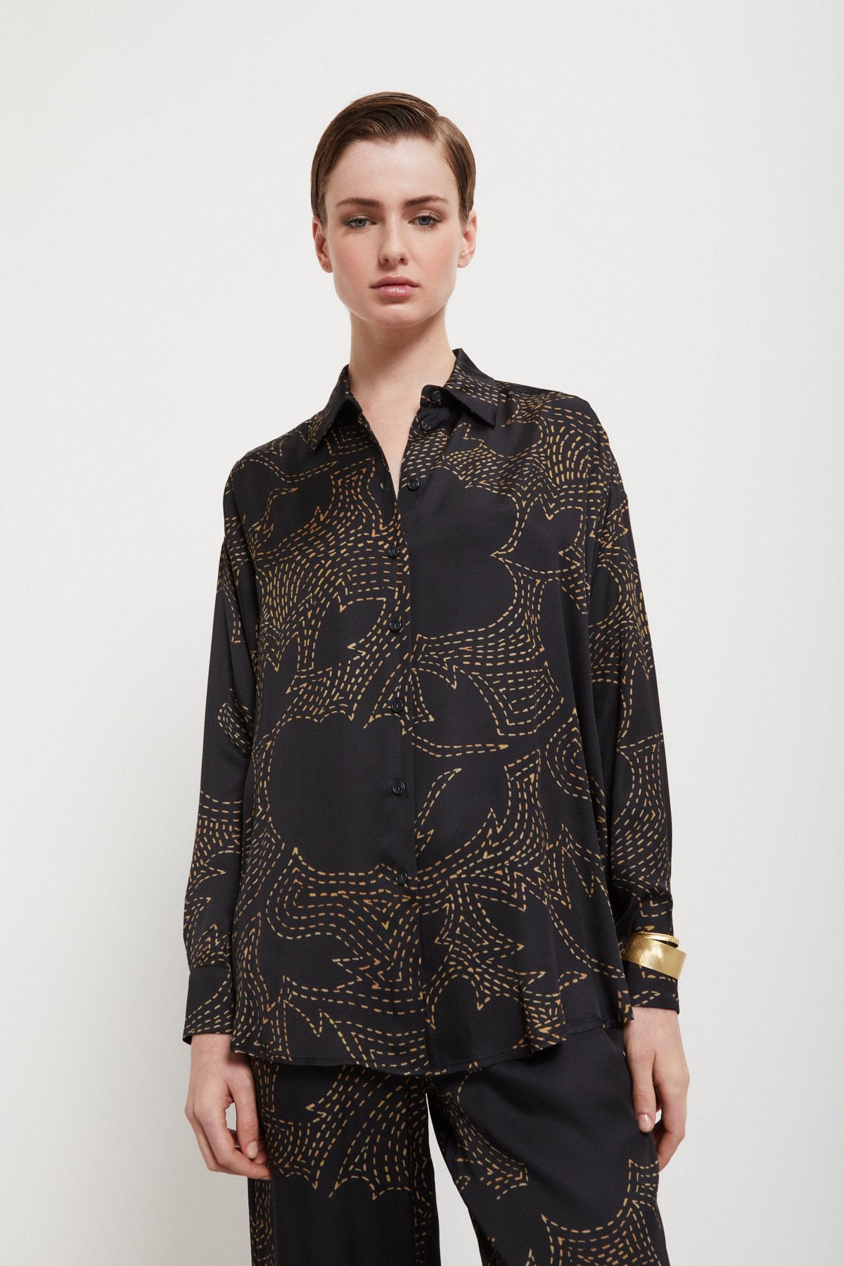 Este fato coordenado da Ottod’Ame é composto por uma camisa oversized e umas calças palazzo, ambas em 100 % viscose estampada, leve e fluida. A camisa tem um corte descontraído que proporciona movimento e conforto, ideal para um visual elegante e relaxado. As calças apresentam uma cintura elástica com cordão ajustável, garantindo um fit prático e confortável, sem comprometer o estilo.