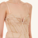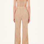 Long pink Liu Jo party jumpsuit with lurex pattern, sweetheart neckline, elasticated back, supported by thin adjustable straps.