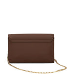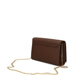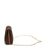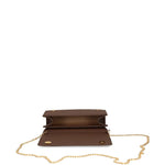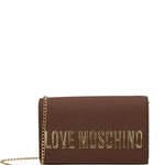 Mala de ombro Love Moschino castanho com alça de corrente fixa, logo metálico à frente e fecho com aba magnética.