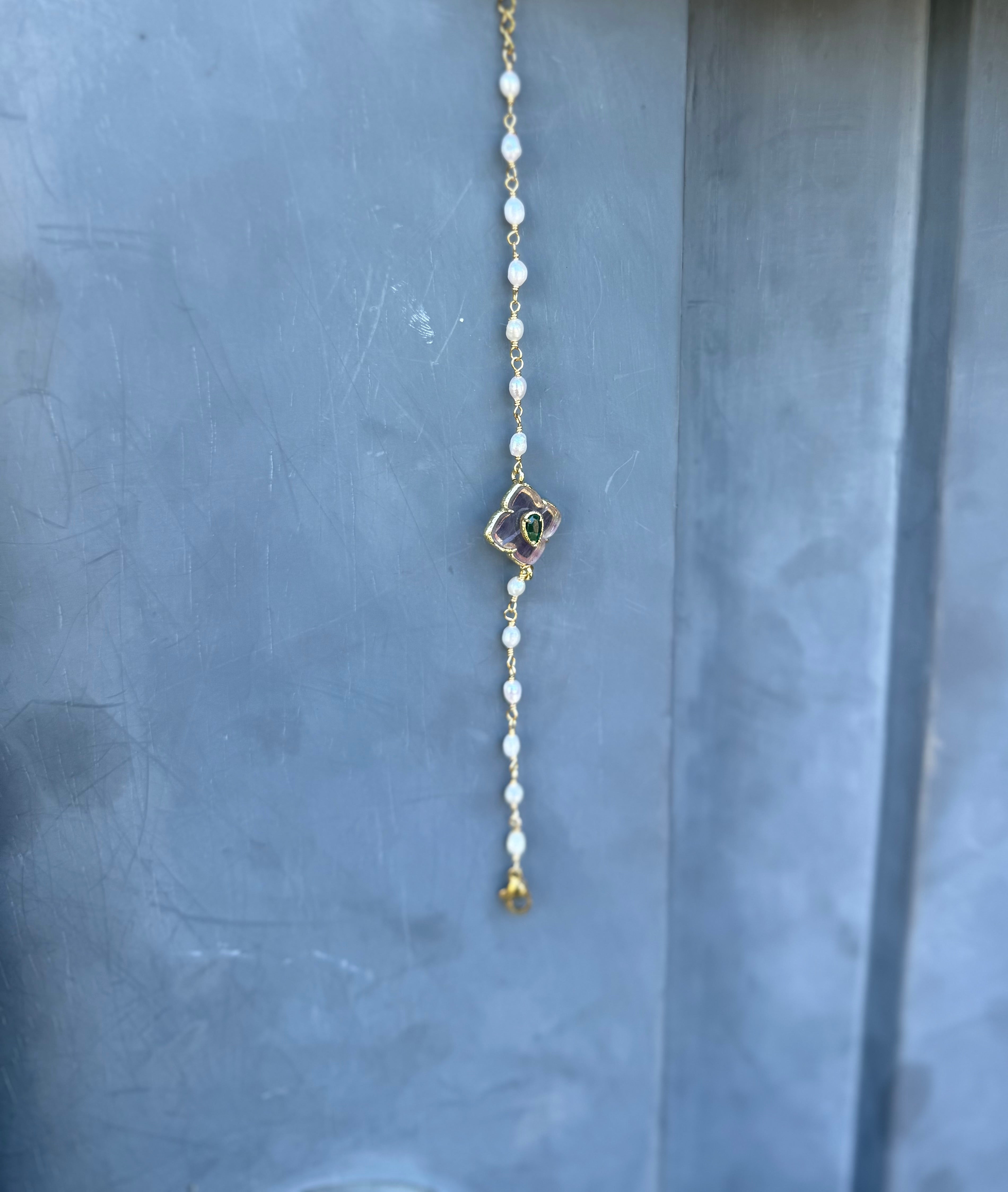 Pulseira de Corrente com Pérolas de Água, Trevo e Pedras Naturais Fluorite