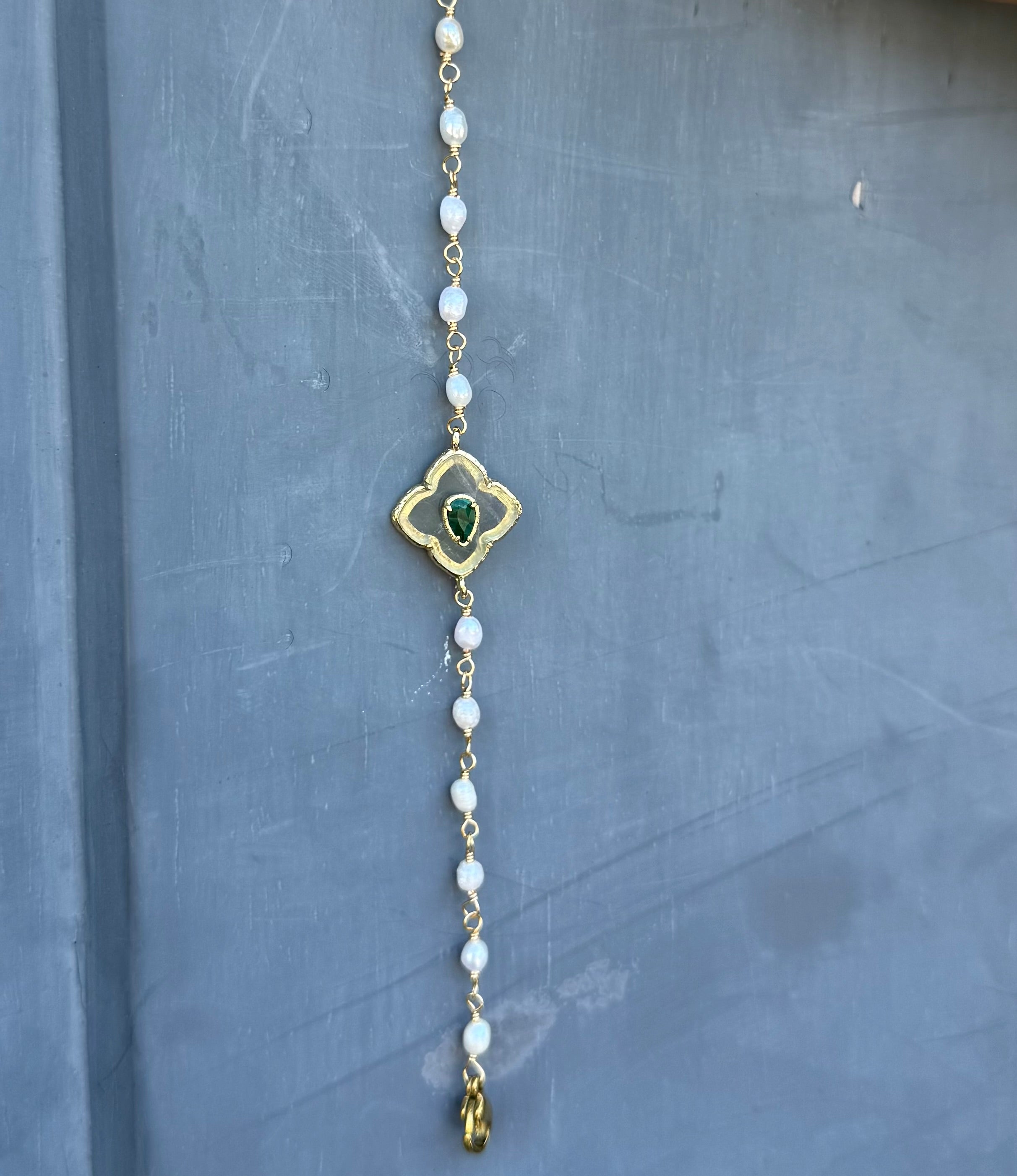 Pulseira de Corrente com Pérolas de Água, Trevo e Pedras Naturais Amazonita