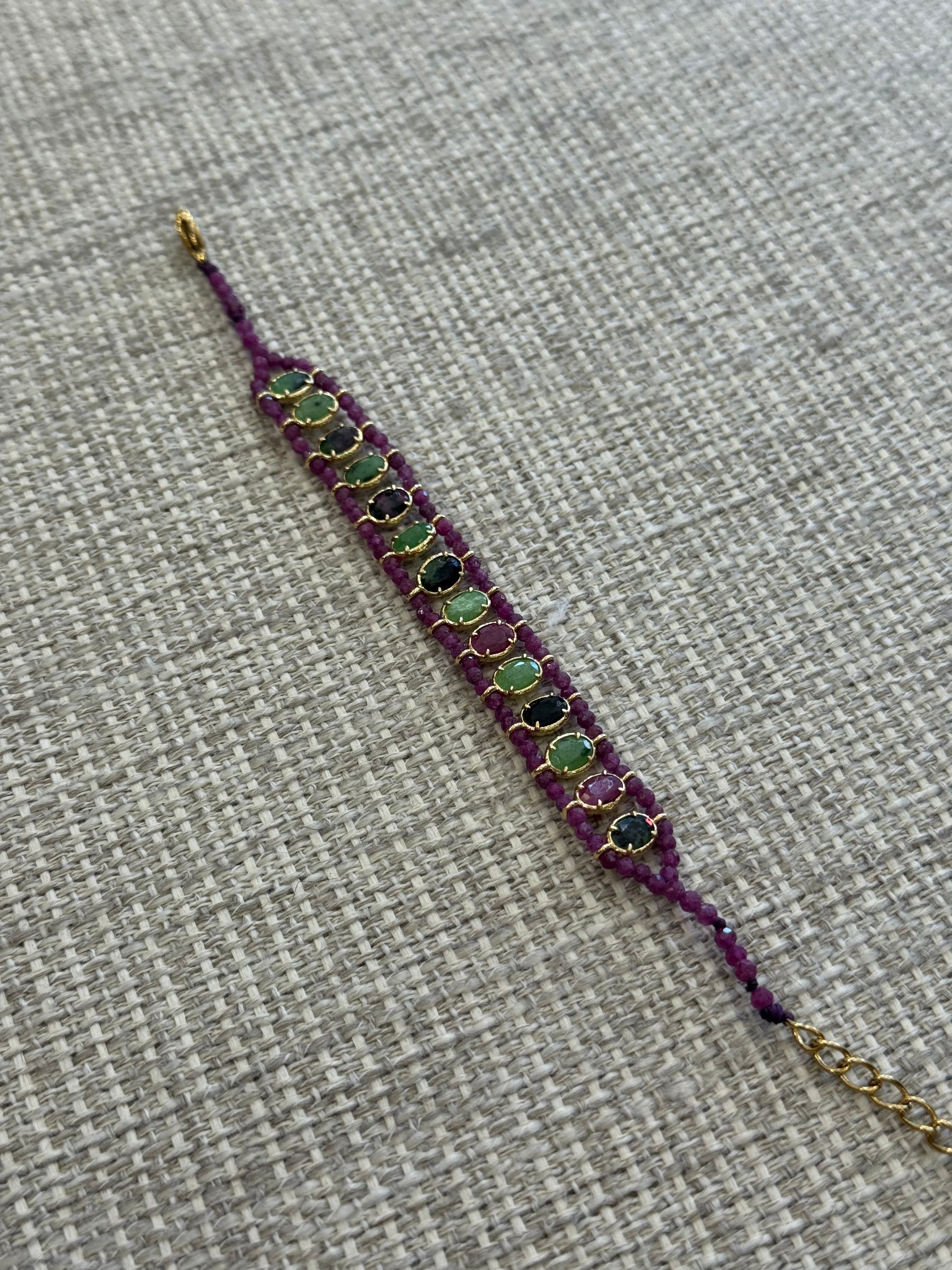 Pulseira de Corrente de Dois Fios com Pérolas e Pedra Oval Ornada | Roxo & Verde