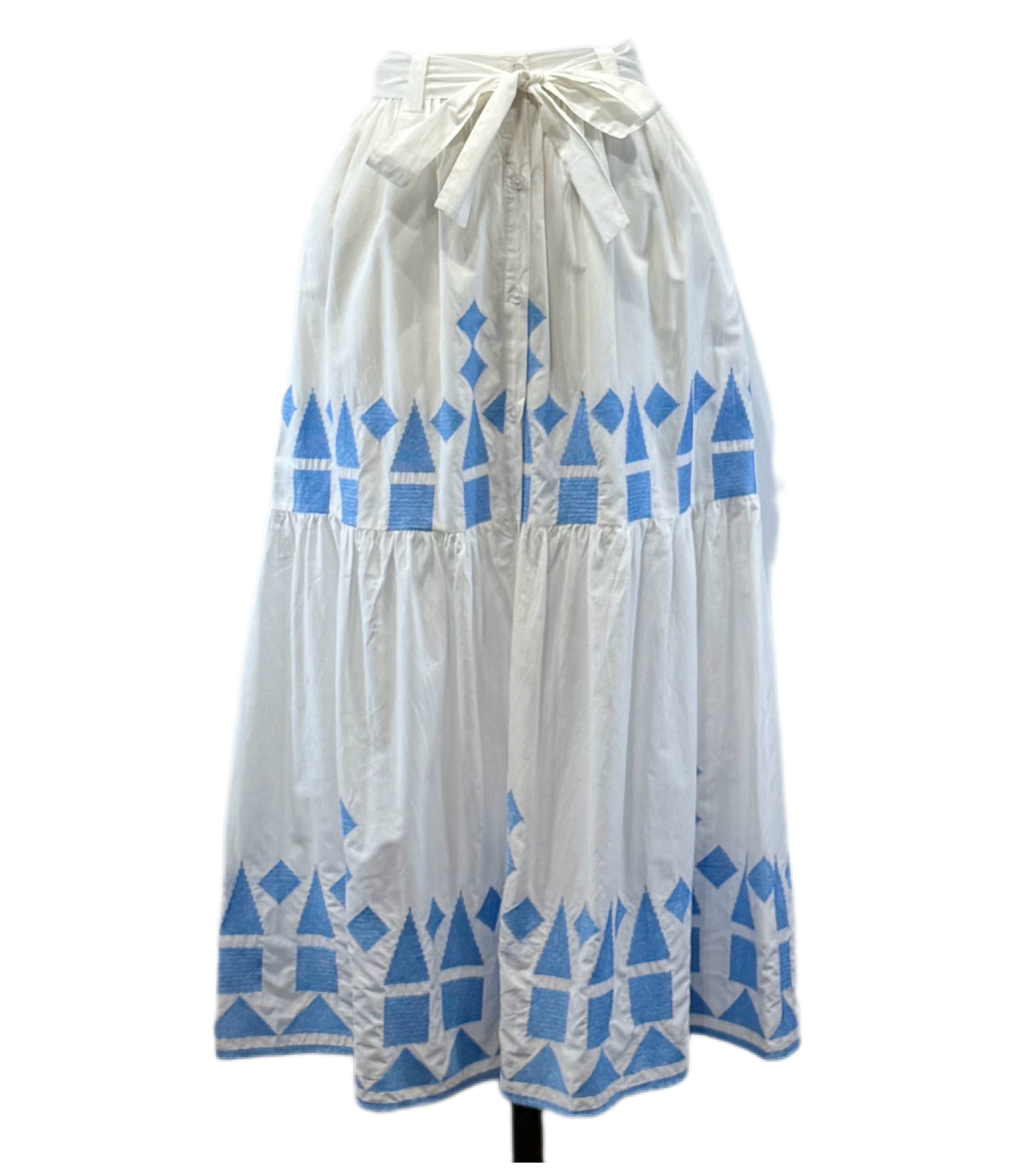 Saia midi branca com bordados azuis, fecho de botões na frente com cinto de laçada.