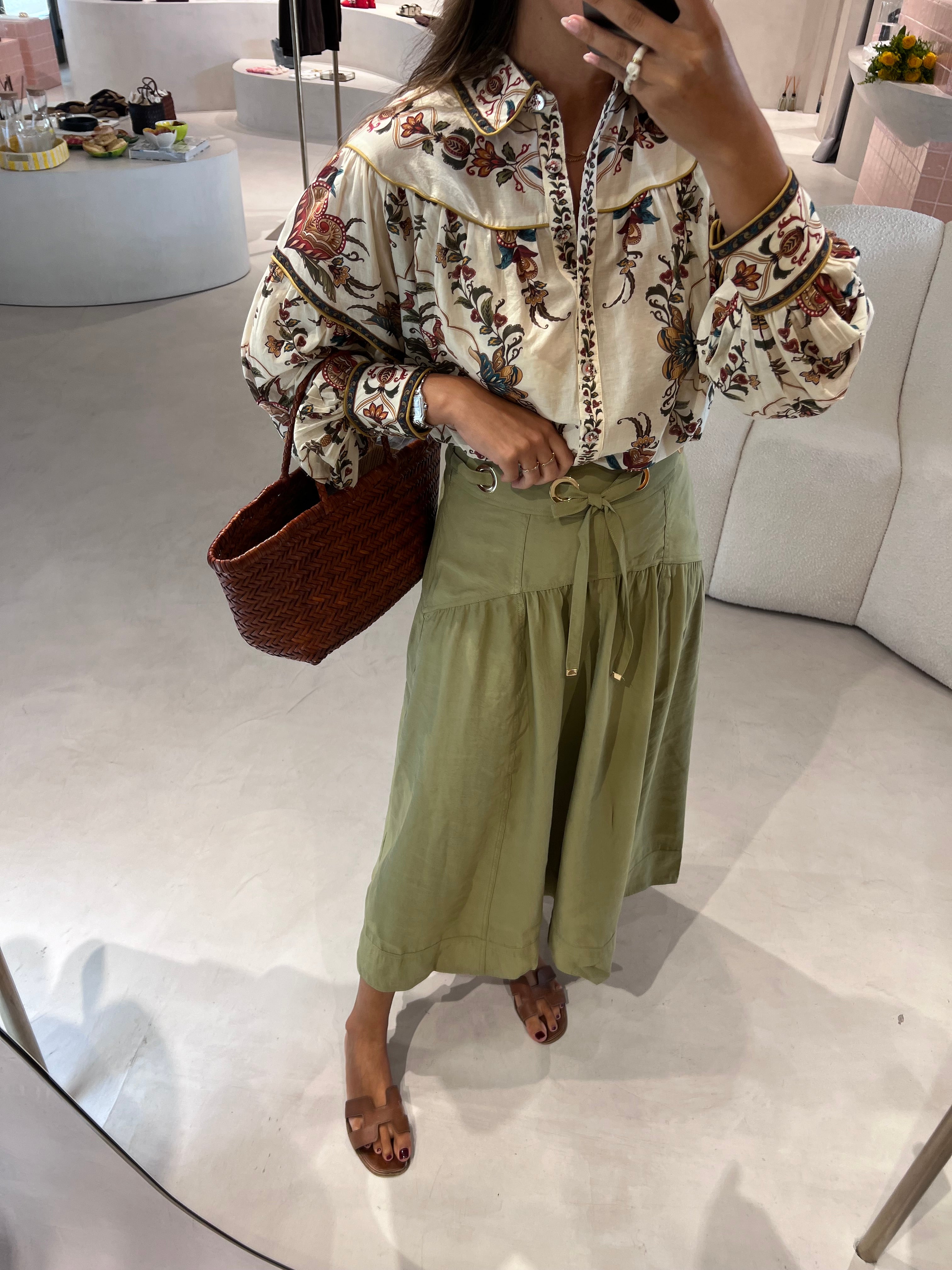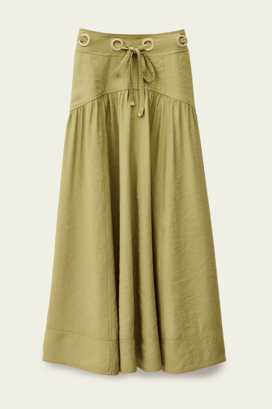 Eleve o estilo com esta saia midi DONIA da BAS&H, que junta elegância fluida a um toque moderno — tudo num irreverente tom kaki. Com uma silhueta ampla e corte evasé, esta peça favorece e valoriza o movimento natural do corpo. O cós, com faixa de tecido ajustável e passadores metálicos, permite um ajuste personalizado e acrescenta um detalhe sofisticado. A pala lateral assimétrica no quadril e os godés franzidos confere-lhe volume e leveza refinada.