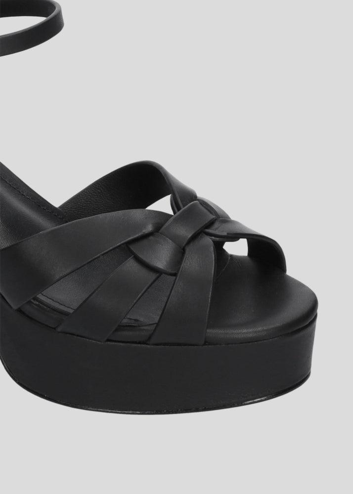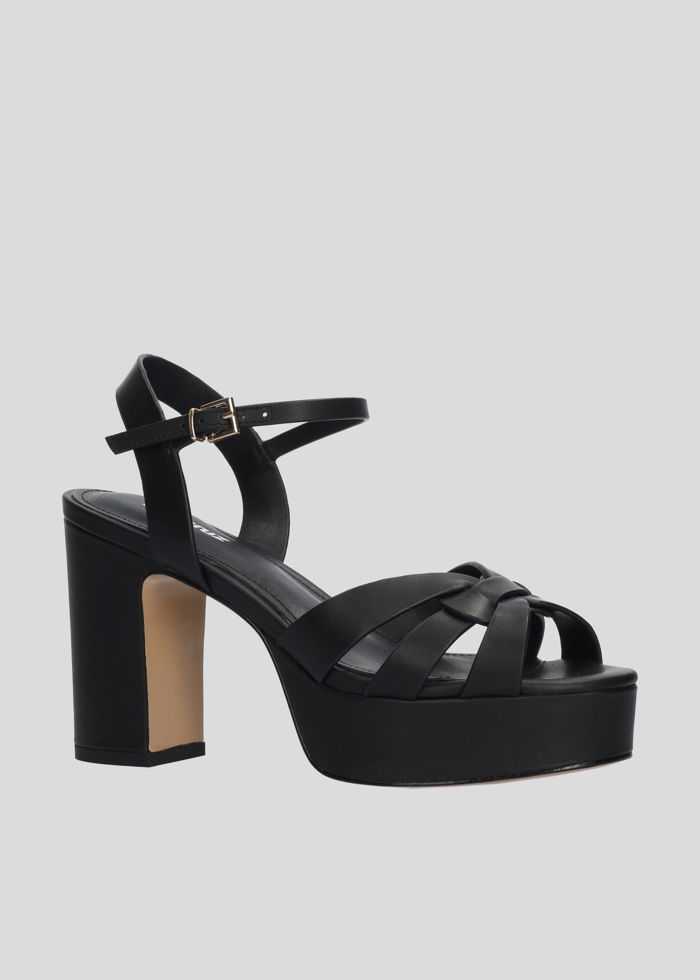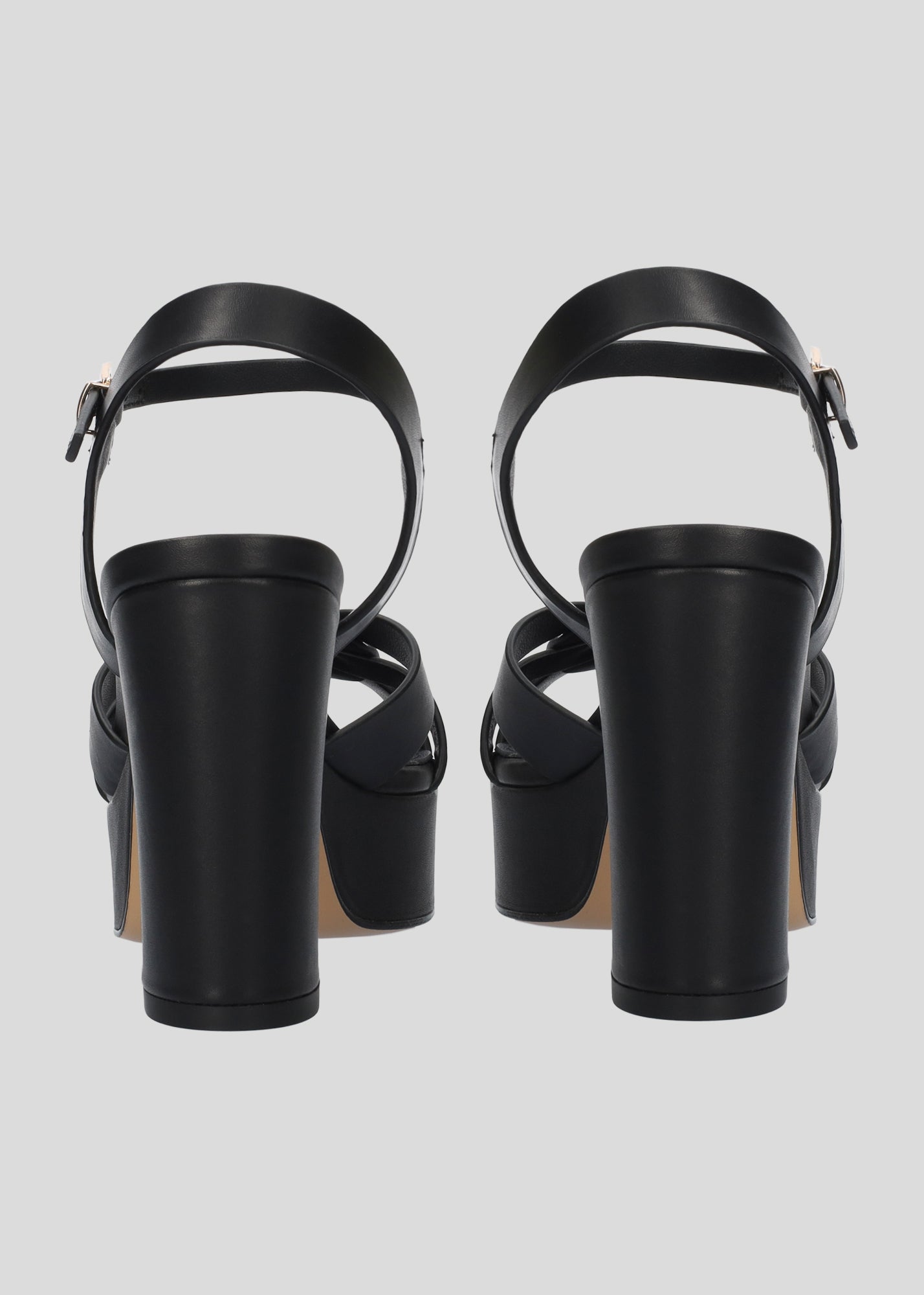 Sandália de salto alto em pele. Tiras cruzadas e tira no tornozelo, salto em bloco e ponta redonda.