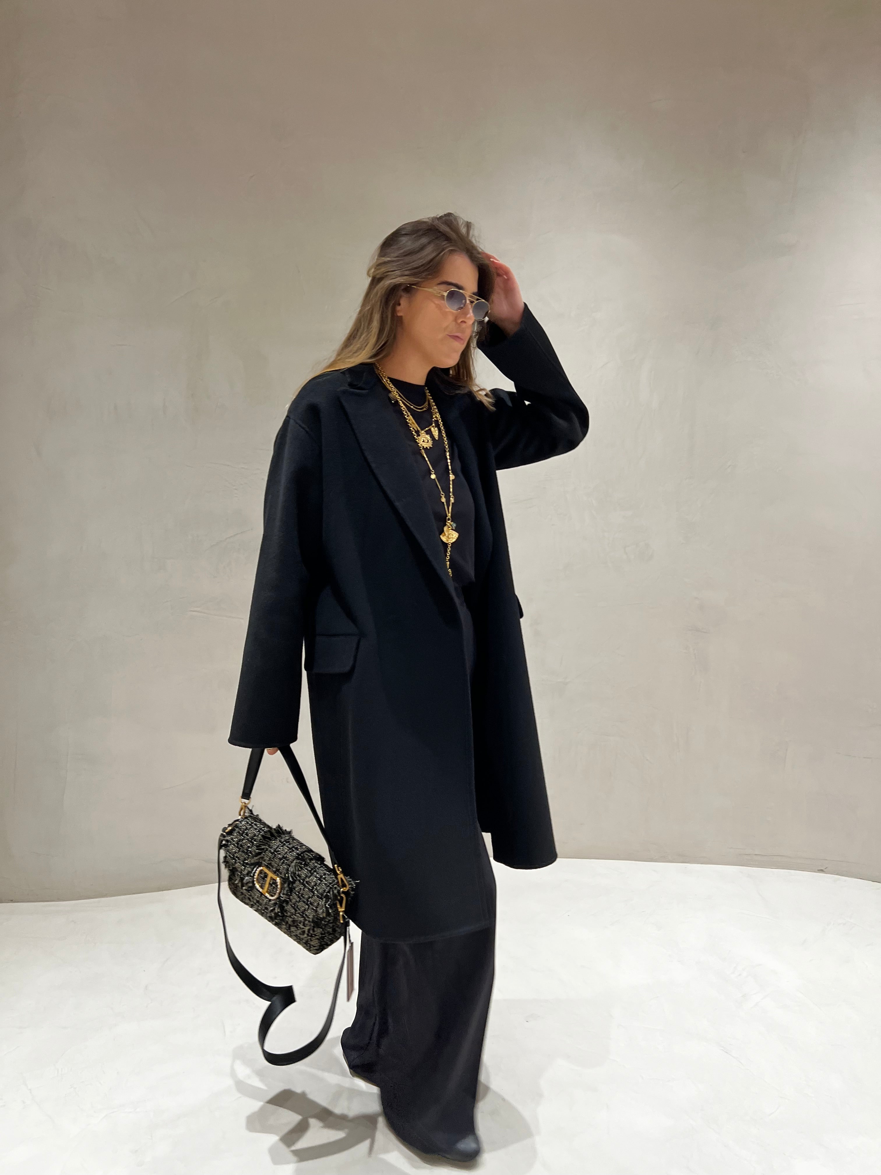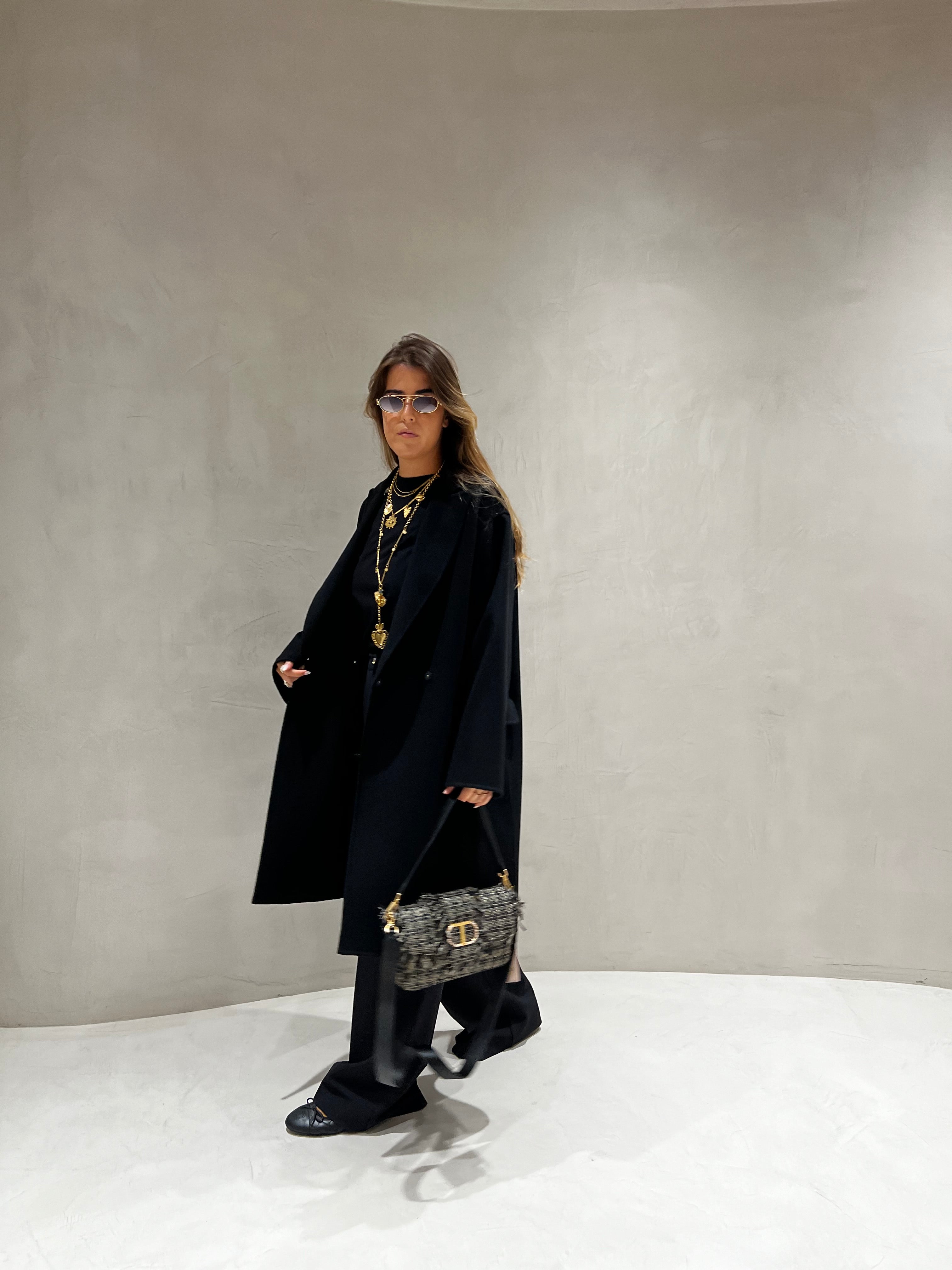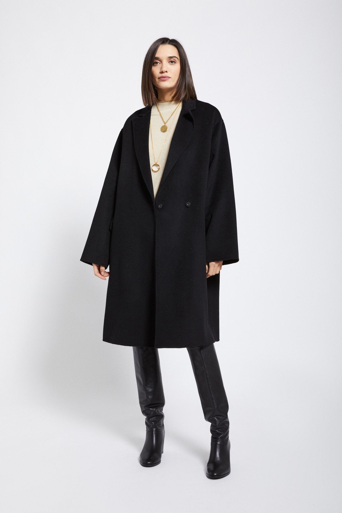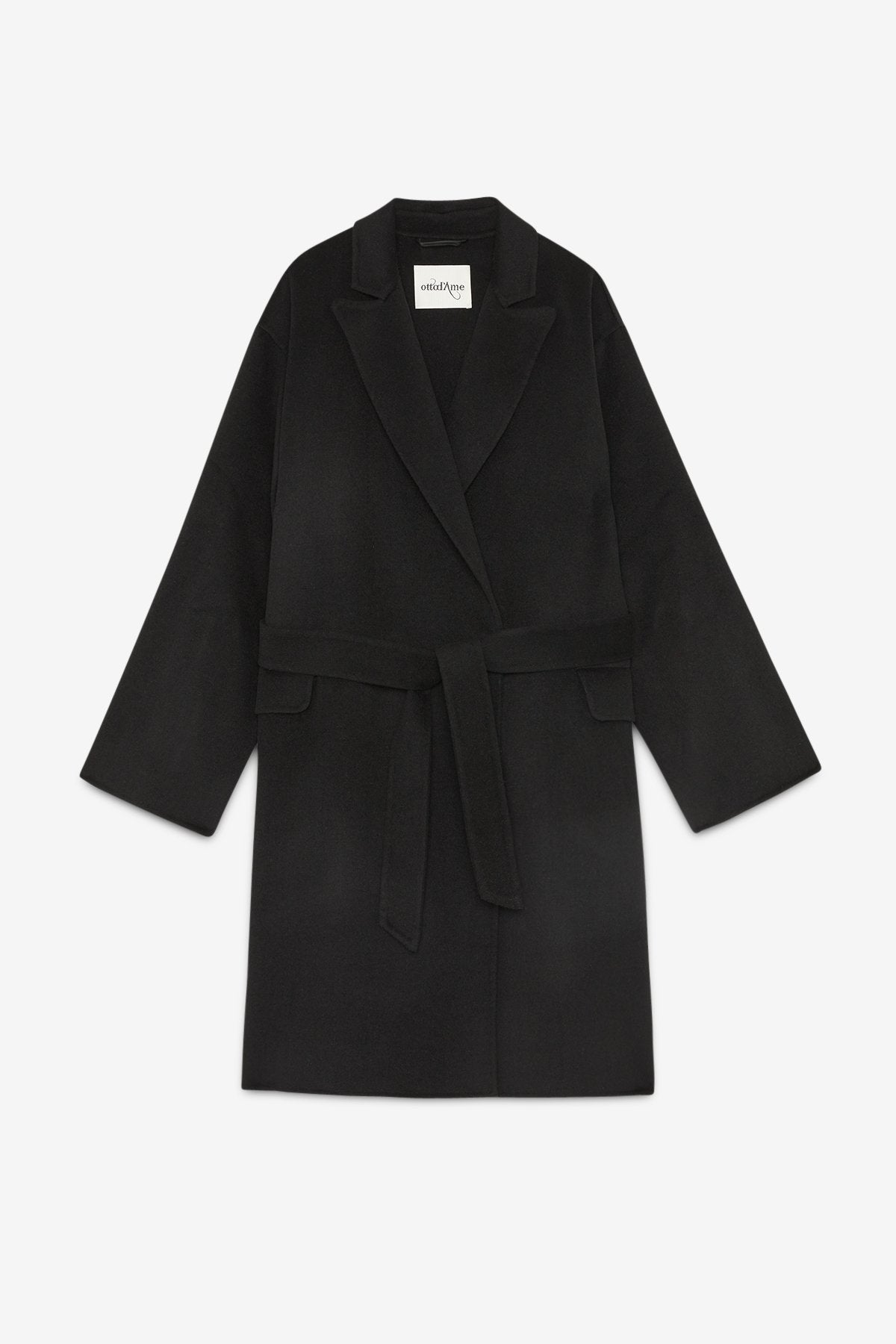 Sobretudo midi em fazenda de lã Ottod'ame preto, corte oversized, gola de lapela, trespasse na frente, botões magnéticos, bolsos de chapa e cinto amovivel.
