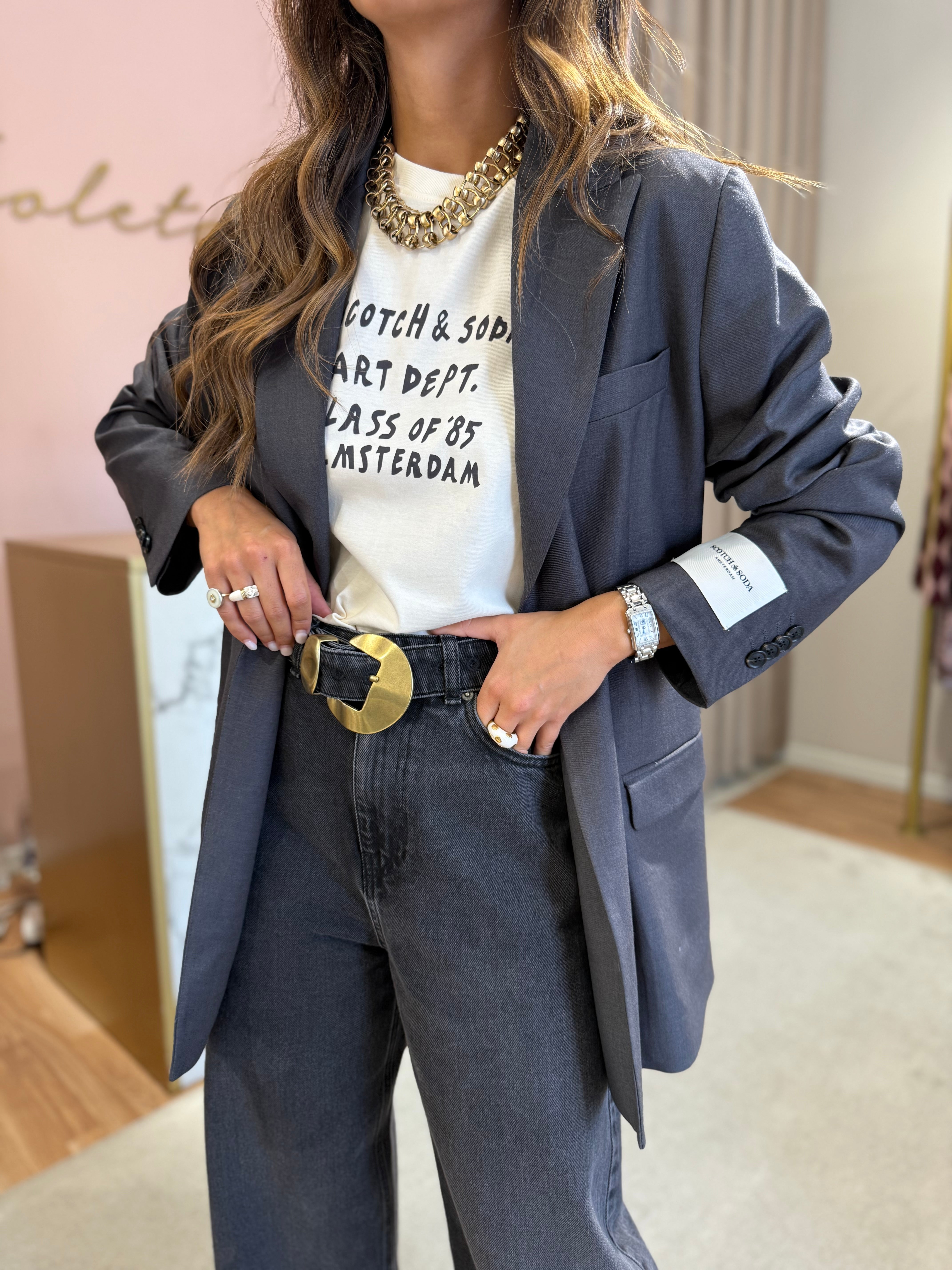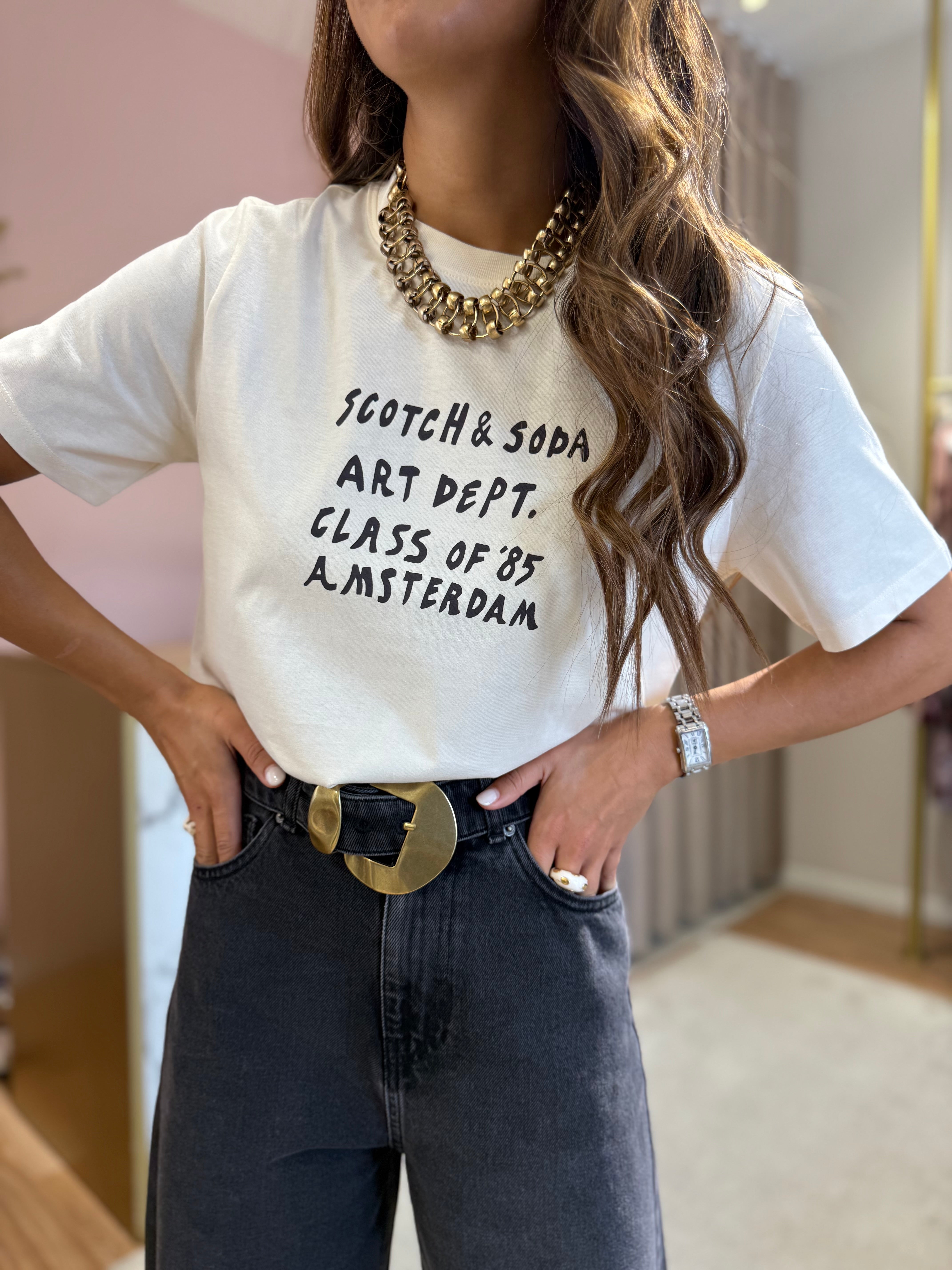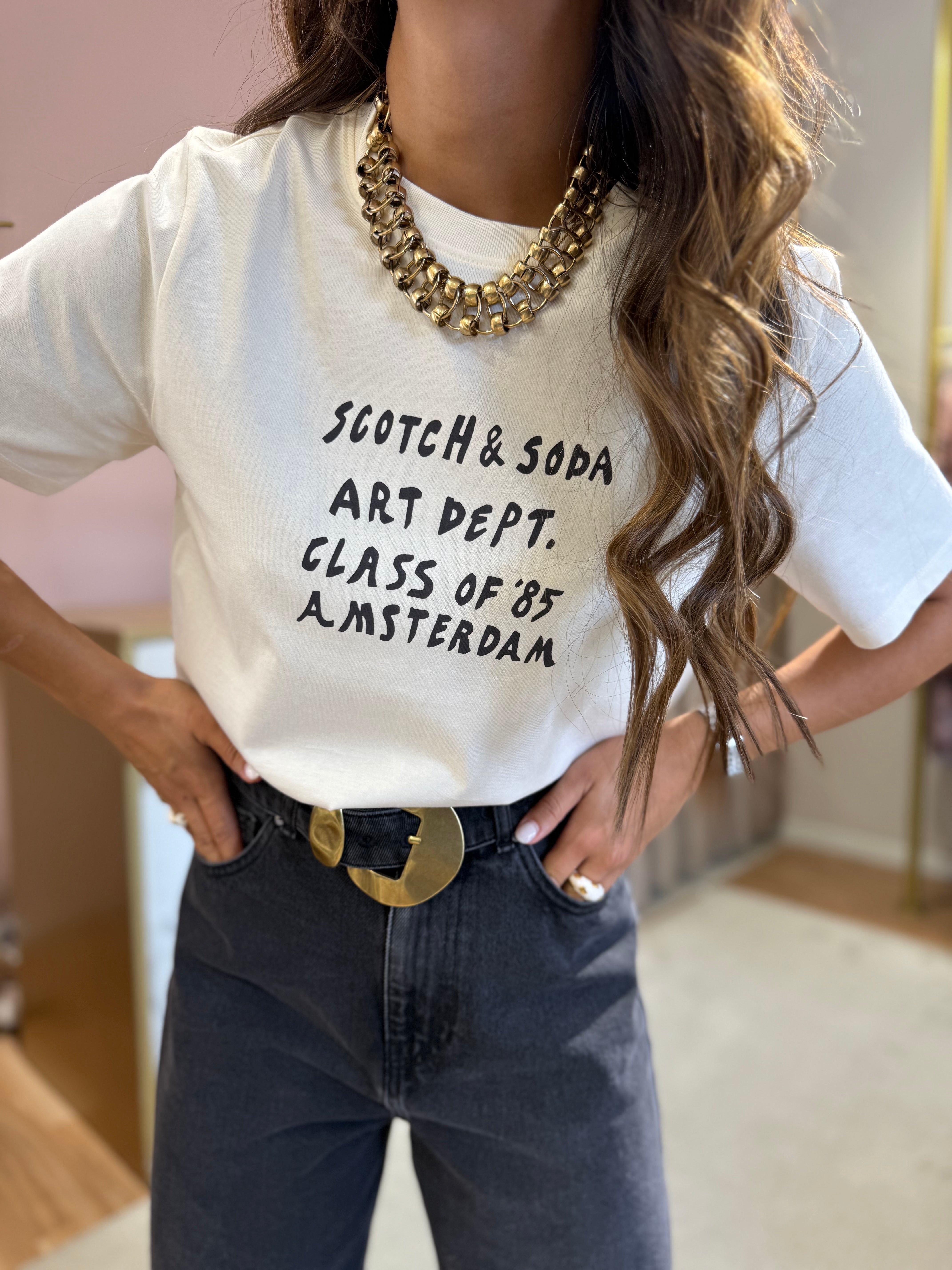 A T‑shirt "Artwork" da Scotch & Soda é uma peça essencial com atitude: confeccionada em 100 % algodão macio e com um corte regular fit, garante conforto sem esforço. A estampa artística no peito adiciona um detalhe expressivo e contemporâneo. Fácil de cuidar (lavagem simples a 30 °C), torna-se um básico versátil para looks casuais com toque criativo.