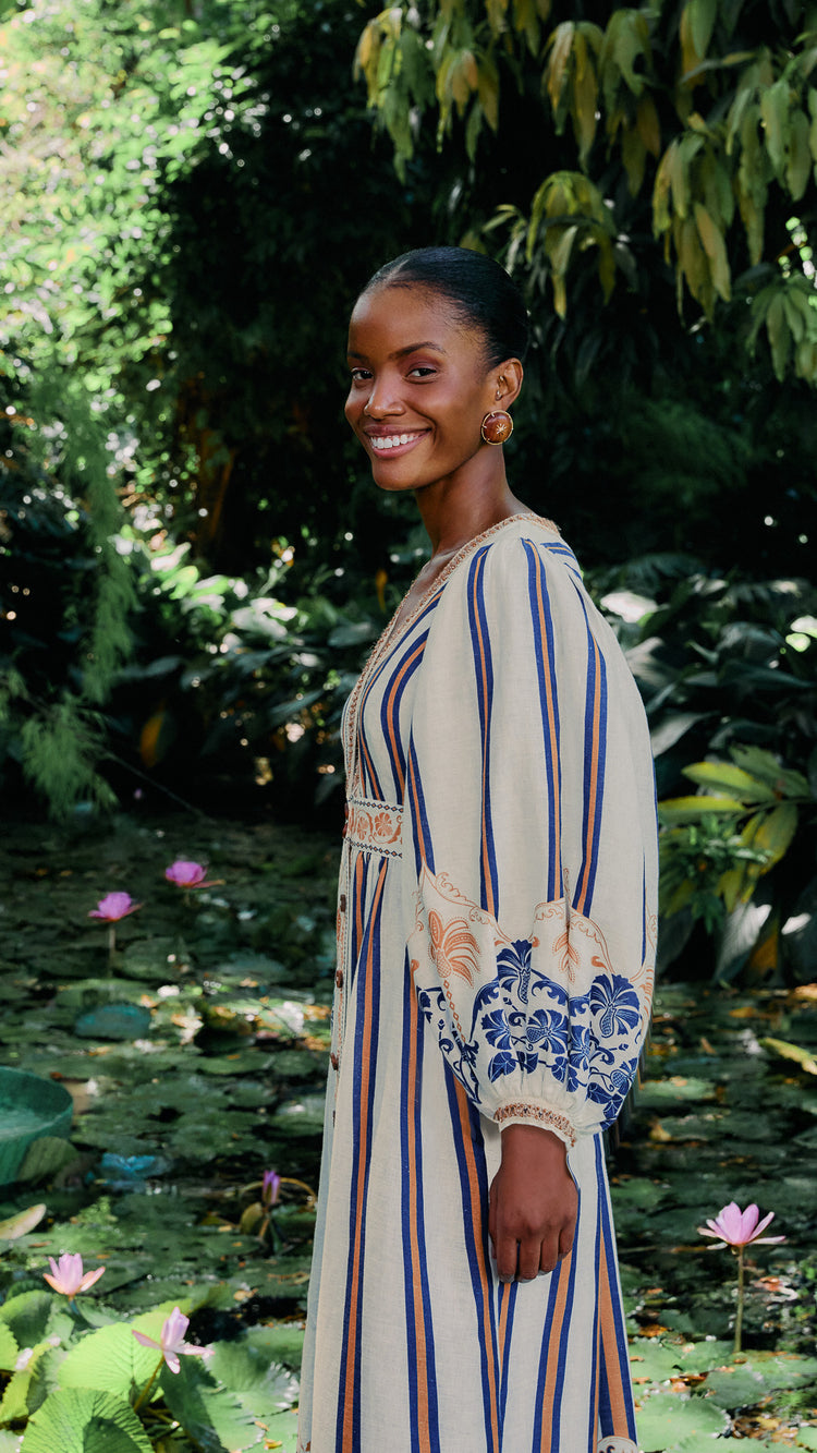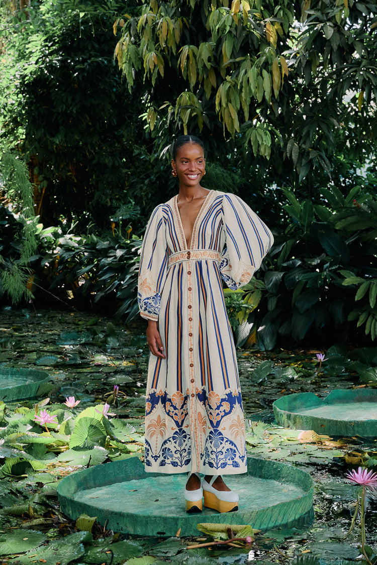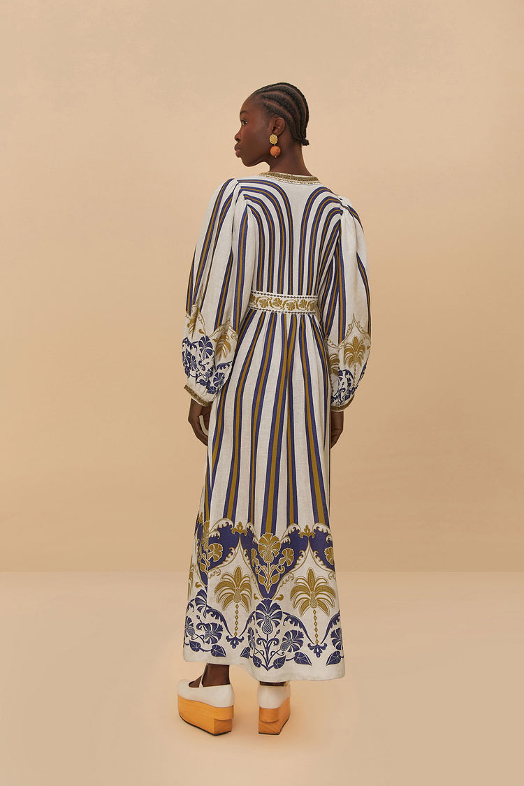 Vestido camiseiro comprido FARM RIO com decote em V, mangas em balão e fecho de botões à frente.