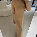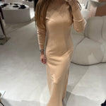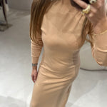 Vestido longo Ottod'ame em bege de malha elástica com gola subida e fendas laterais em baixo.