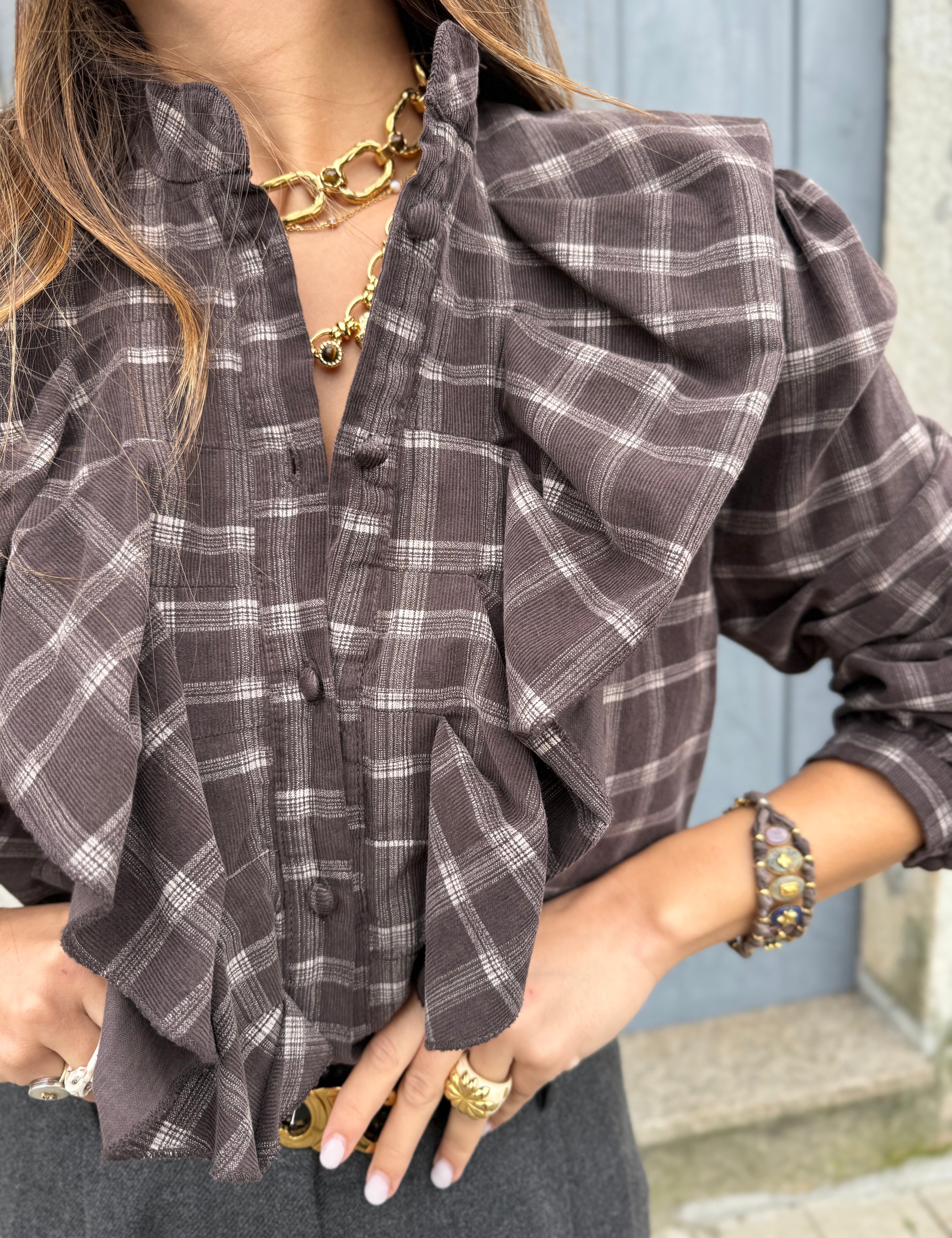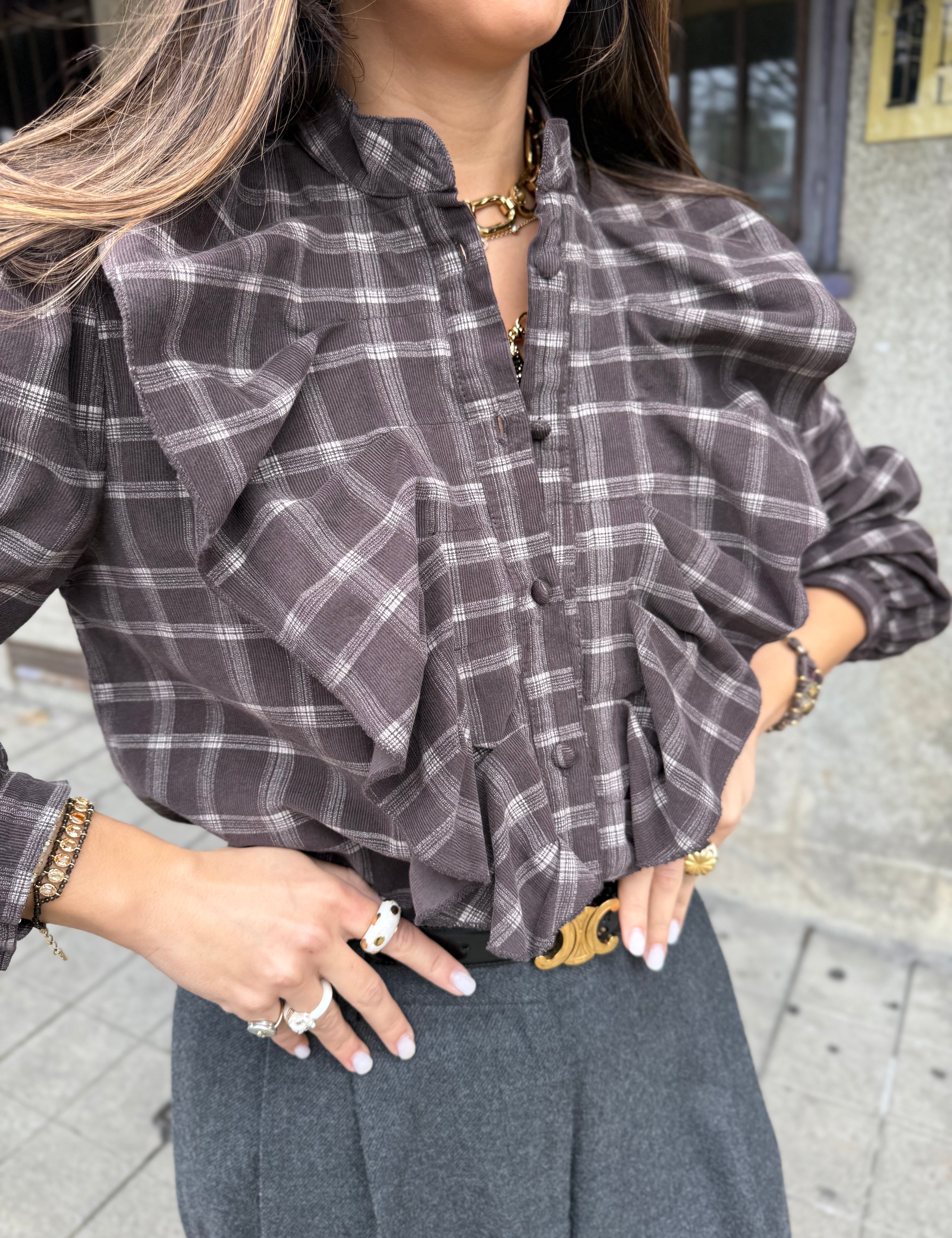 Blusa de Xadrez Castanha com Folhos na Gola | VIOLETA