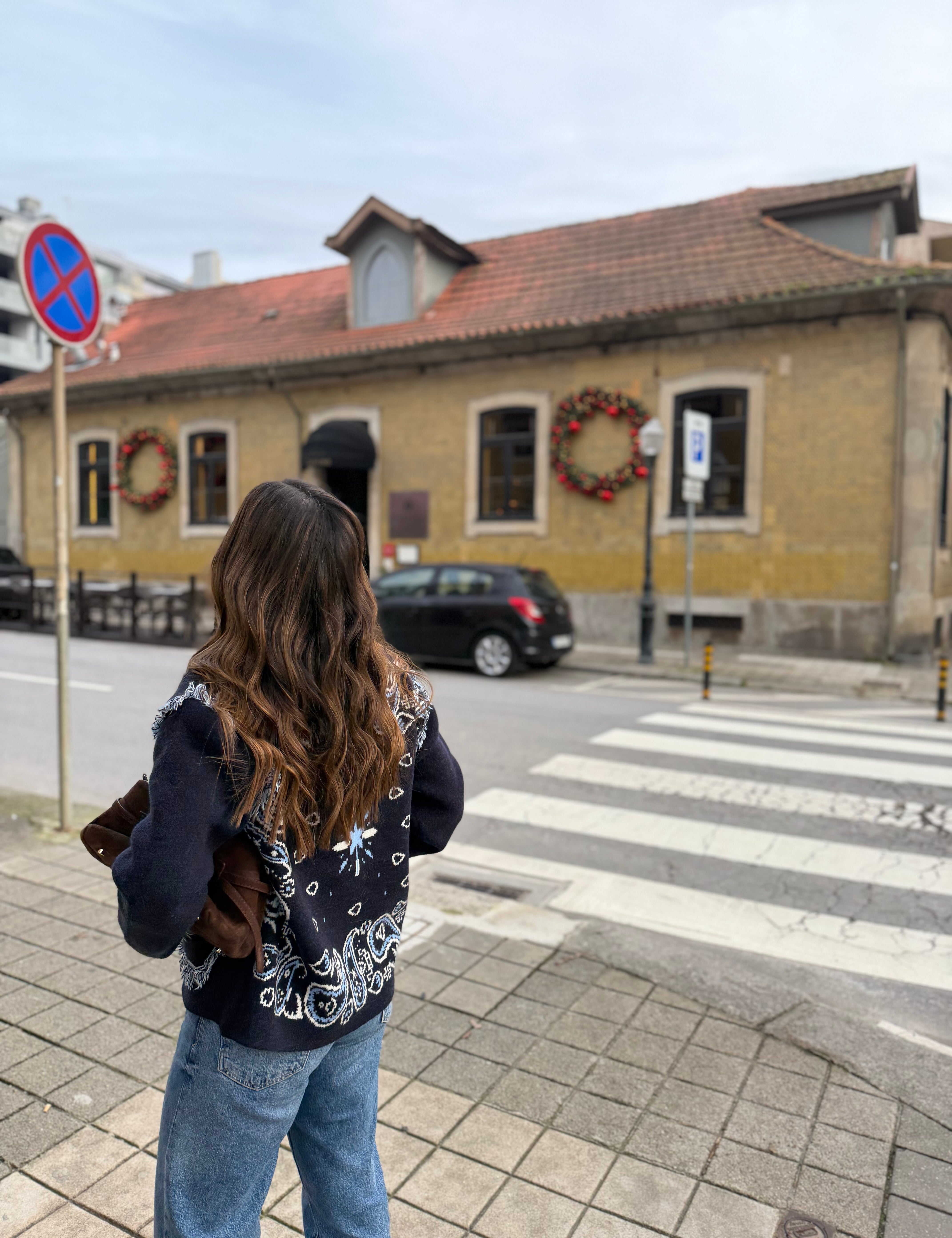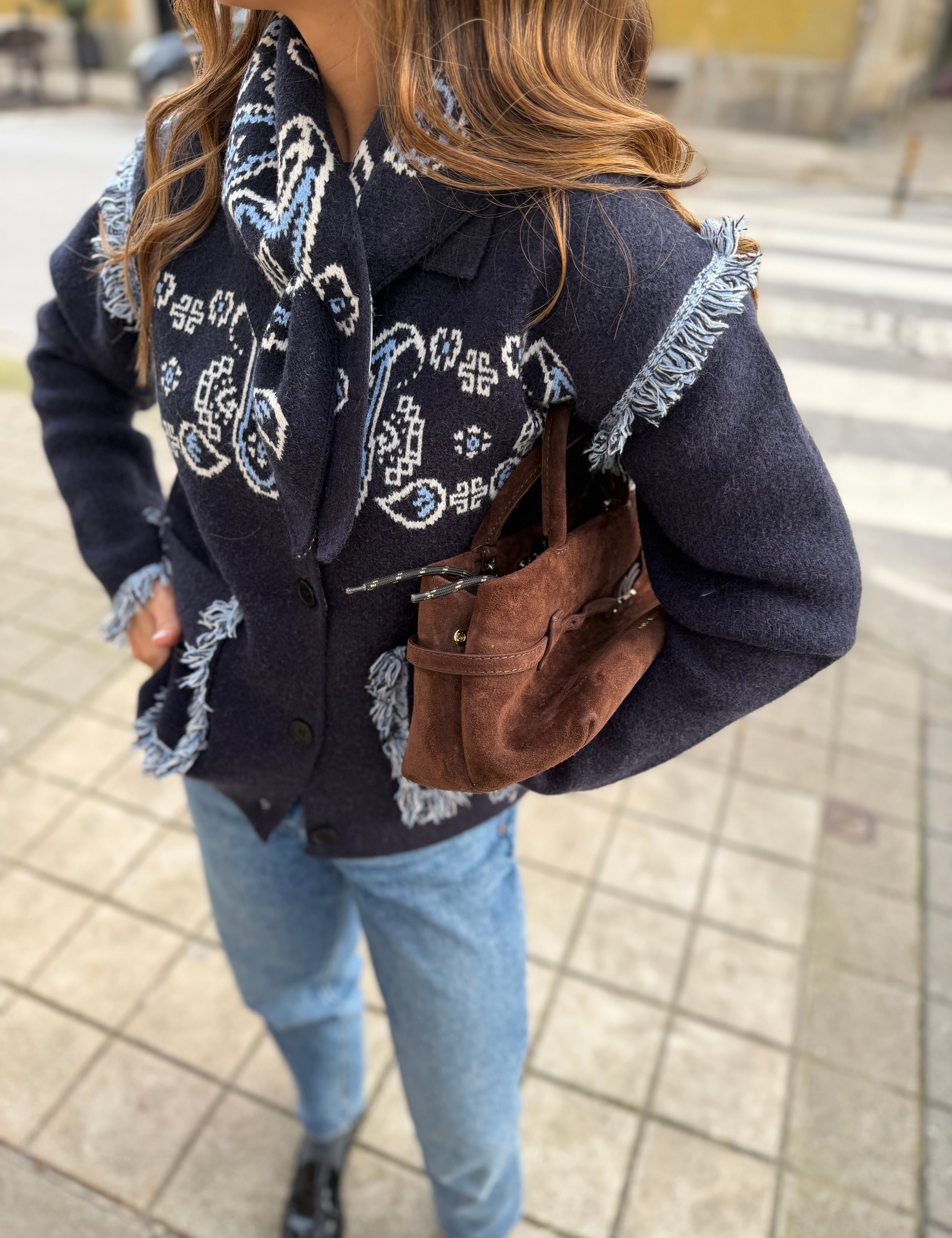 Casaco de Malha com Franjas Print Bandana Azul Marinho | VIOLETA