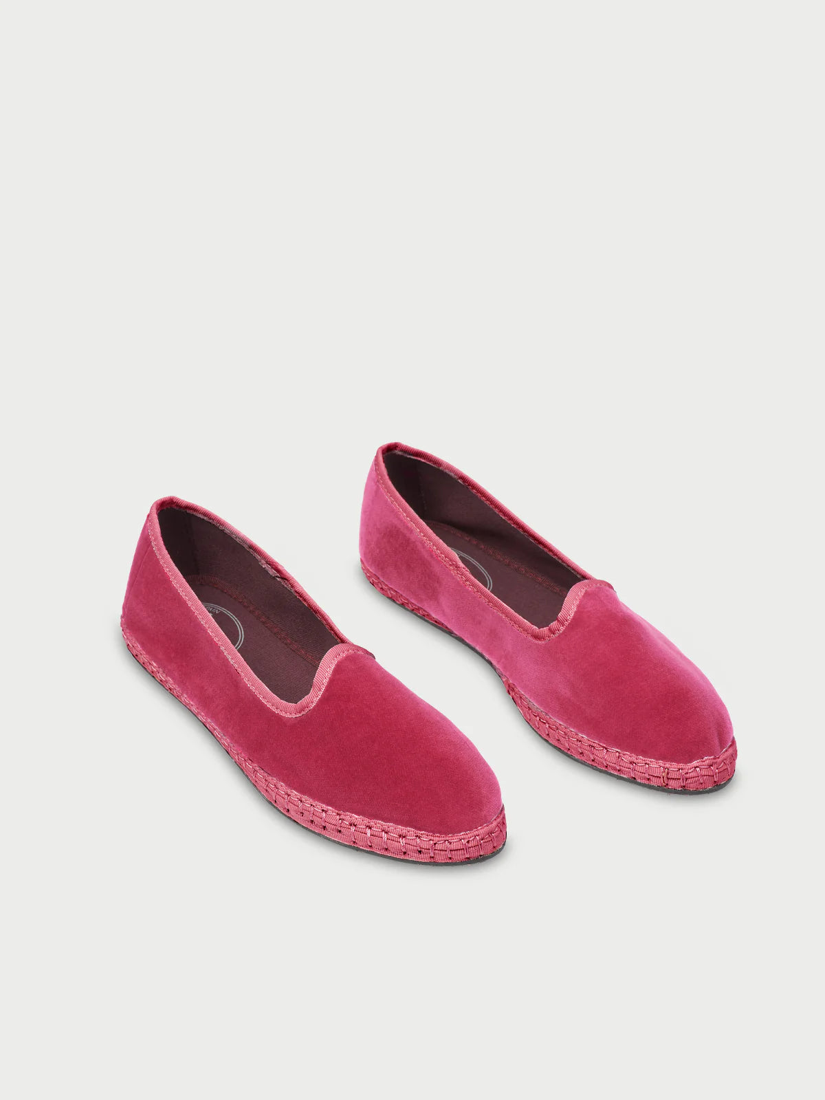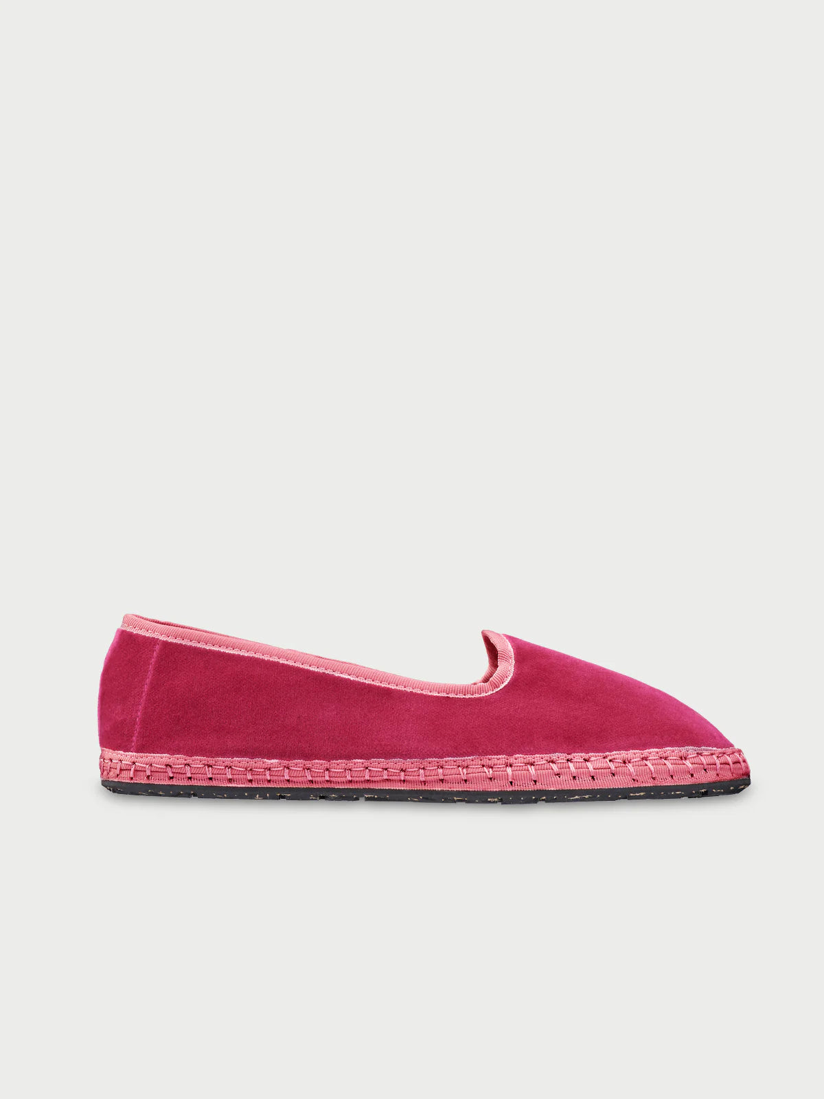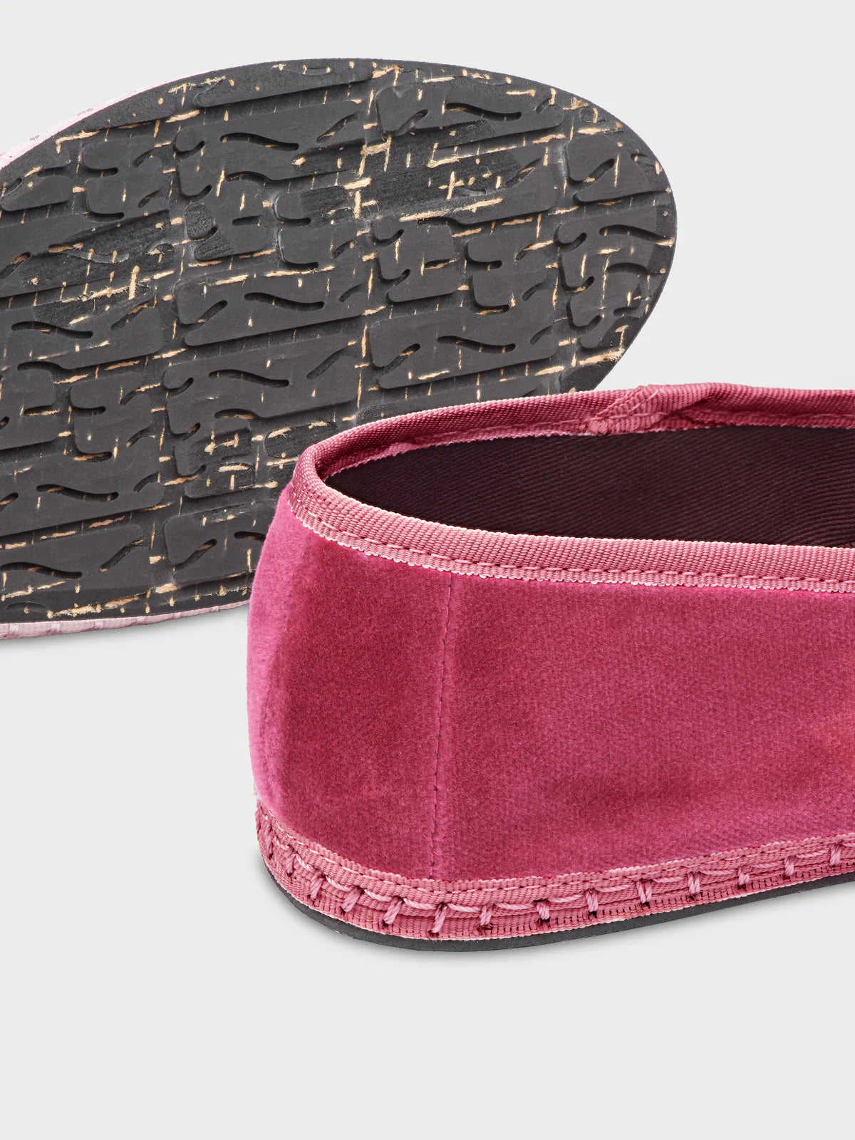 Alpargata de mujer Flabelus, modelo Slipper en terciopelo rosa con vivos en rosa fuxia.