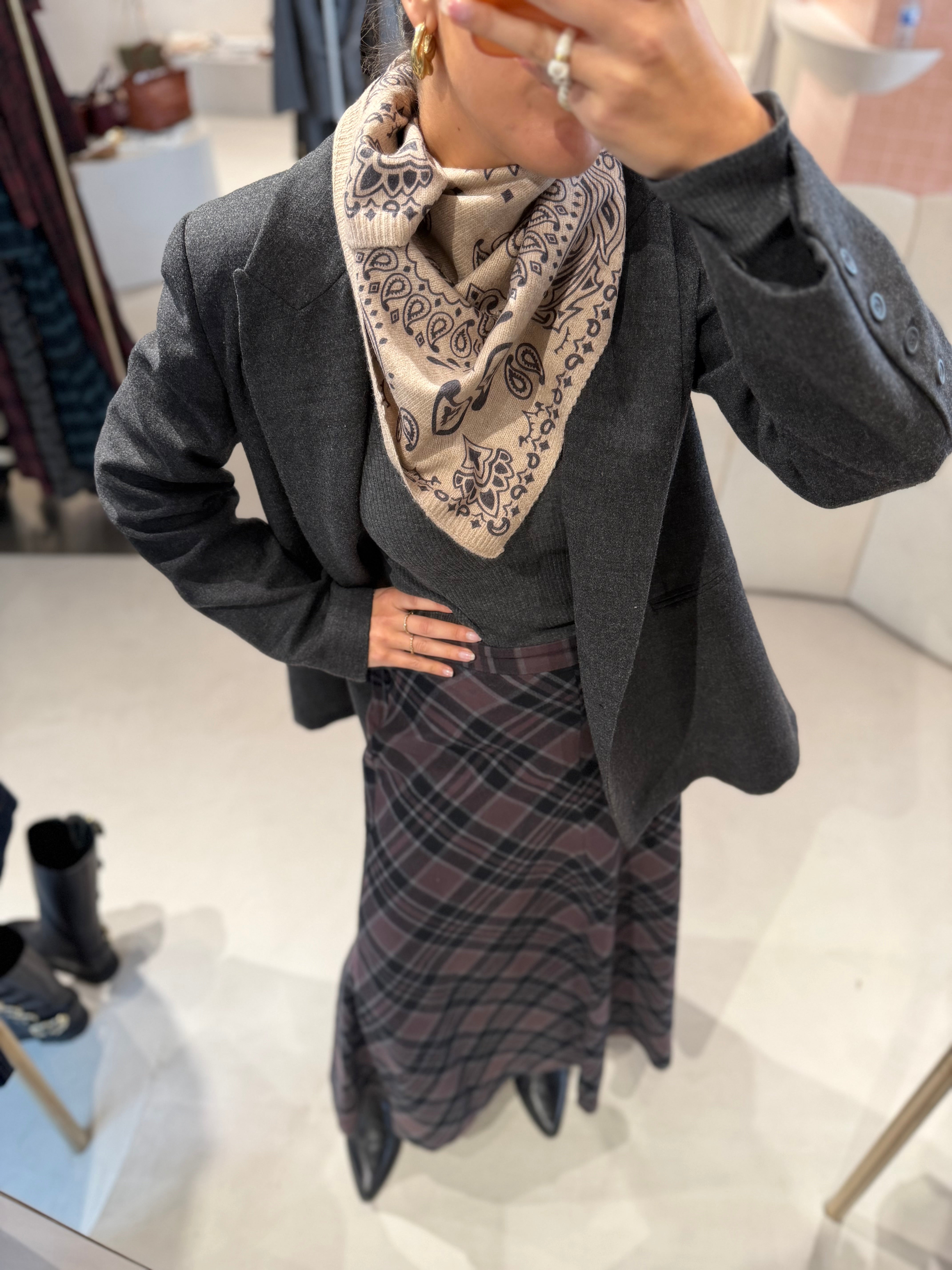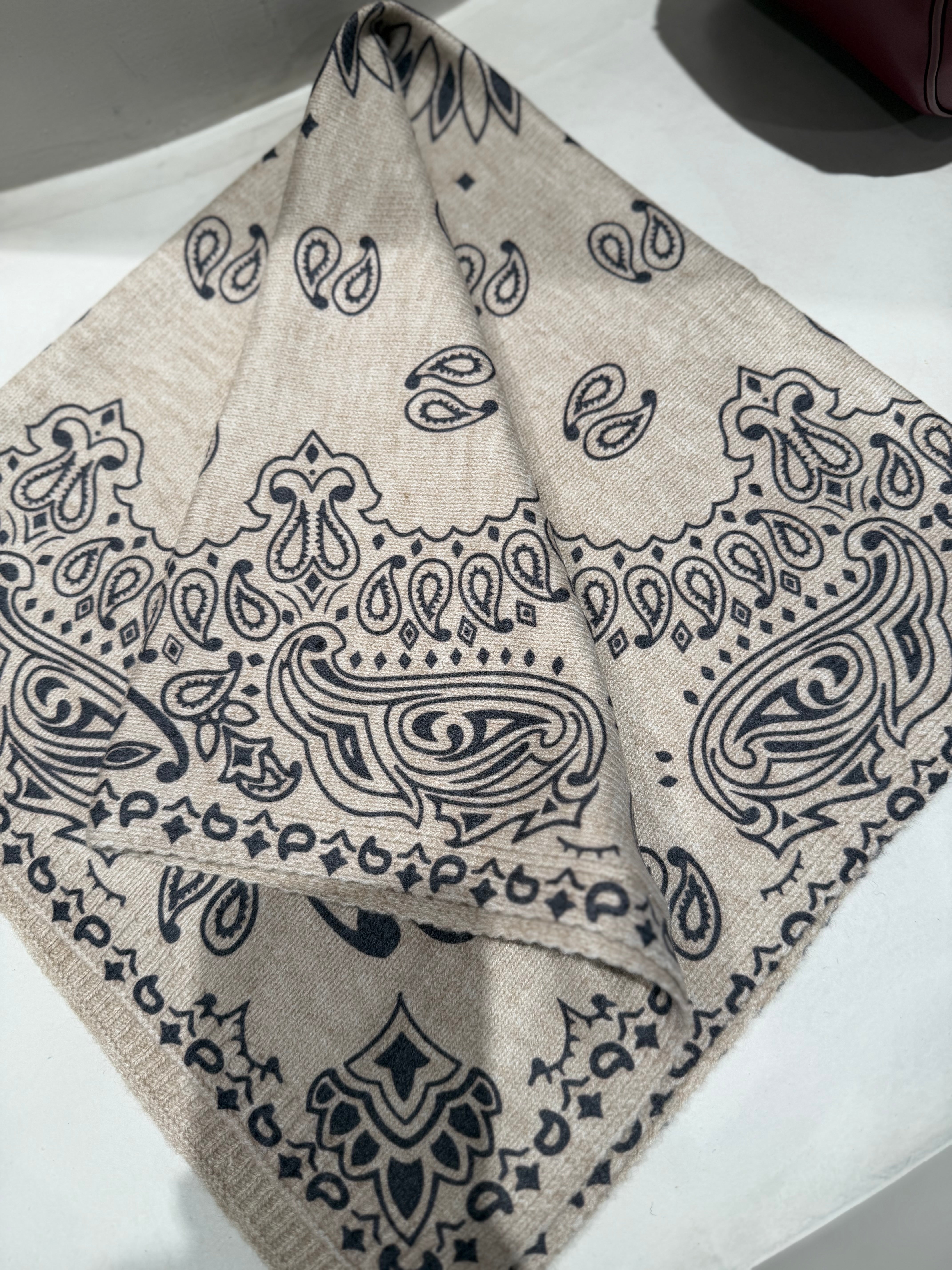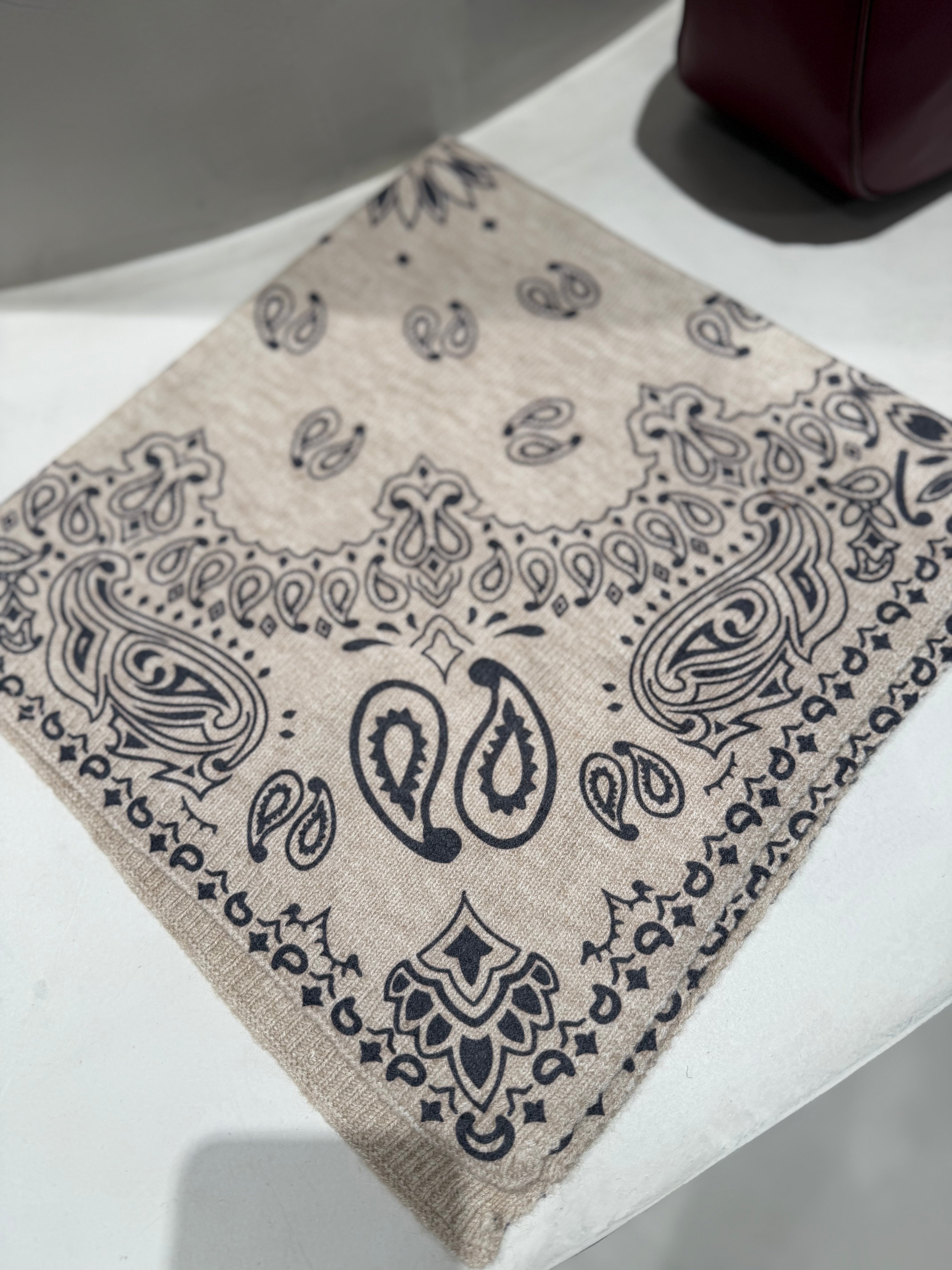 Lenço quadrado estampa bandana é feito em malha macia e aconchegante (48% viscose, 30% poliéster 28% poliamida) oferecendo leveza e aquecimento na medida certa. O formato triangular facilita o styling: use como cachecol, xale ou ponto de destaque sobre casacos e tricots. Versátil, estiloso e perfeito para elevar qualquer look com um toque moderno e confortável.