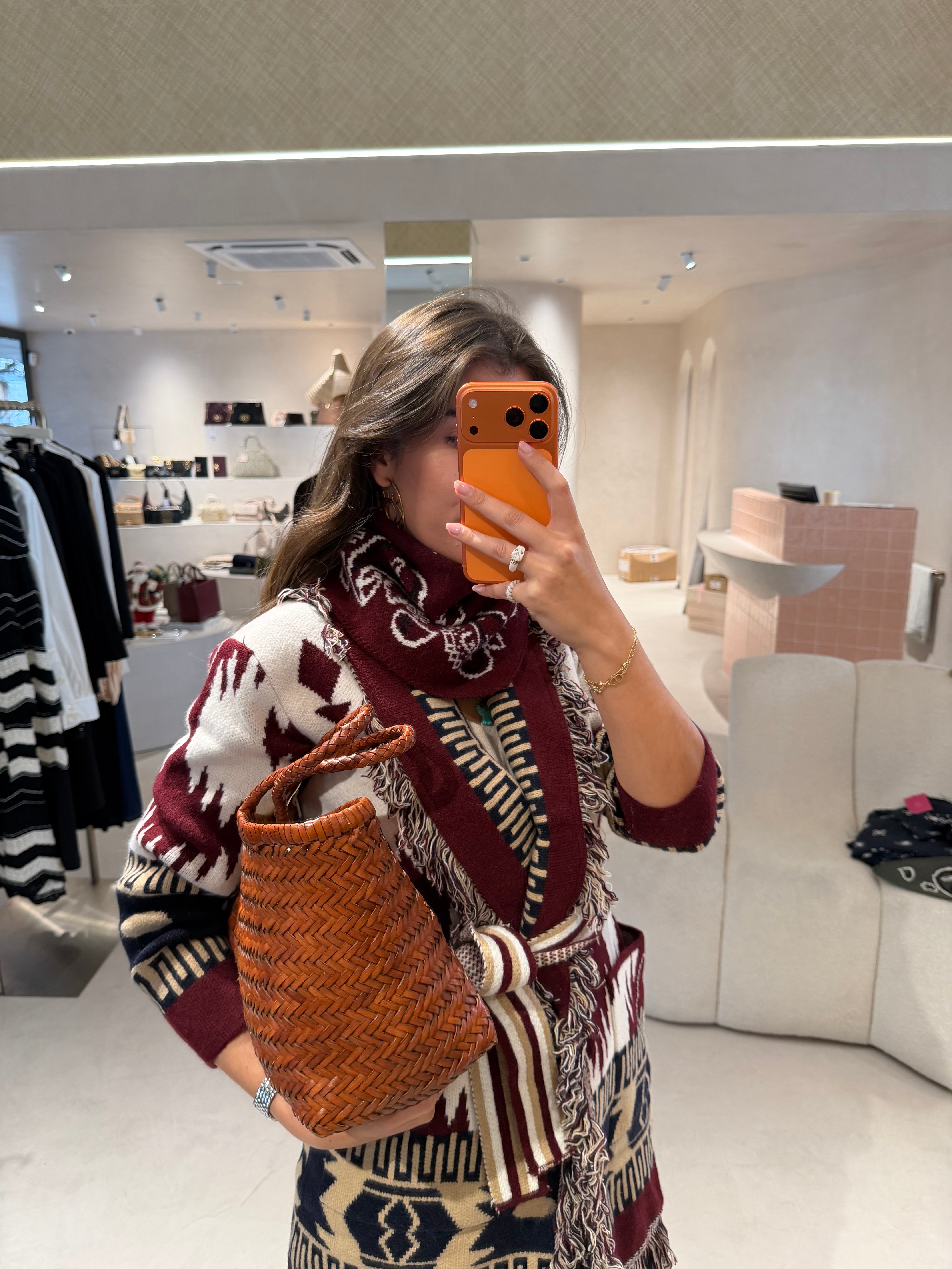 Este lenço triangular estampa bandana é feito em malha macia e aconchegante (40% viscose, 30% poliamida, 20% lã e 10% caxemira), oferecendo leveza e aquecimento na medida certa. O formato triangular facilita o styling: use como cachecol, xale ou ponto de destaque sobre casacos e tricots. Versátil, estiloso e perfeito para elevar qualquer look com um toque moderno e confortável.