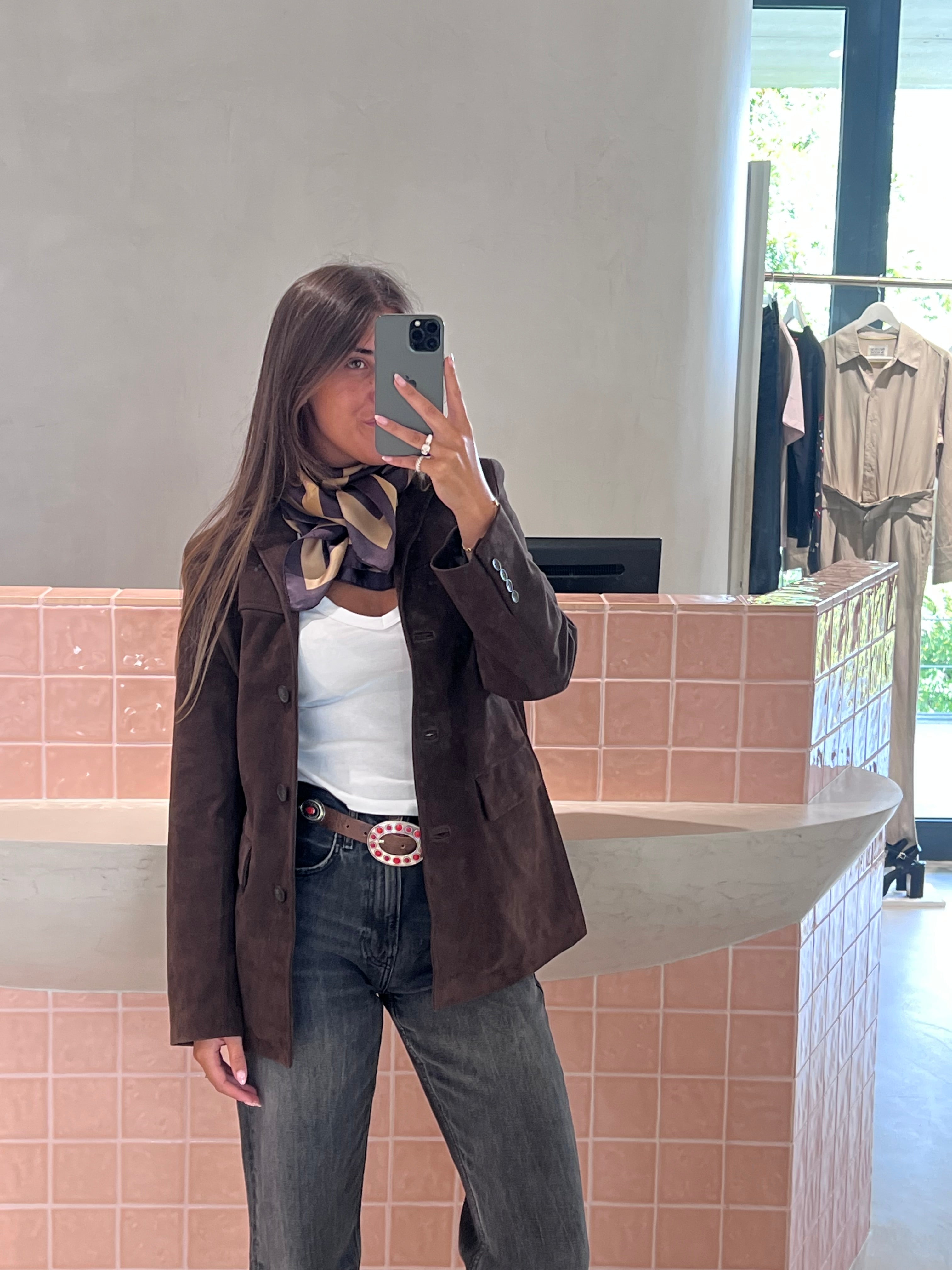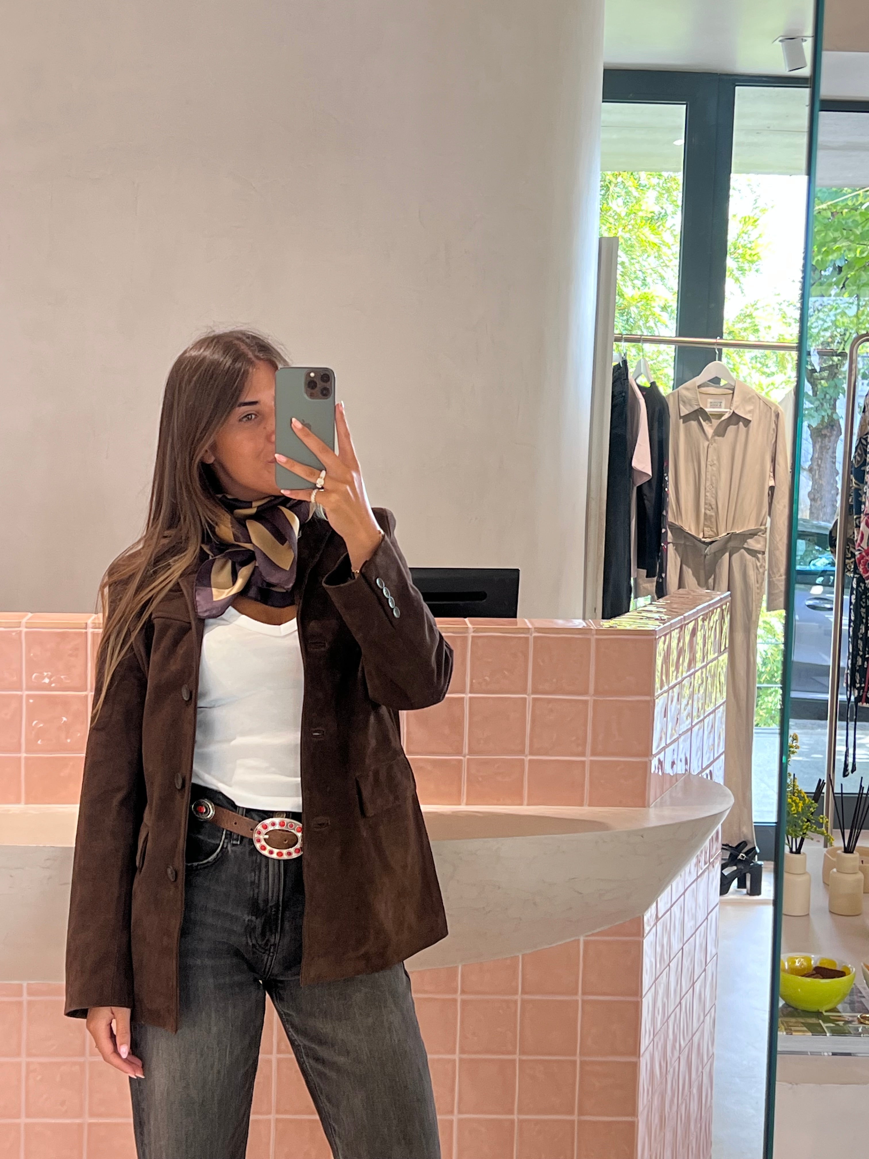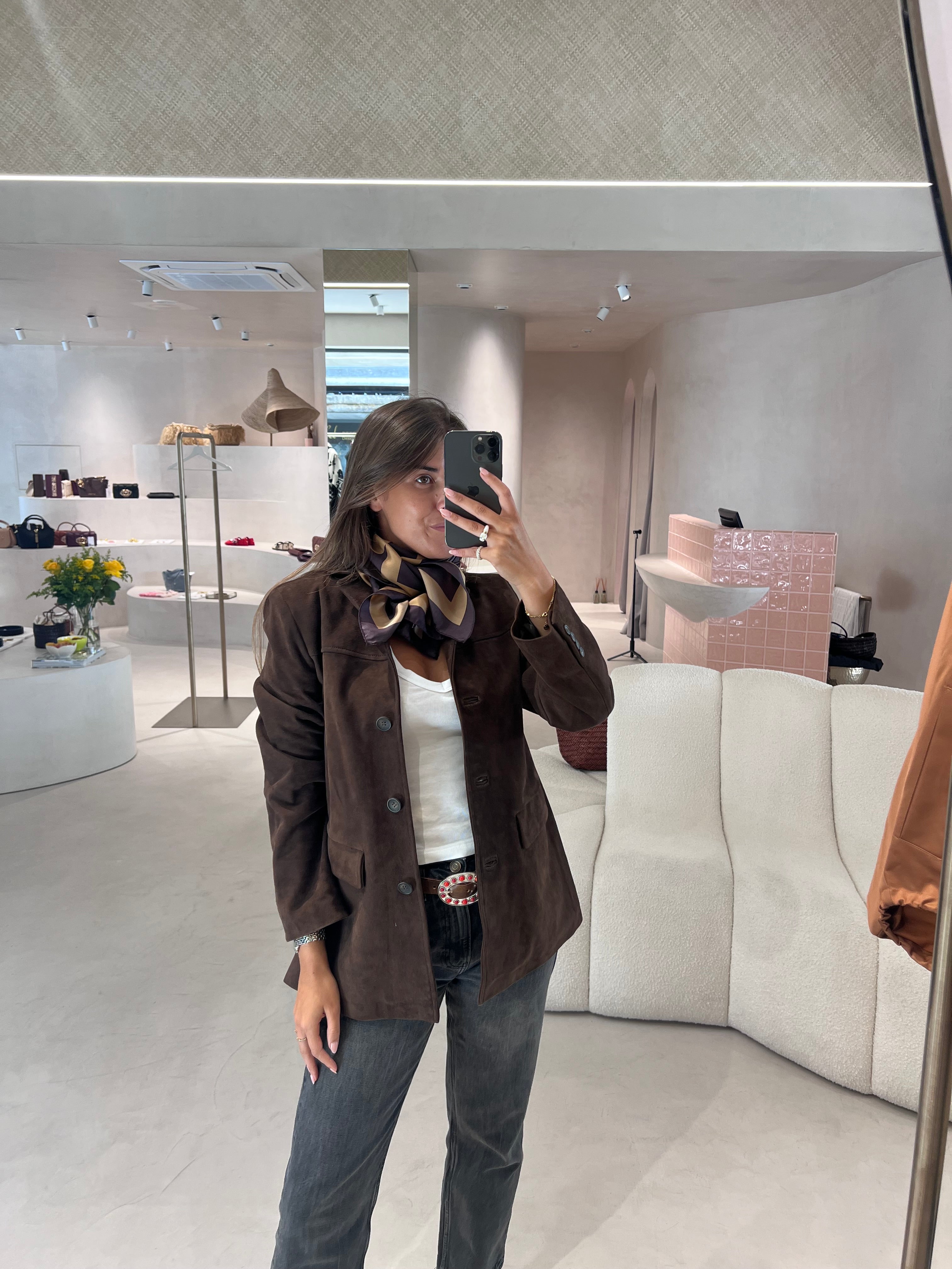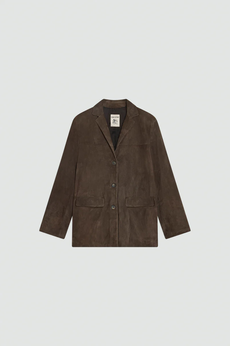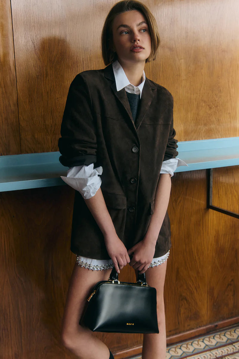 A Blazer Flora da Semicouture é uma peça em camurça que combina elegância intemporal com um toque moderno. Feita em 100% couro, tem um corte regular que assenta bem no corpo e um comprimento que chega à anca — ideal para usar tanto em looks formais como em visuais mais descontraídos.
