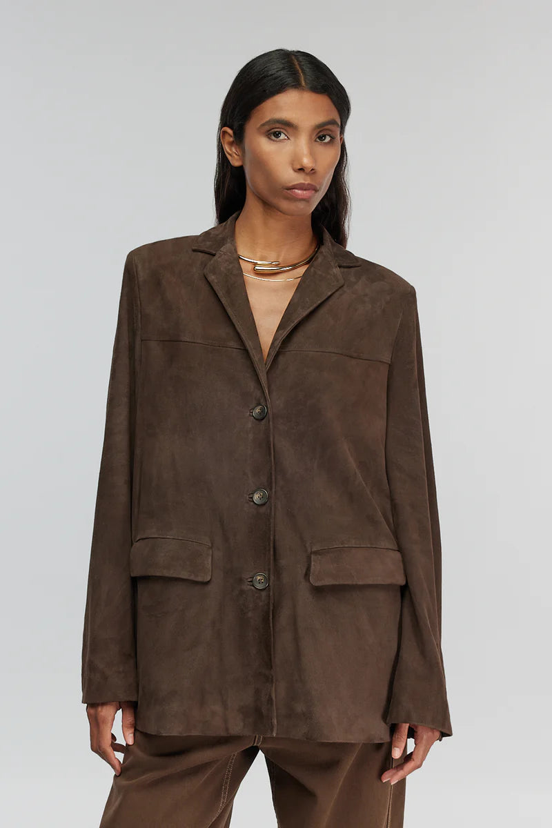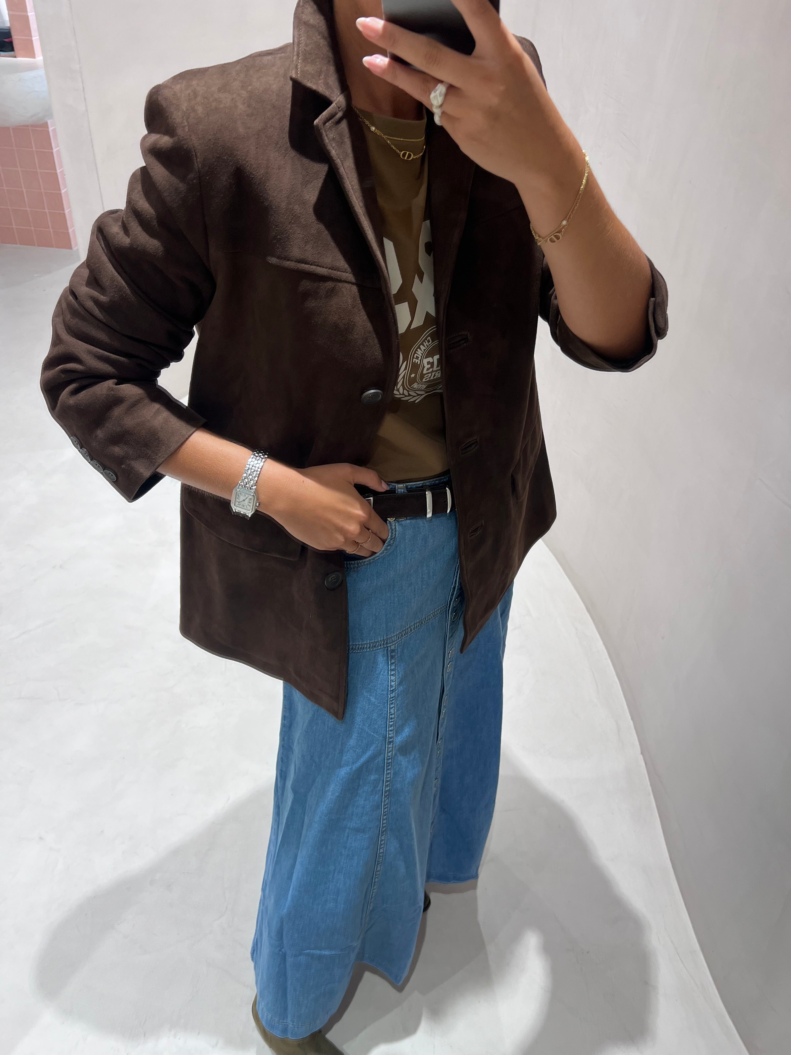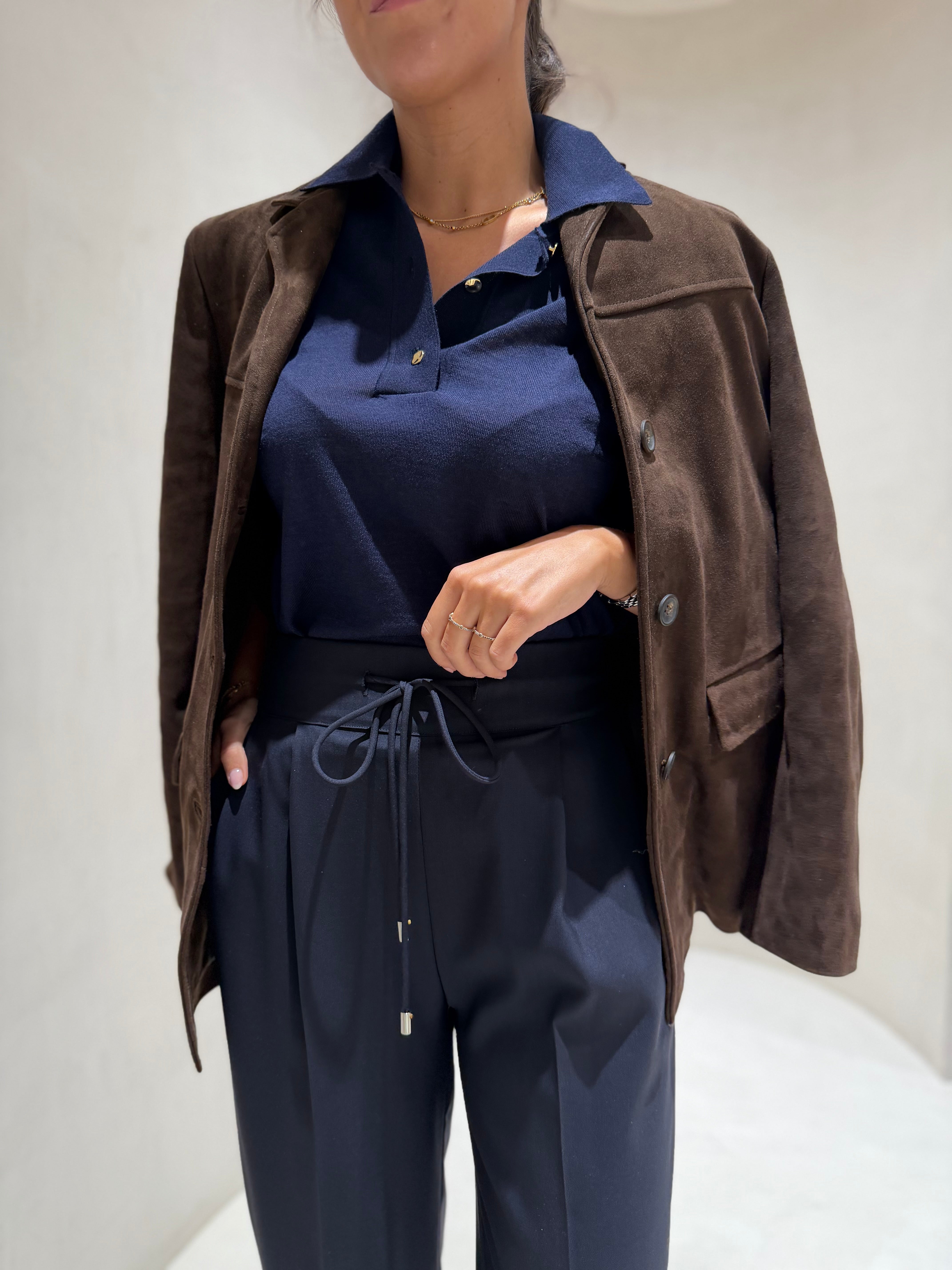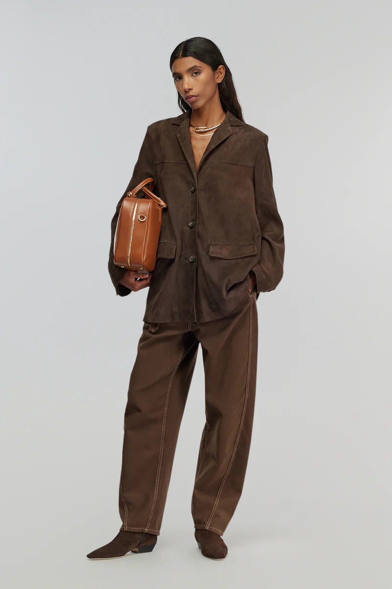 A Blazer Flora da Semicouture é uma peça em camurça que combina elegância intemporal com um toque moderno. Feita em 100% couro, tem um corte regular que assenta bem no corpo e um comprimento que chega à anca — ideal para usar tanto em looks formais como em visuais mais descontraídos.