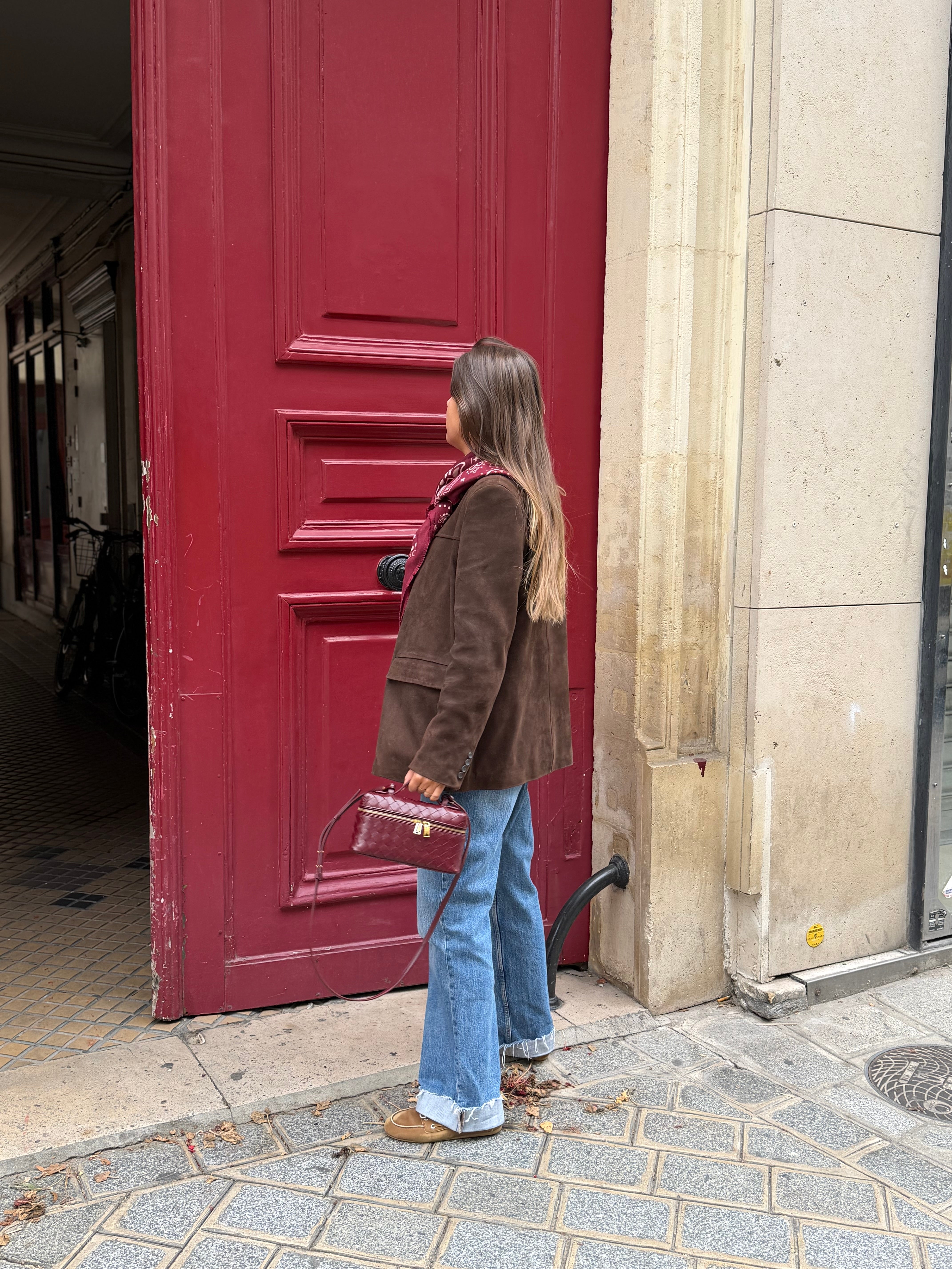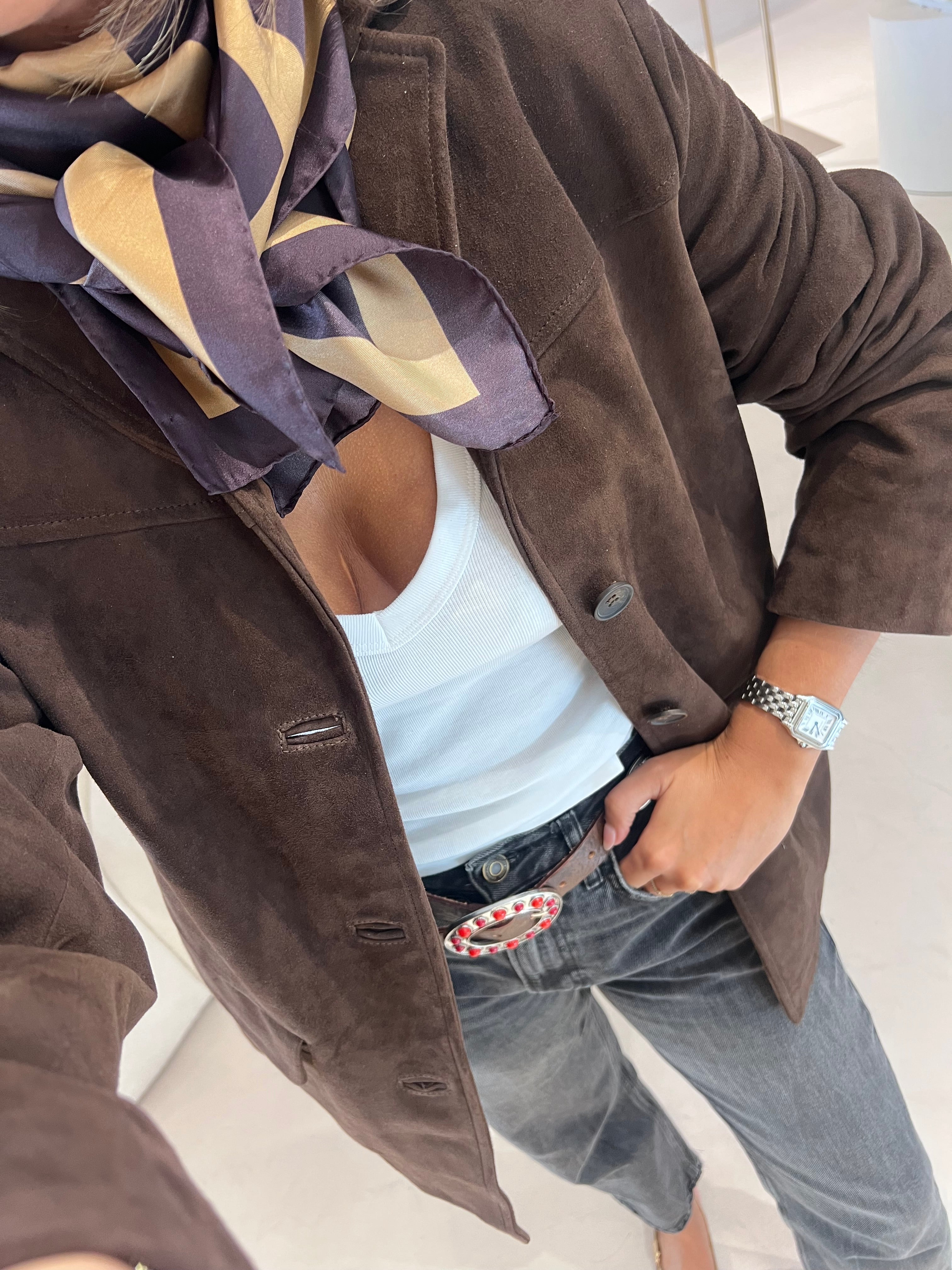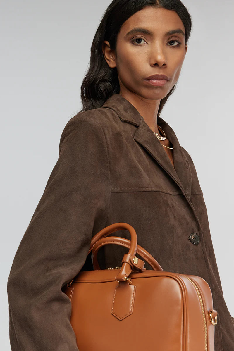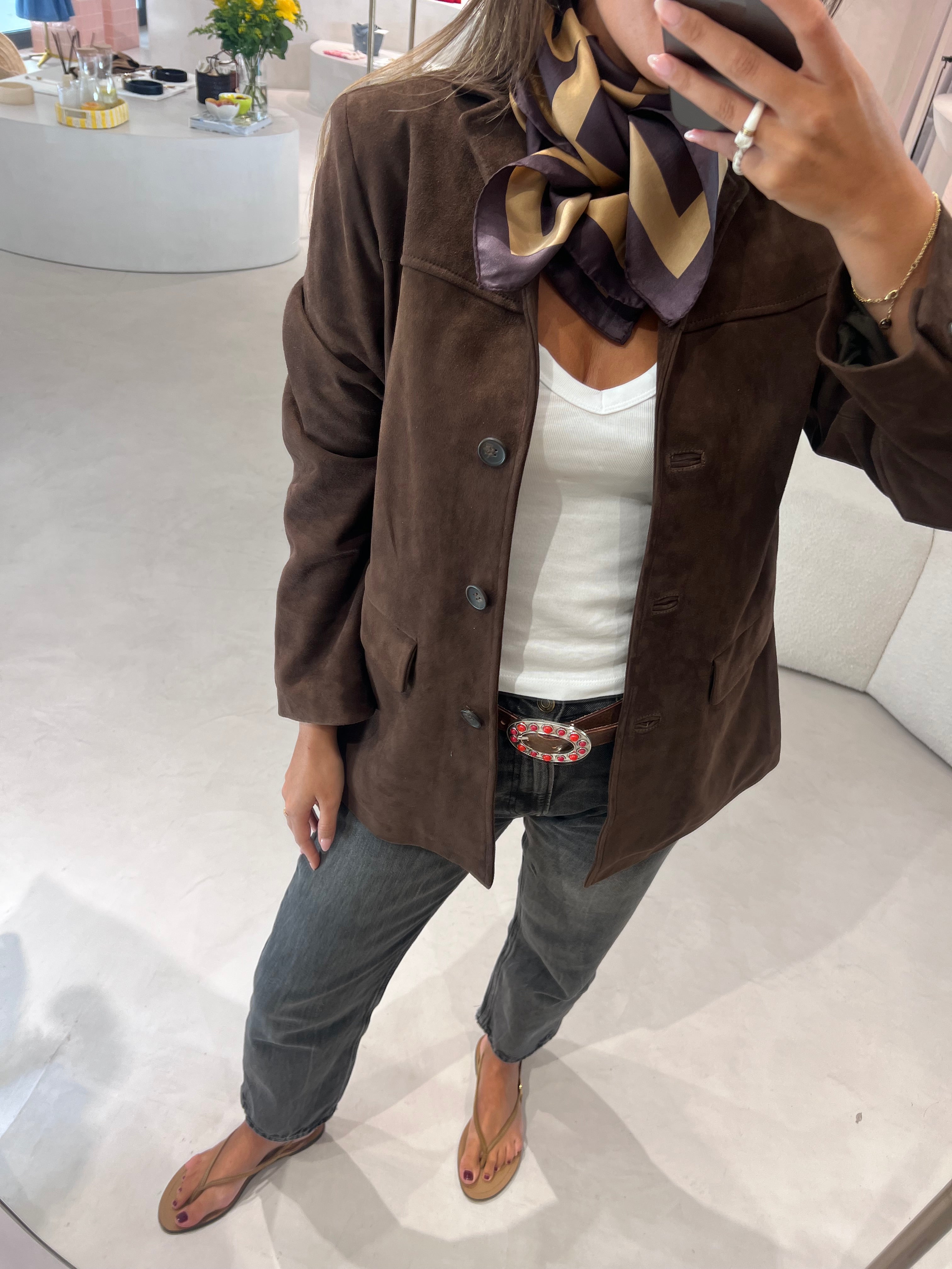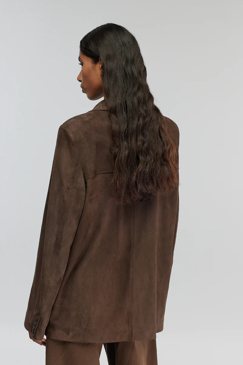 A Blazer Flora da Semicouture é uma peça em camurça que combina elegância intemporal com um toque moderno. Feita em 100% couro, tem um corte regular que assenta bem no corpo e um comprimento que chega à anca — ideal para usar tanto em looks formais como em visuais mais descontraídos.