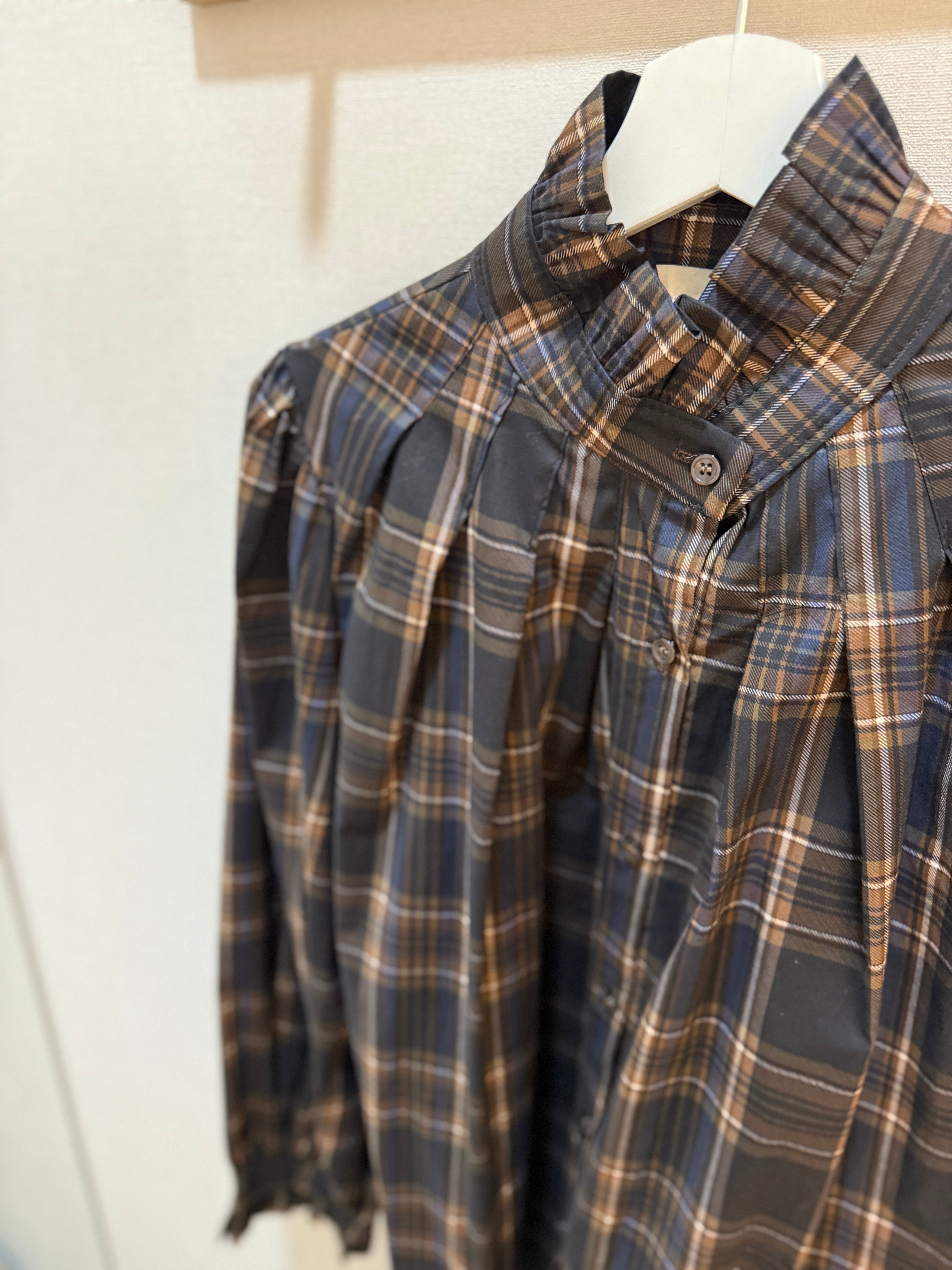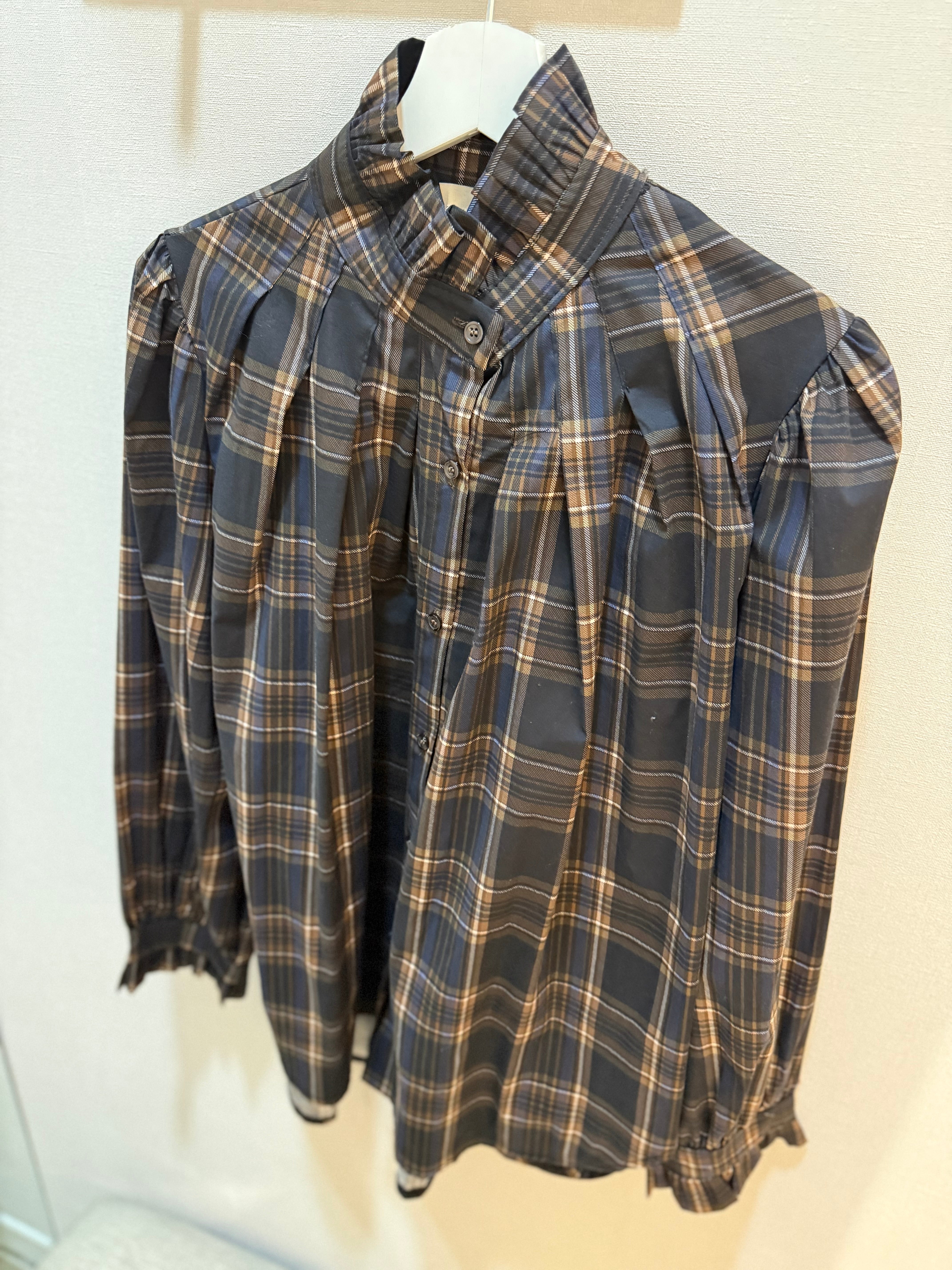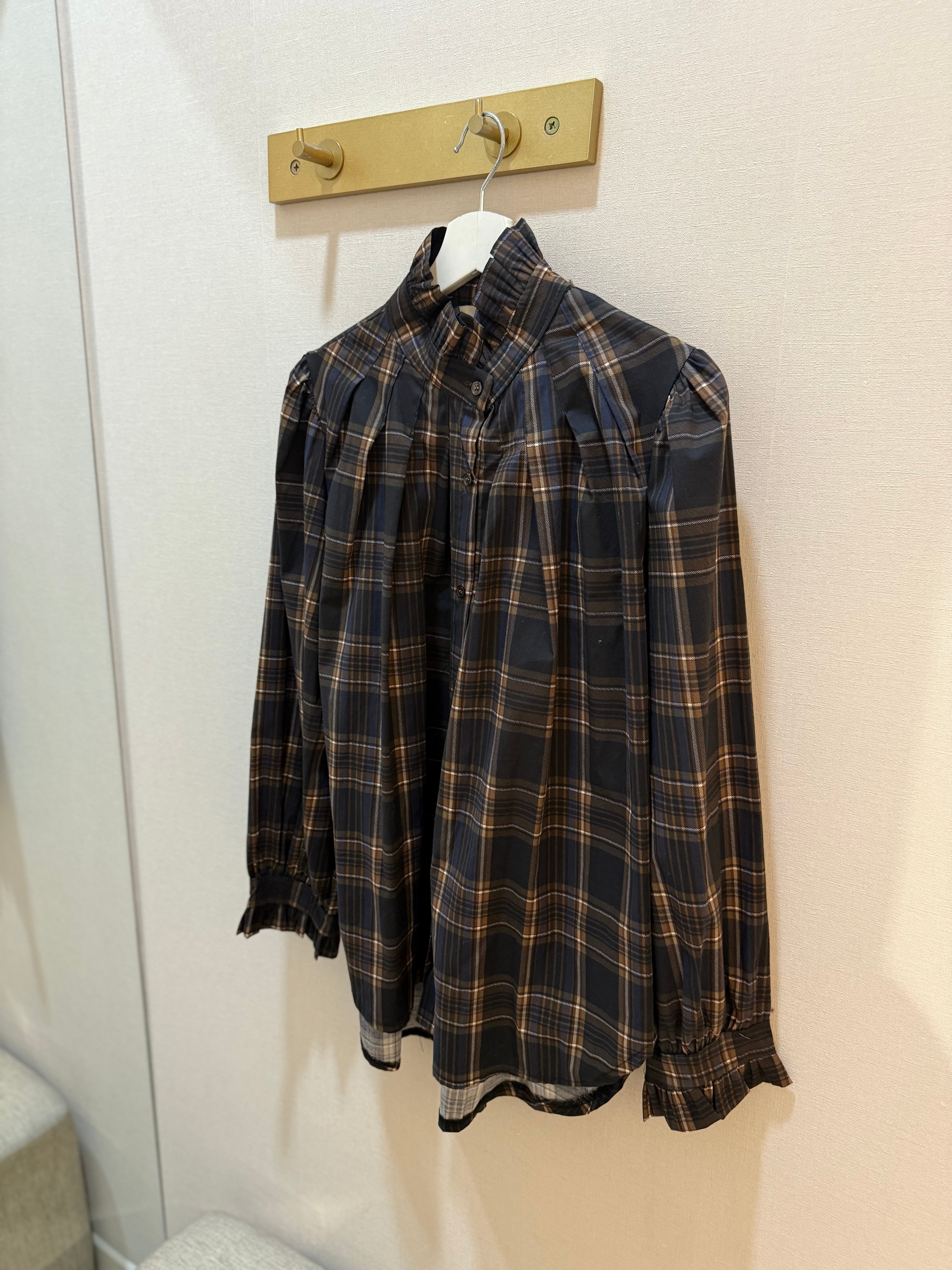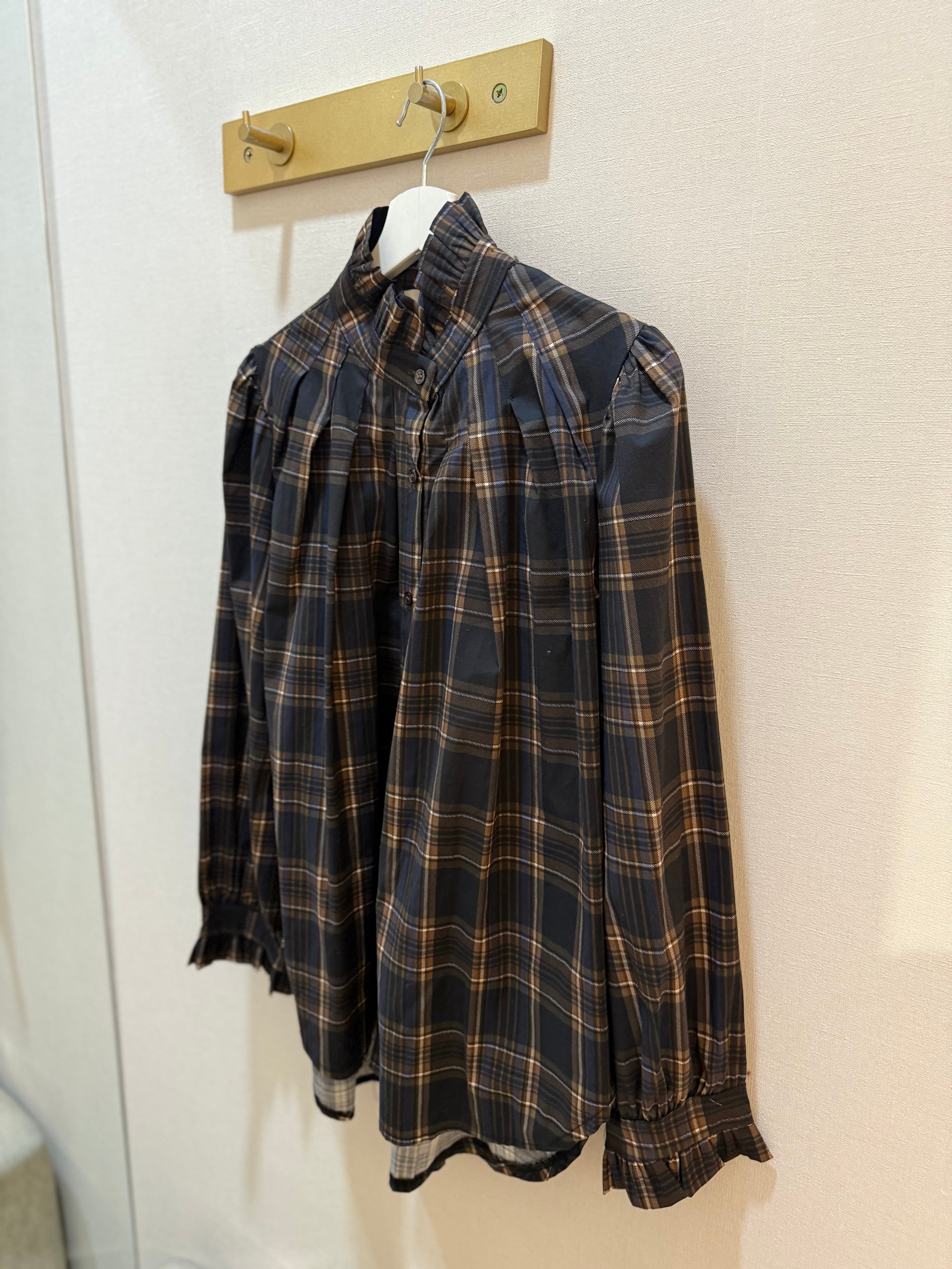 Blusa com Gola de Folhos Xadrez Castanho | VIOLETA