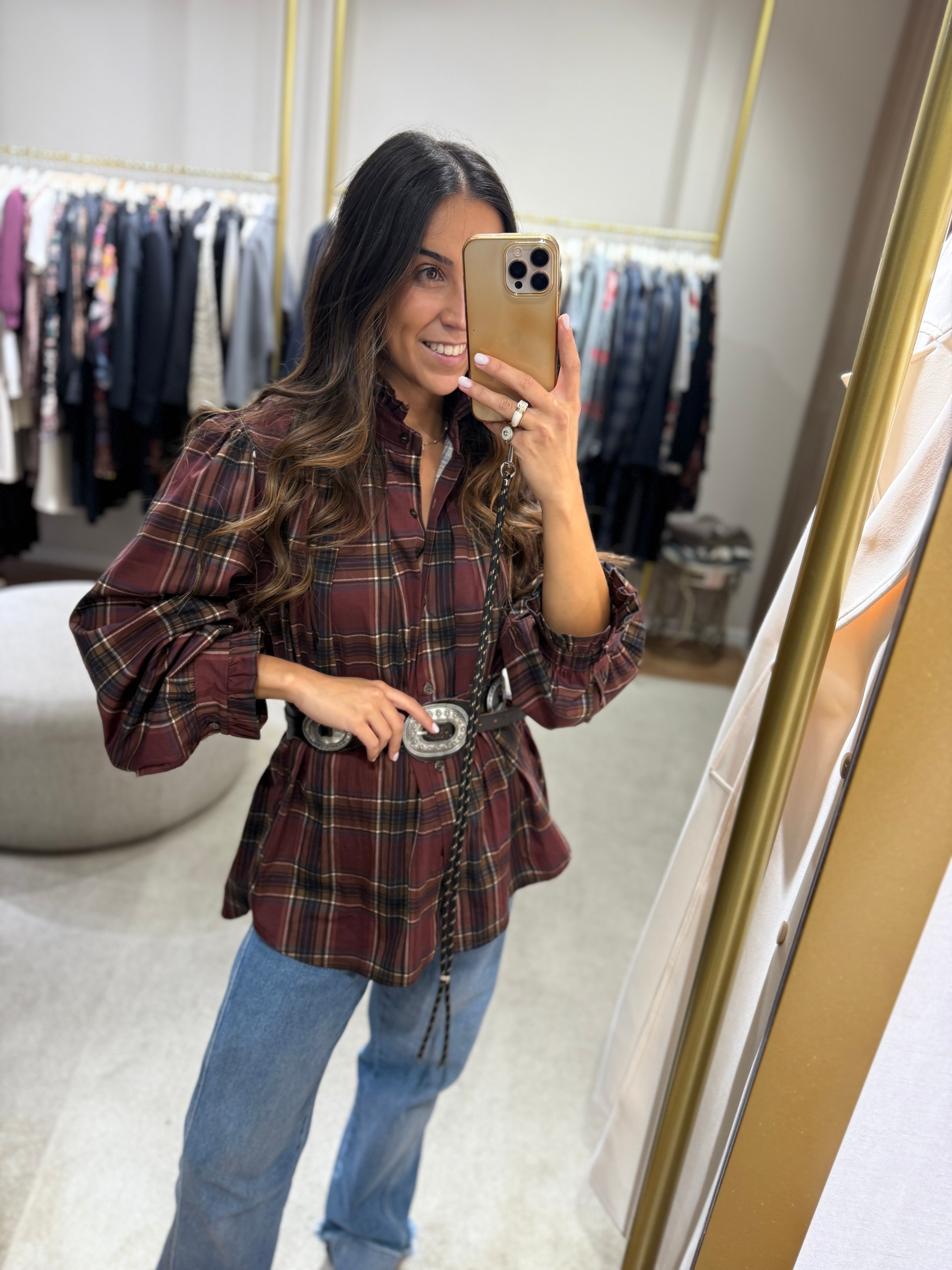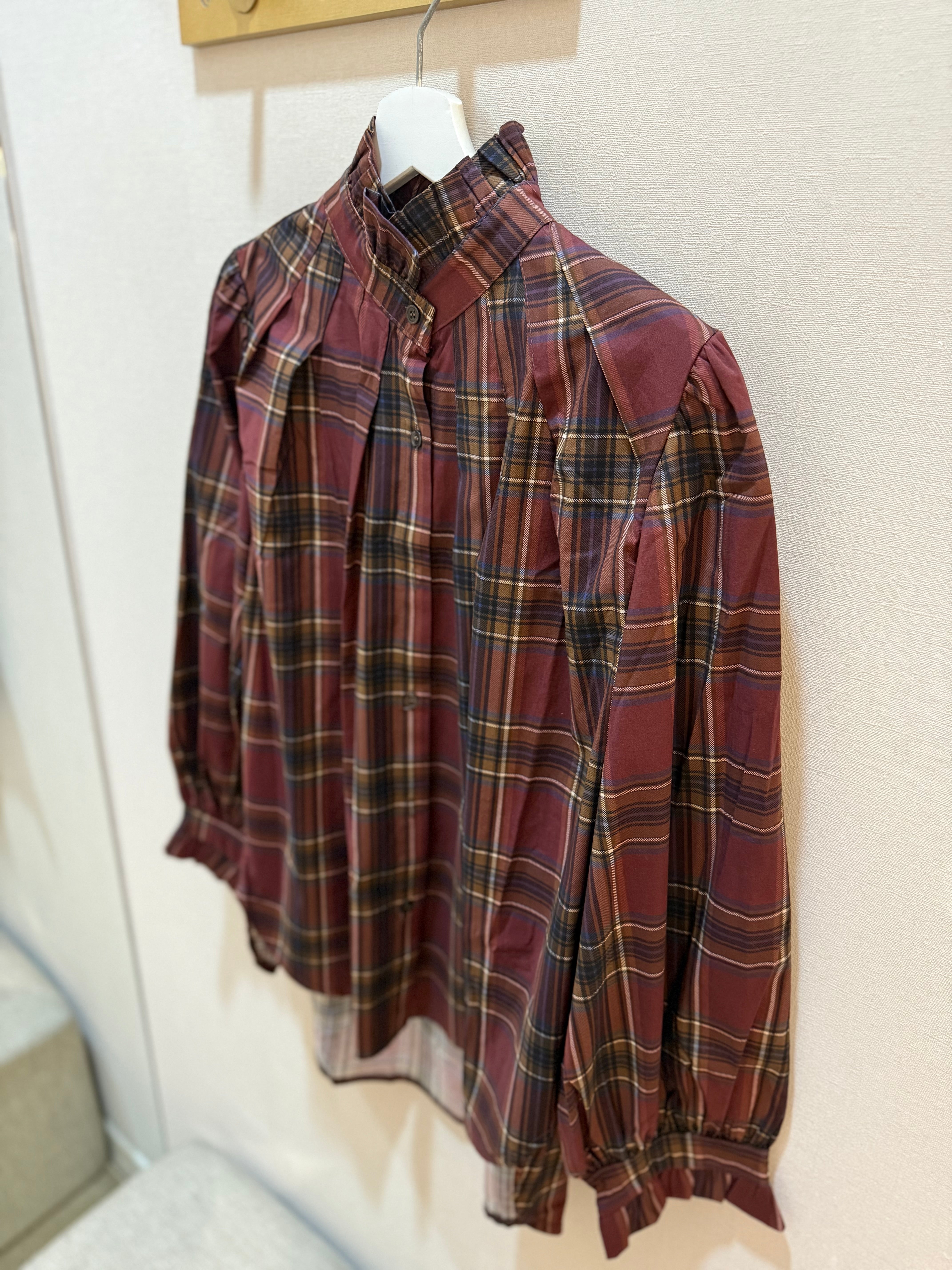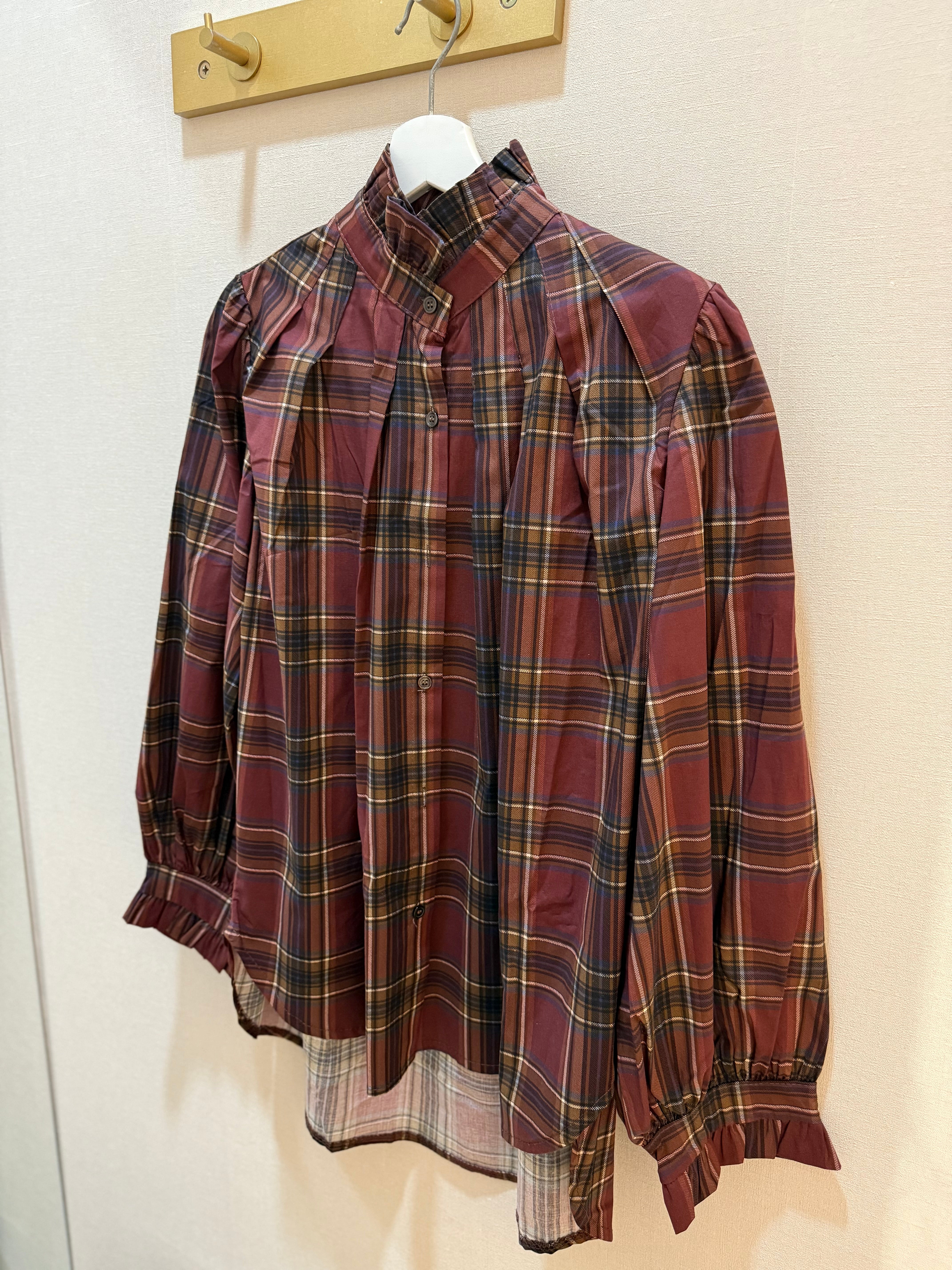 Blusa com Gola de Folhos Xadrez Bordeaux | VIOLETA