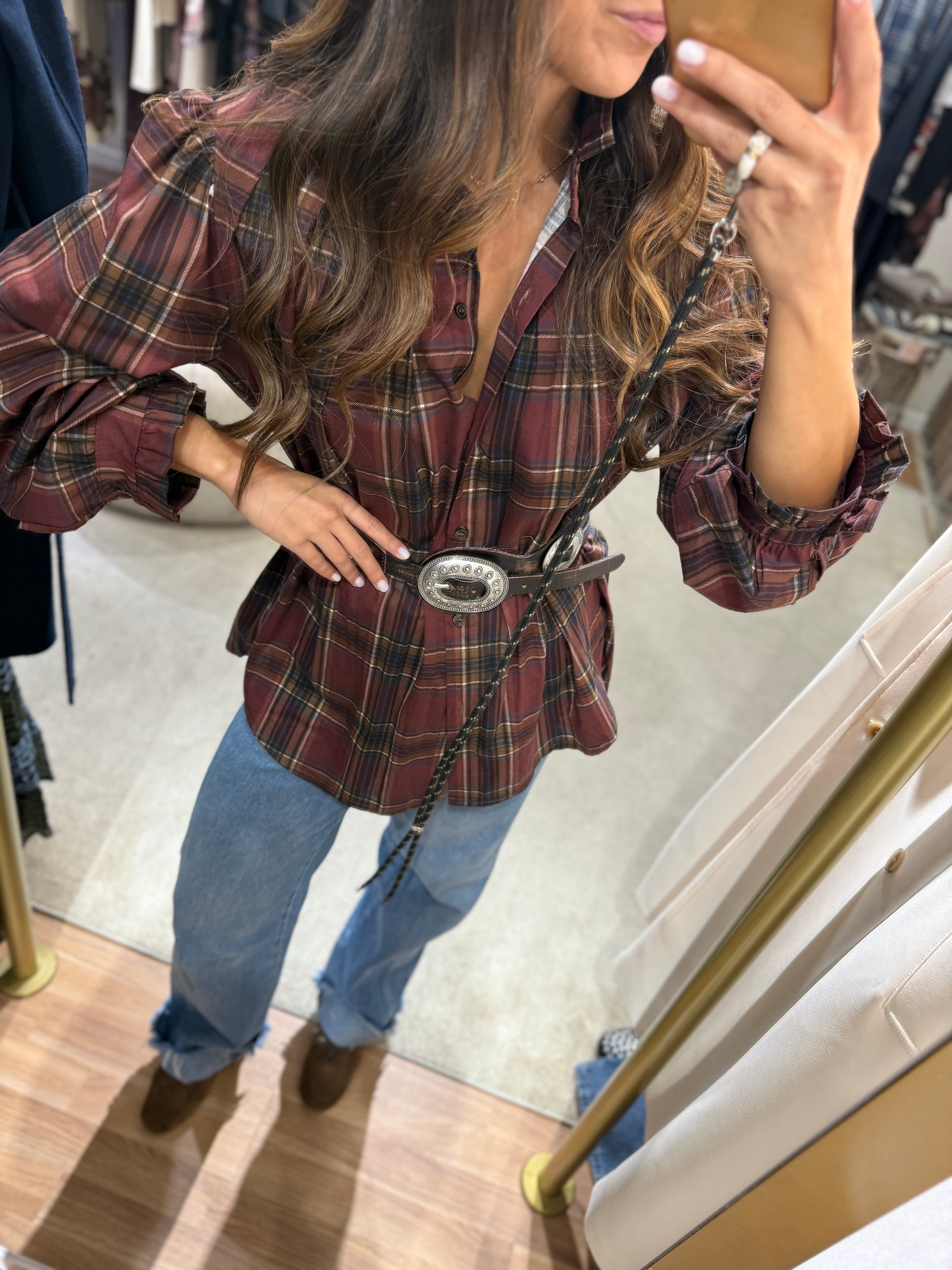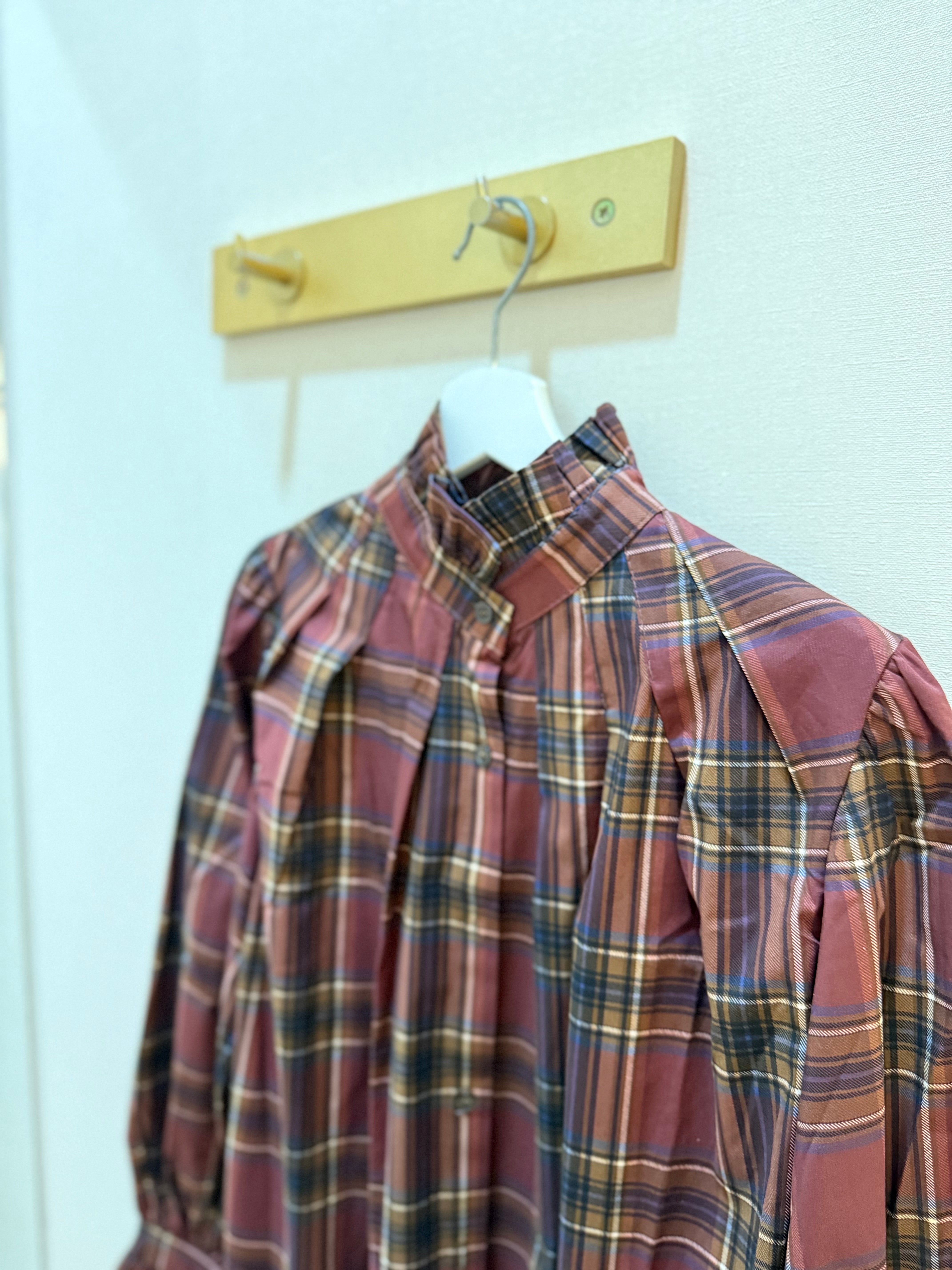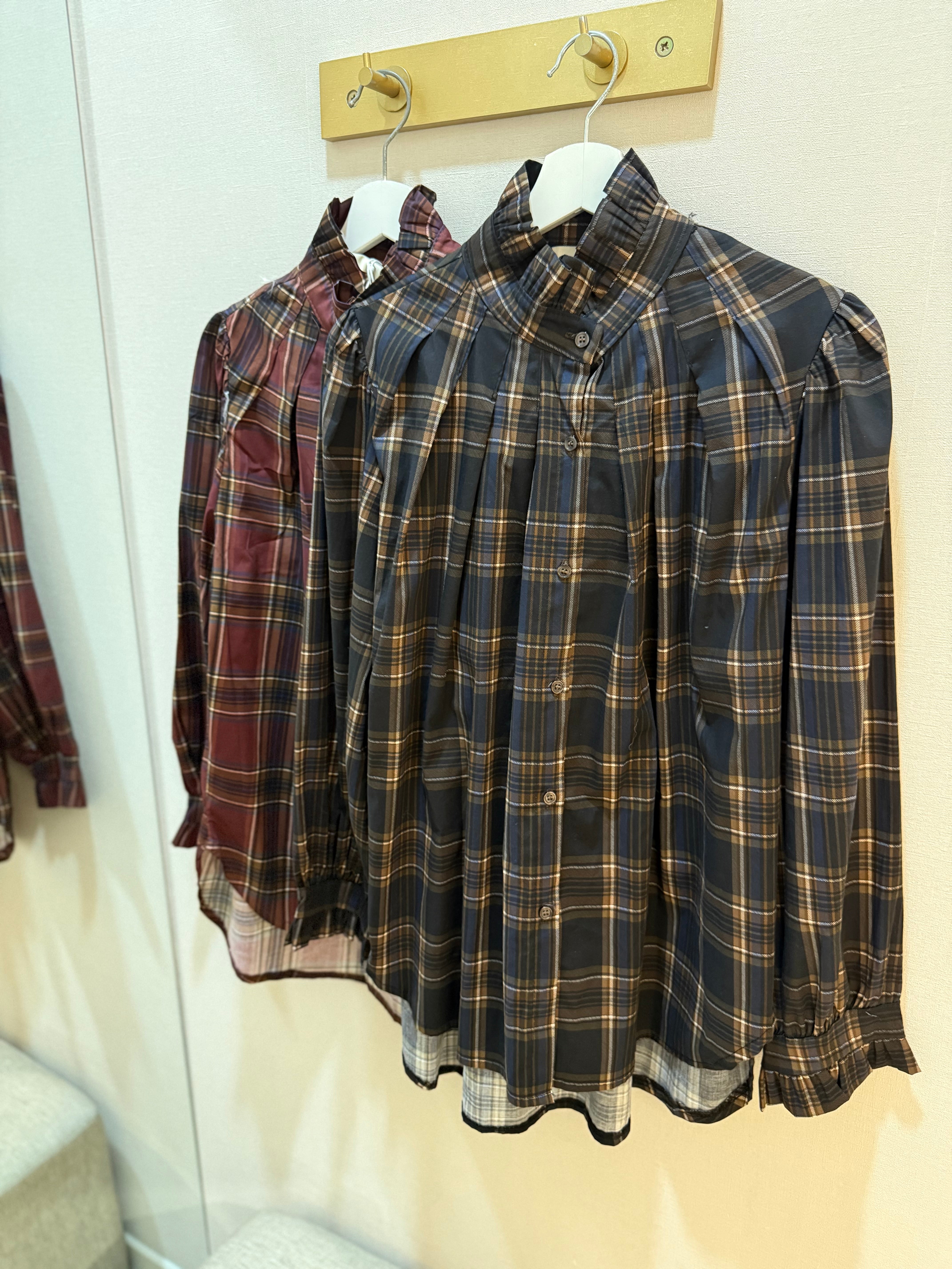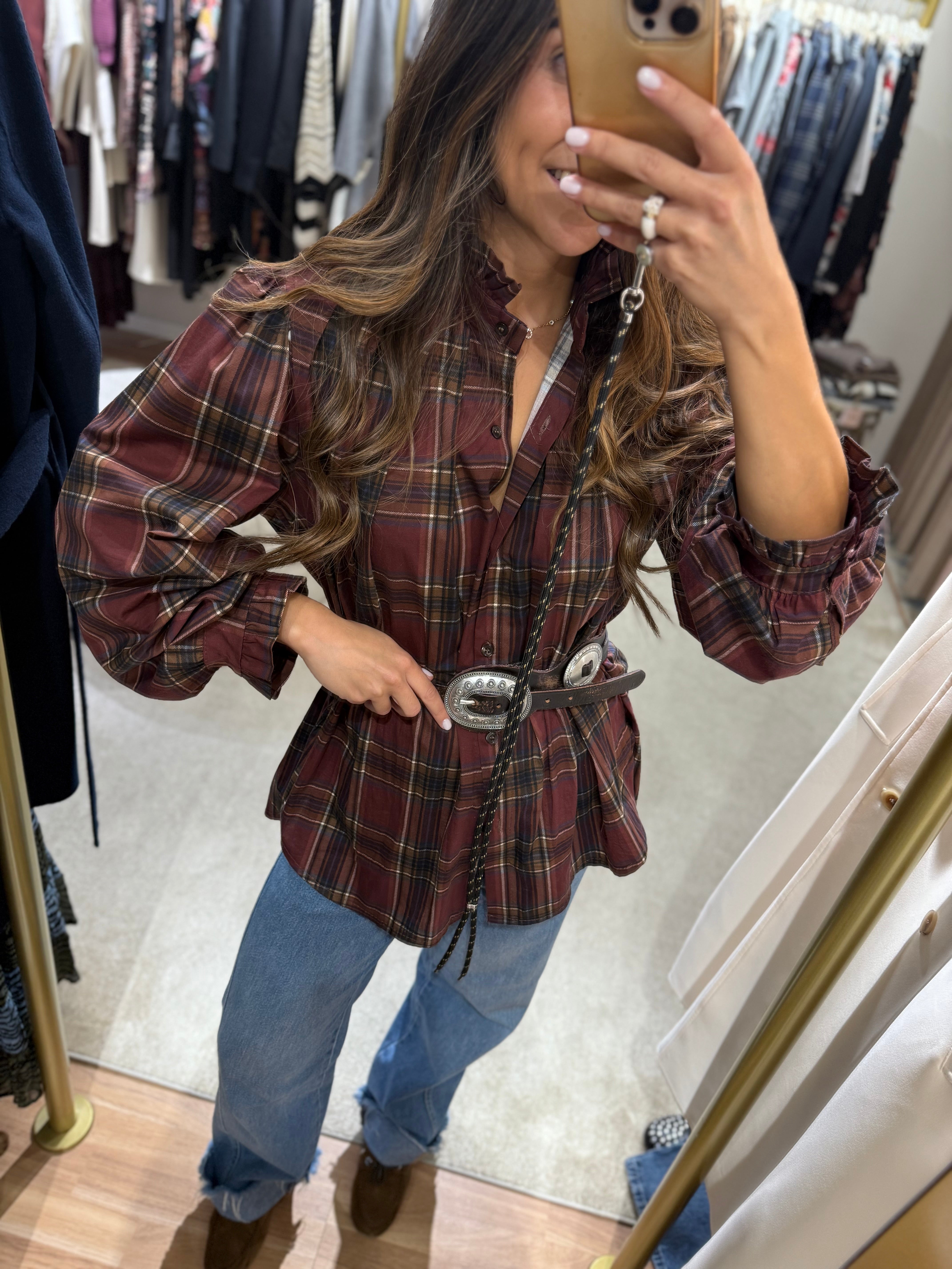 Blusa com Gola de Folhos Xadrez Bordeaux | VIOLETA