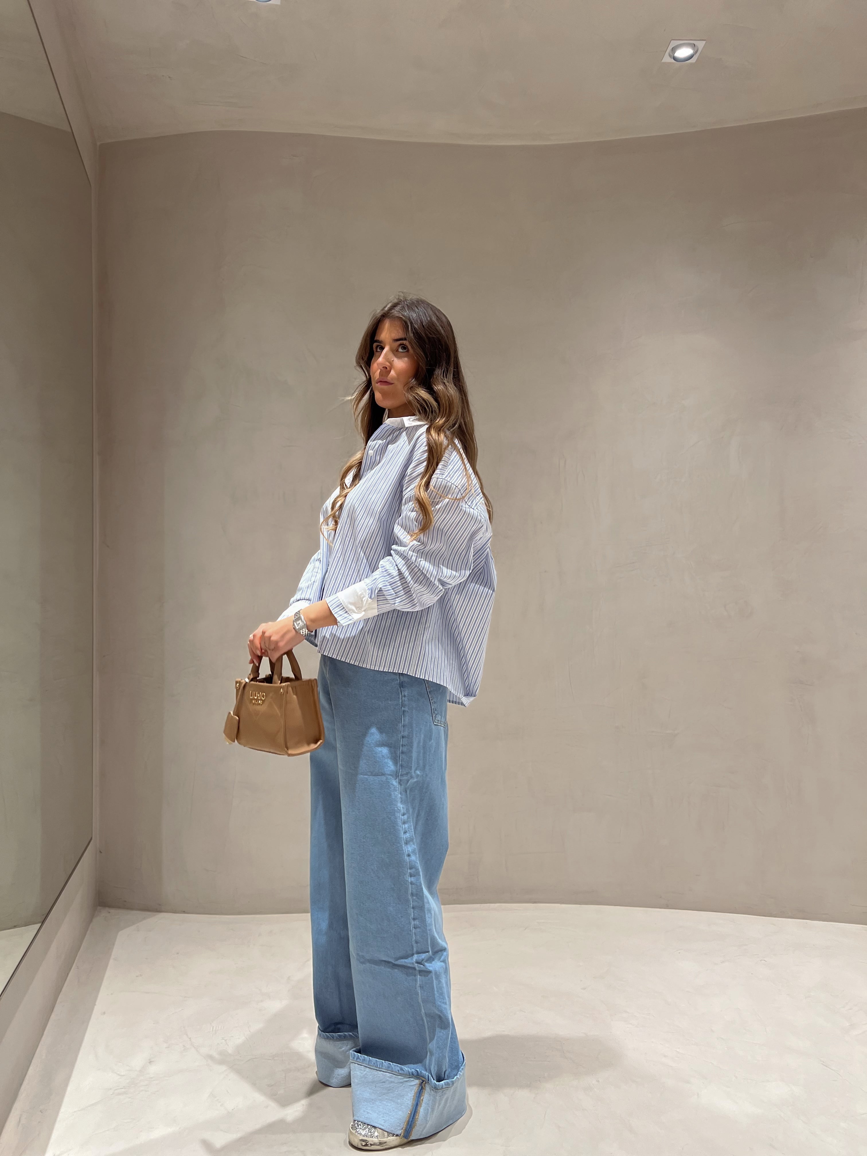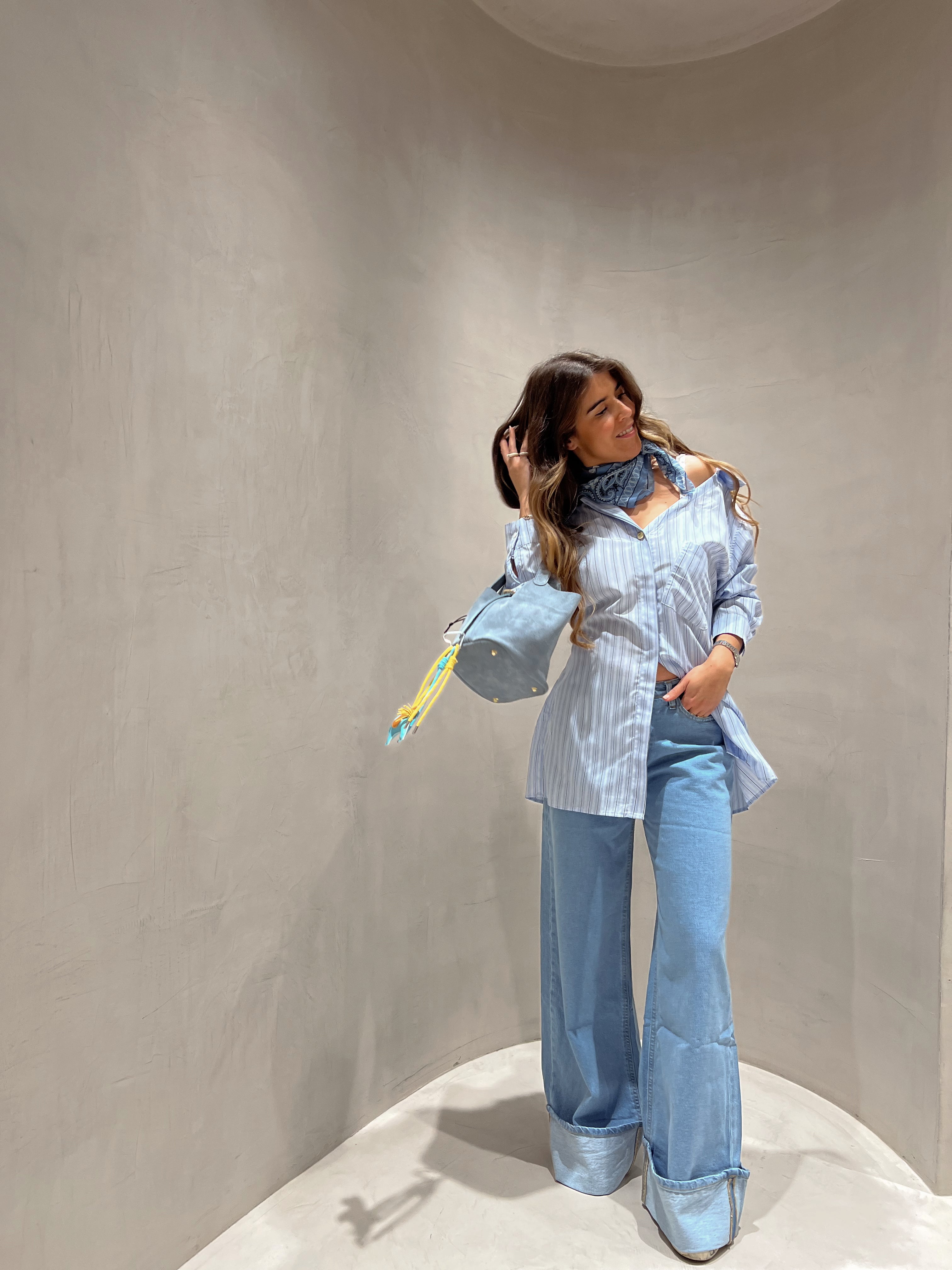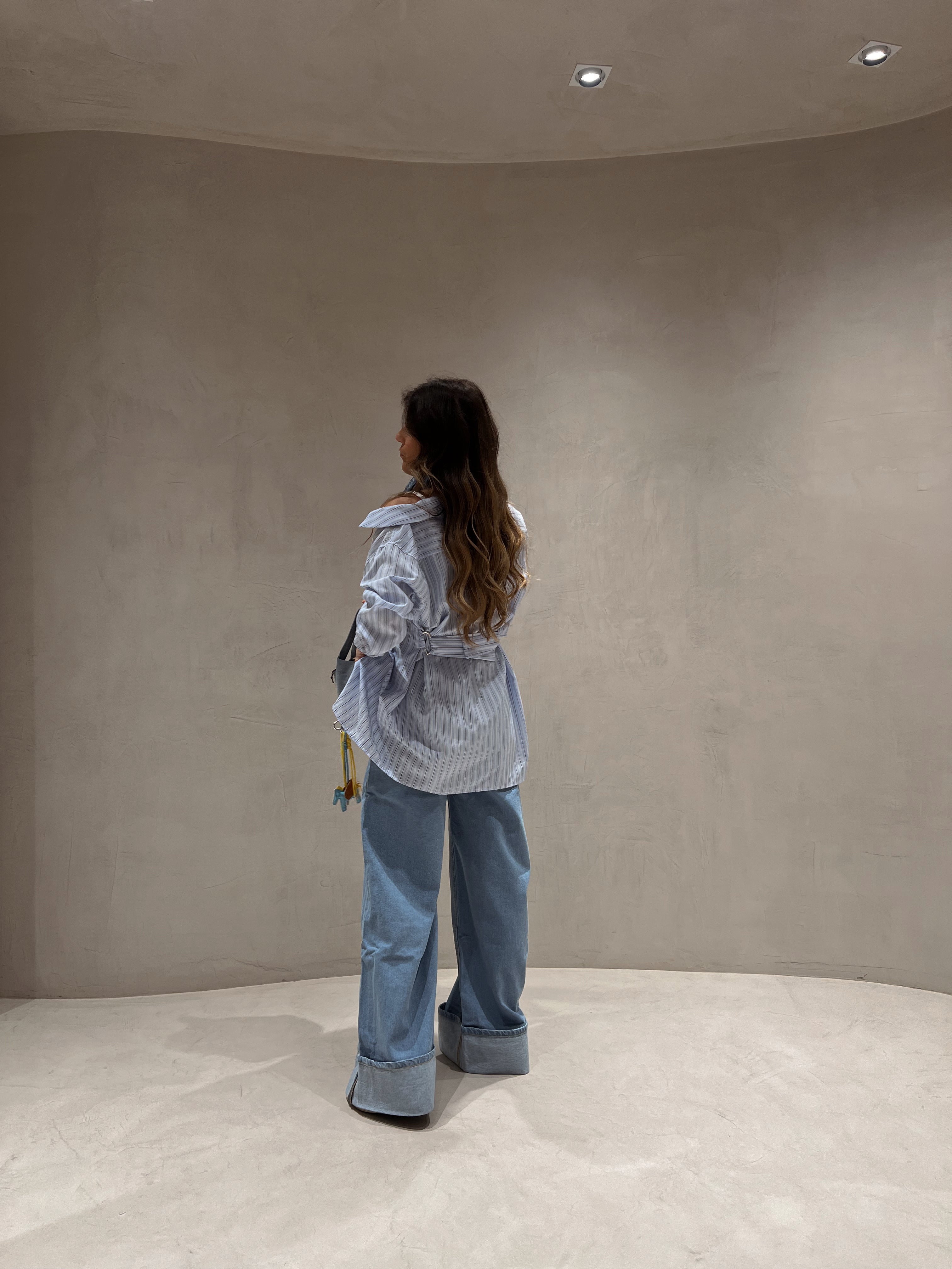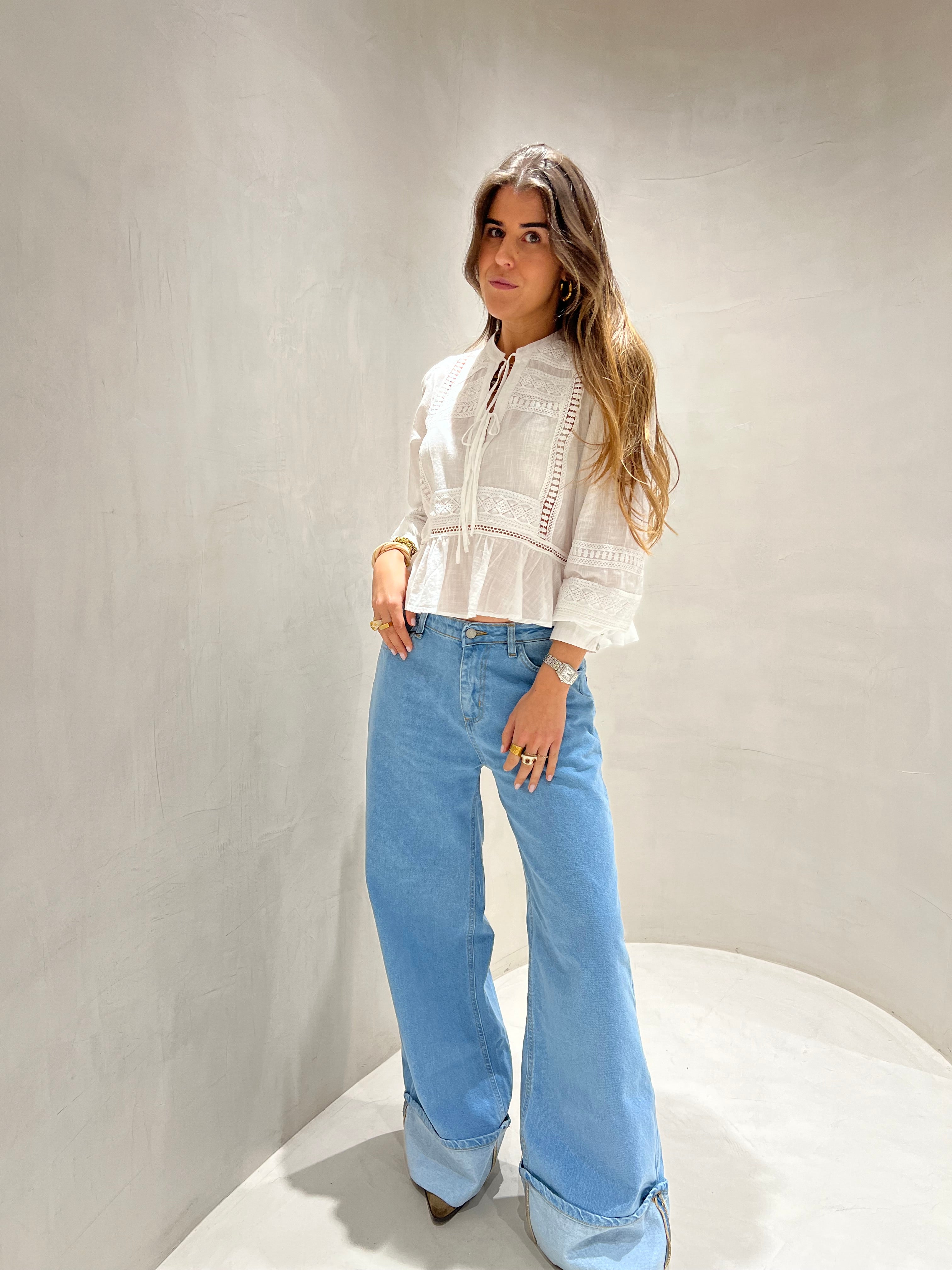 Calça de ganga wide leg clara com barra do avesso na bainha, presilhas para cinto.