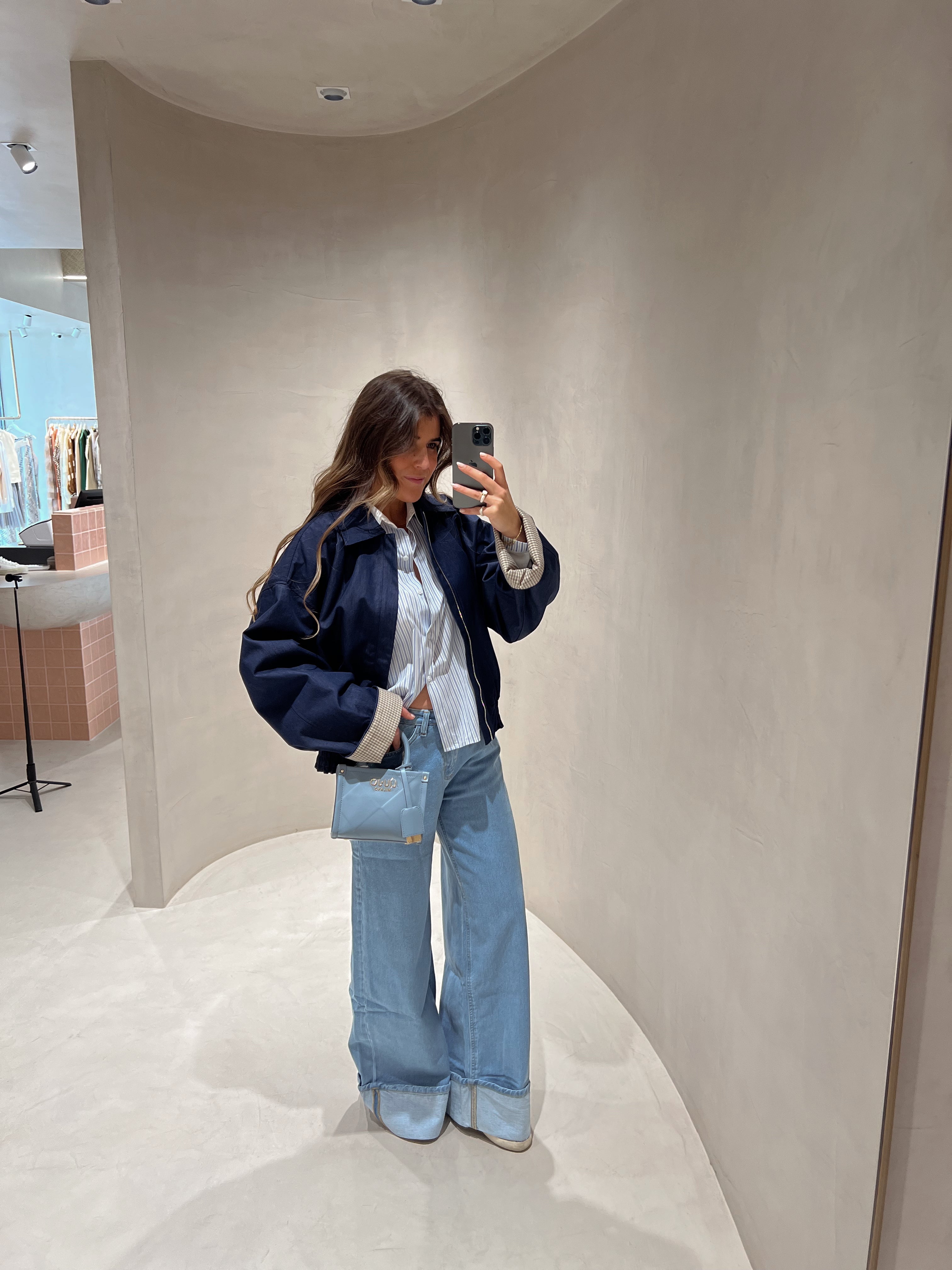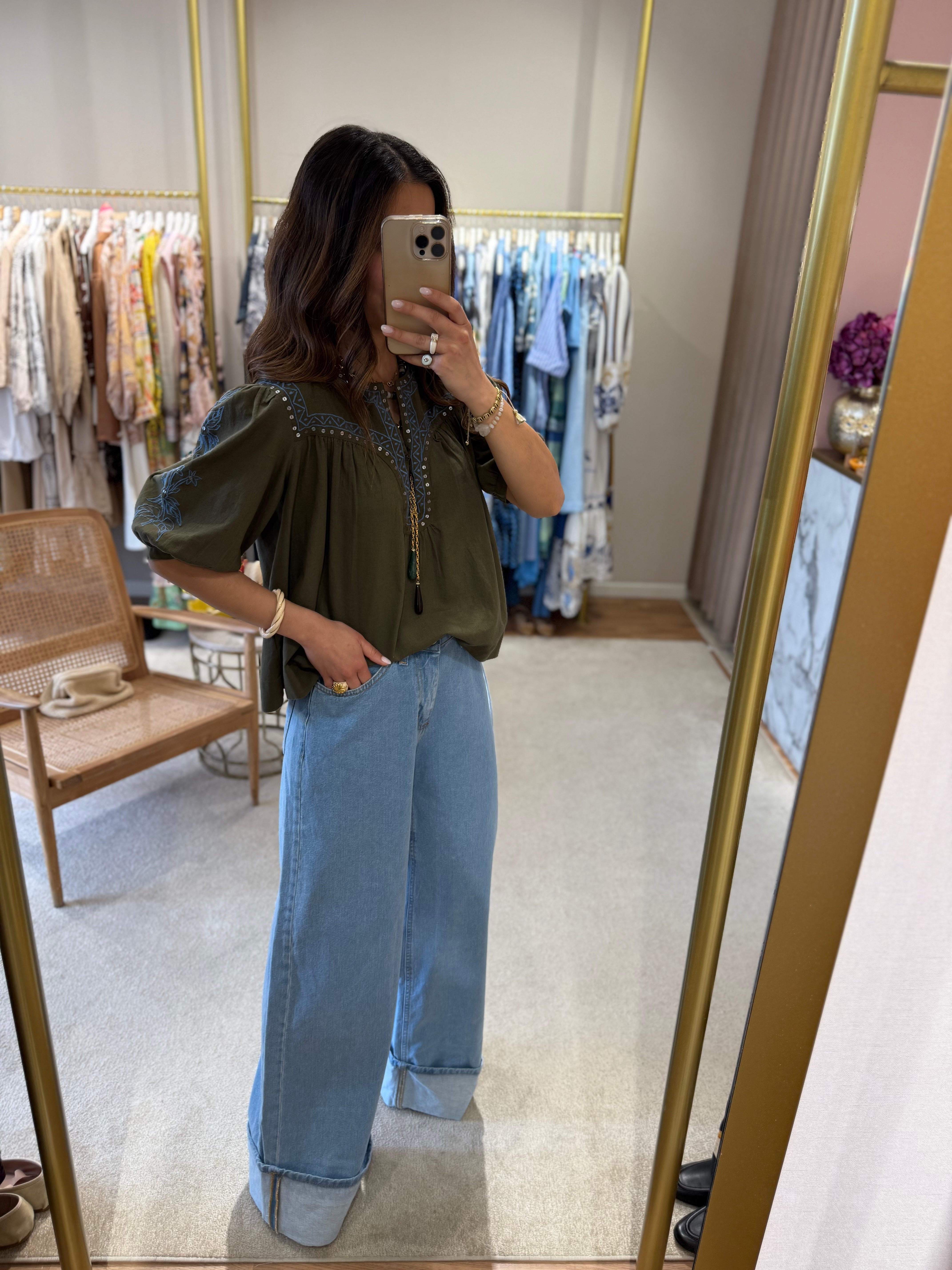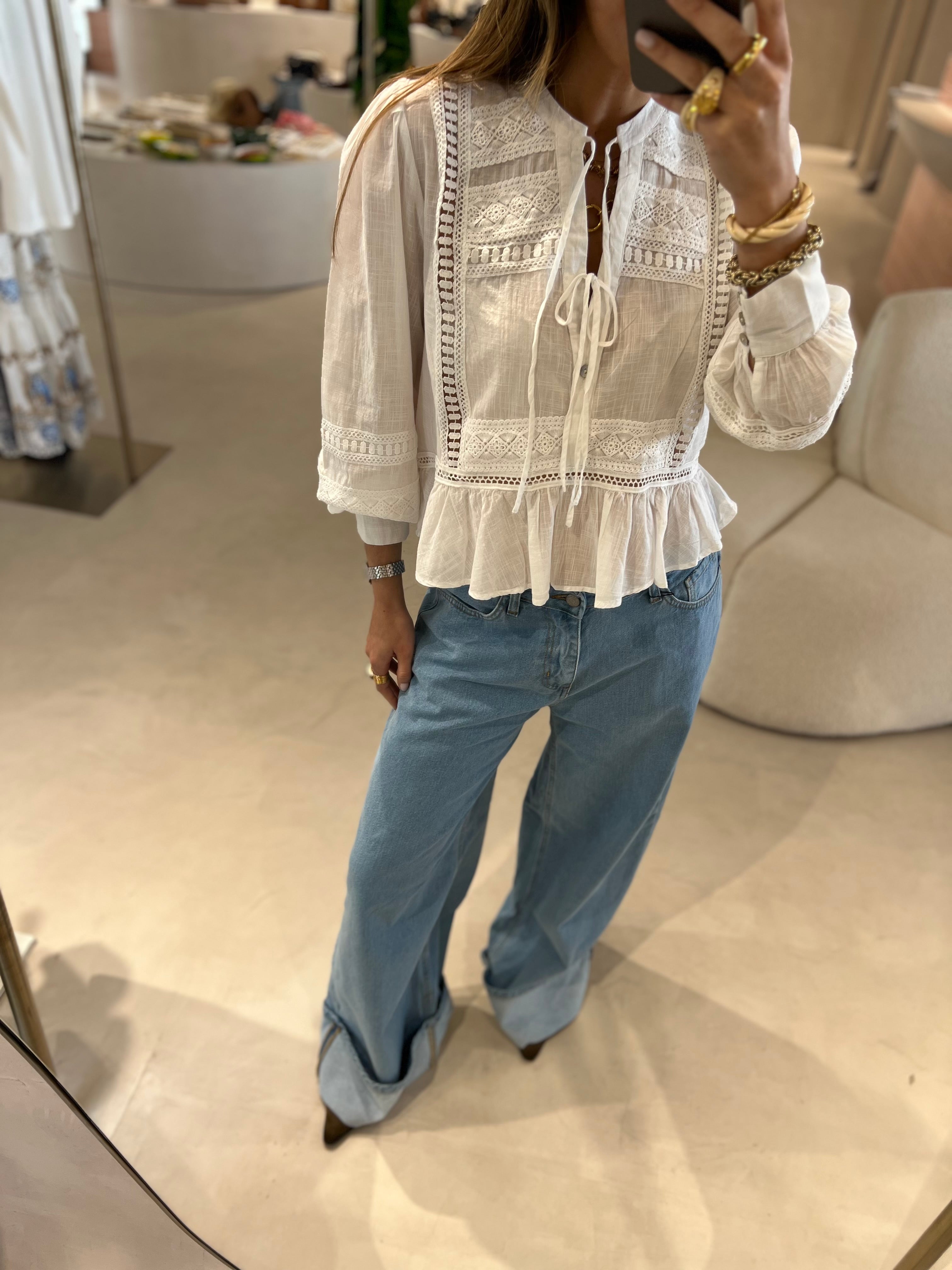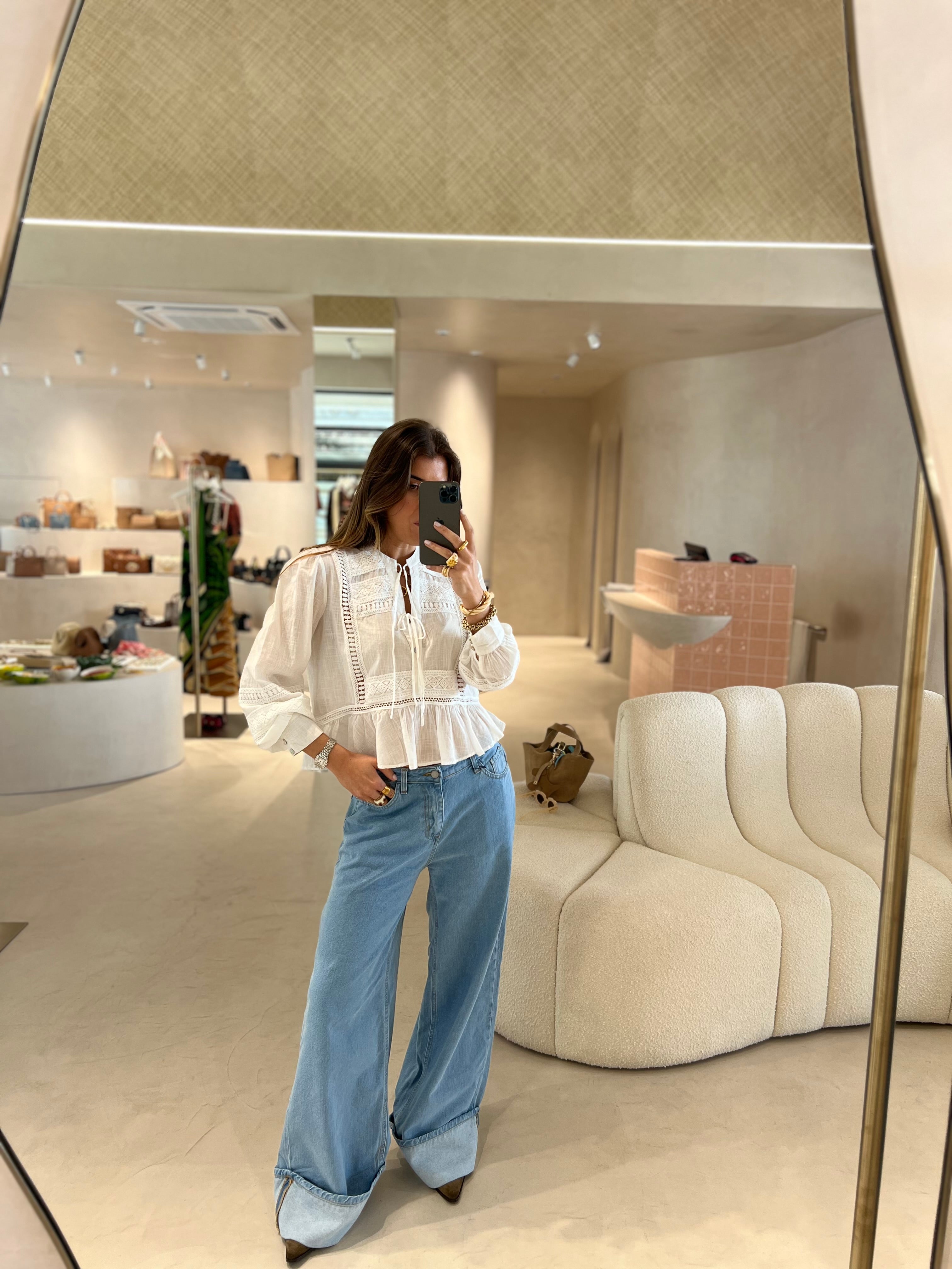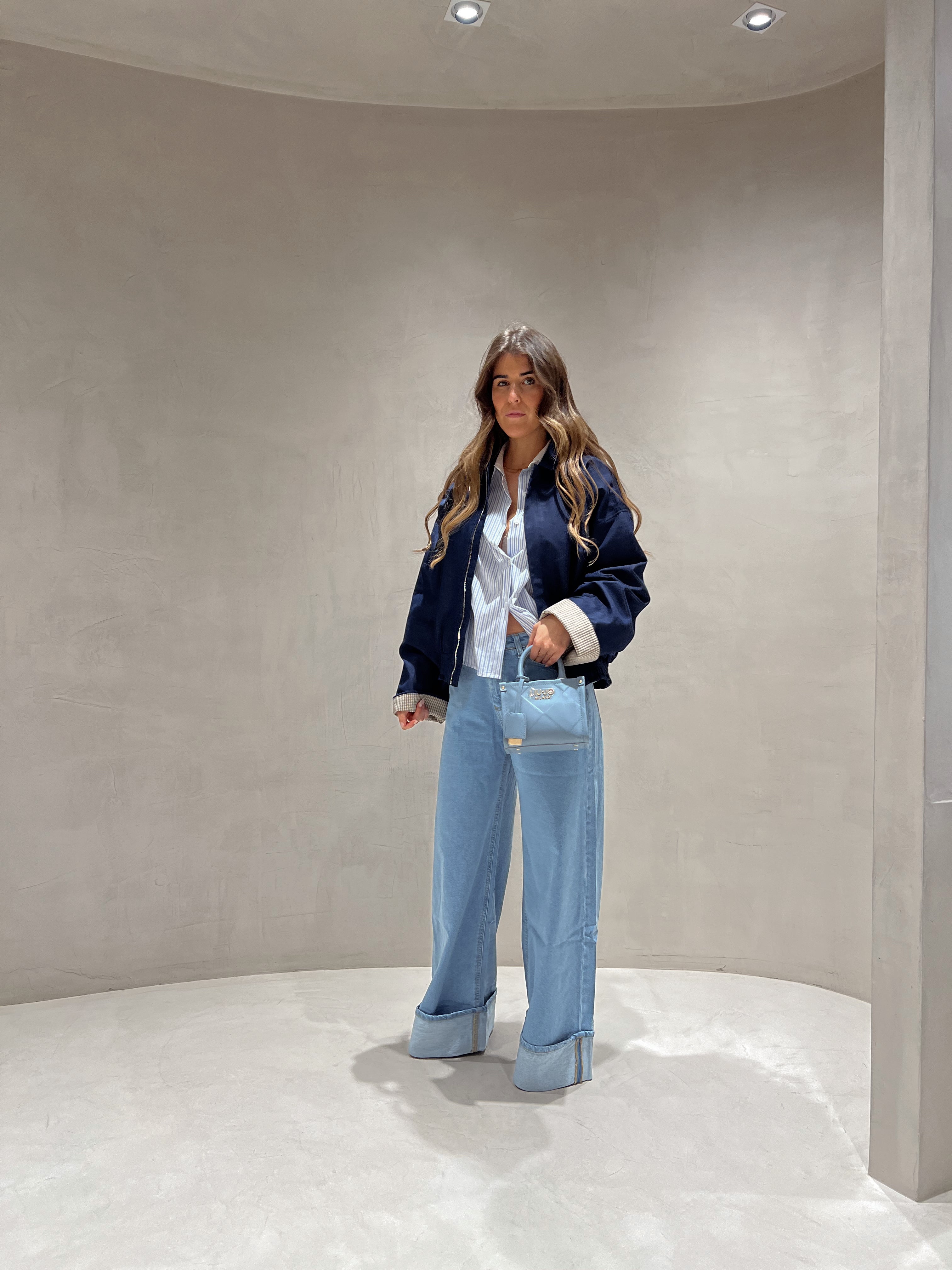 Calça de ganga wide leg clara com barra do avesso na bainha, presilhas para cinto.