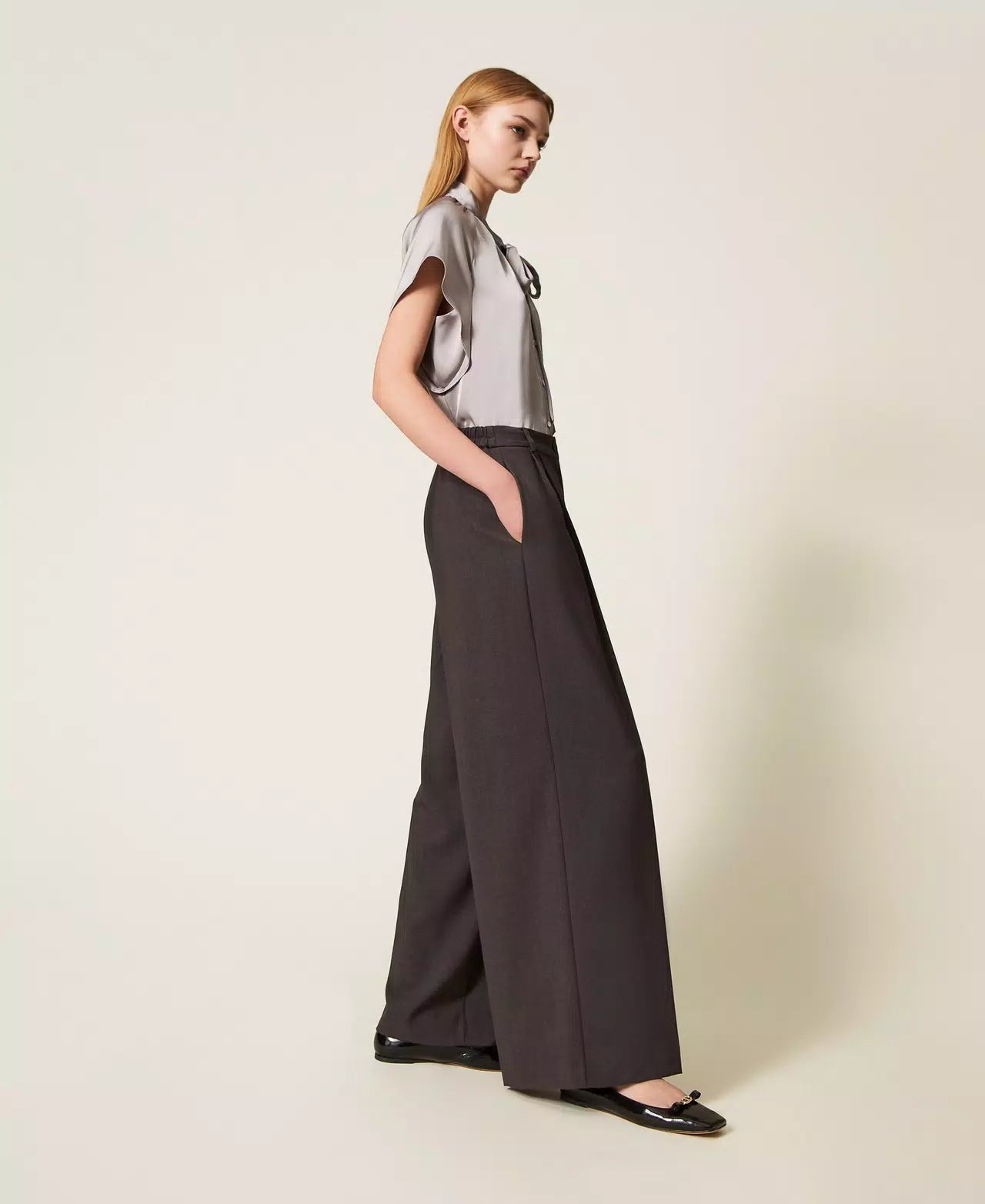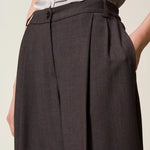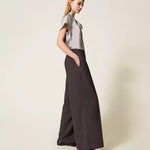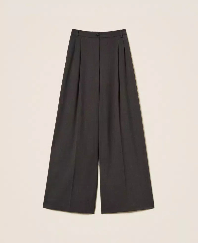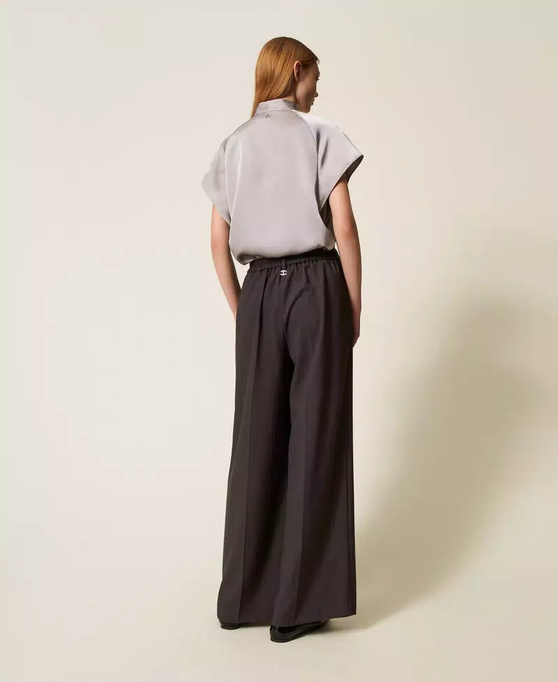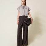 Calça palazzo com pregas frontais marcadas, cintura alta e corte amplo que alonga a silhueta. O vinco central reforça o aspecto estruturado, equilibrando o fluido da peça. Combine com blusas justas ou tops cropped para valorizar o volume da perna, ou ainda com camisas sobrepostas para um visual elegante e contemporâneo.