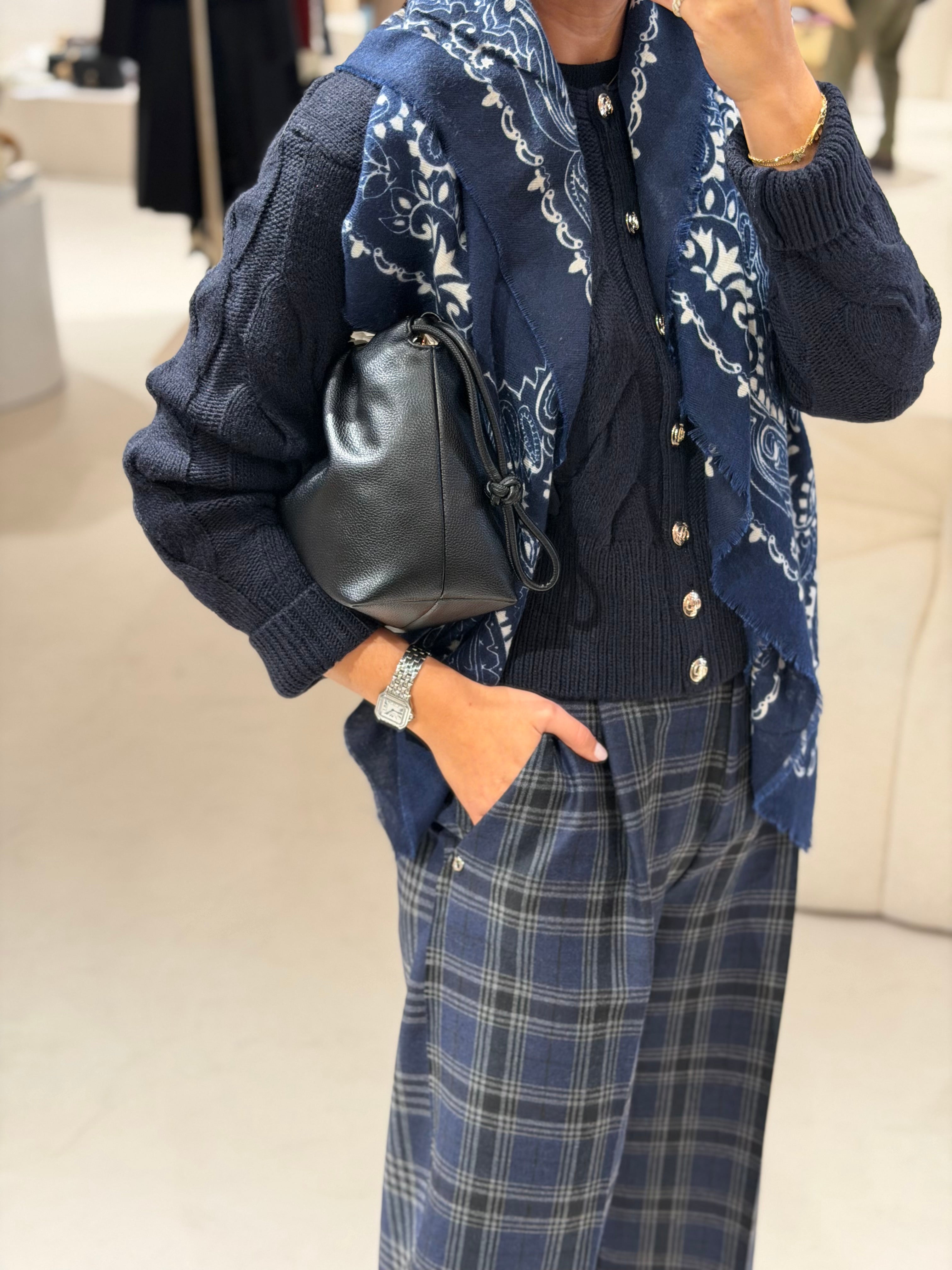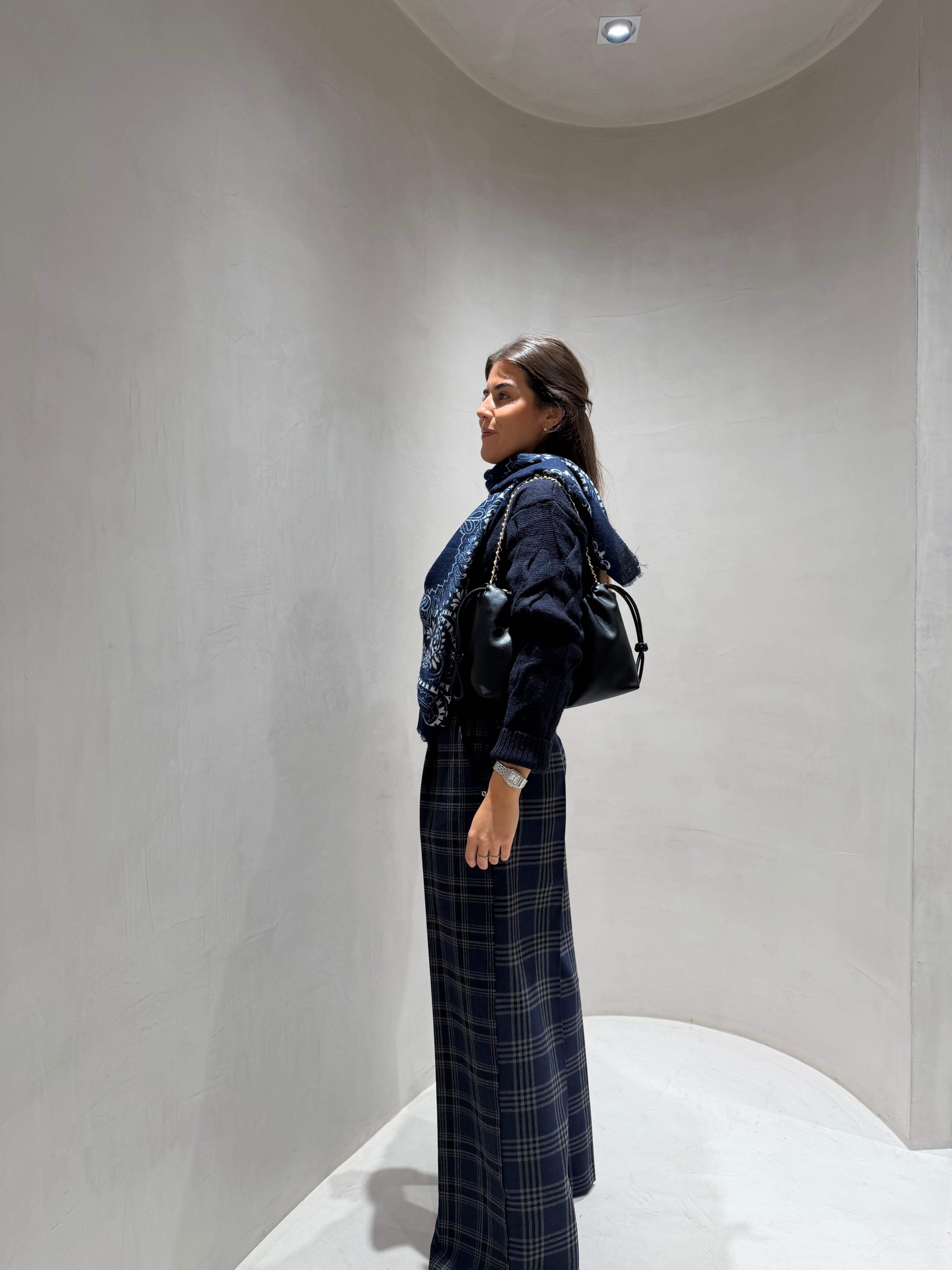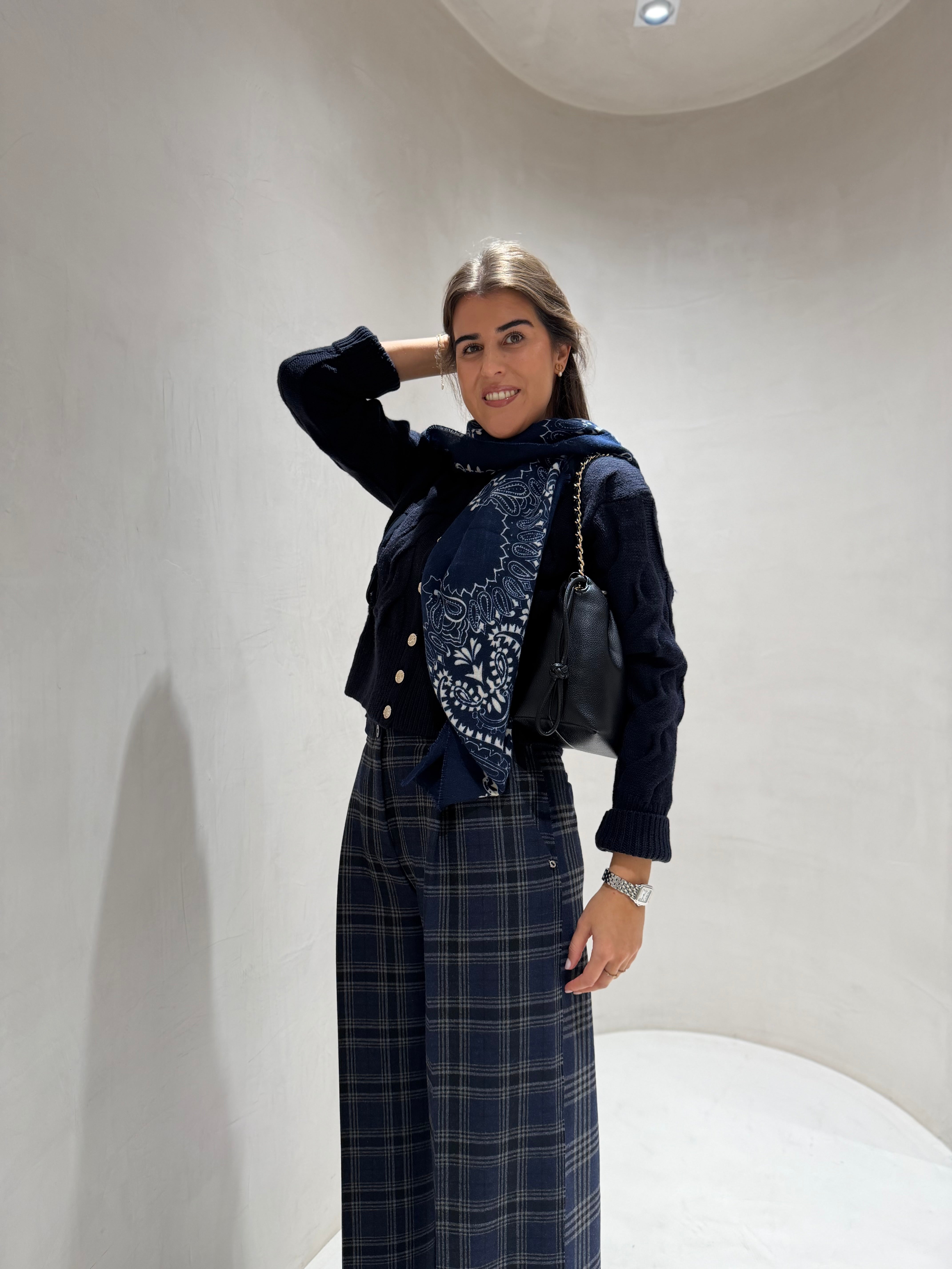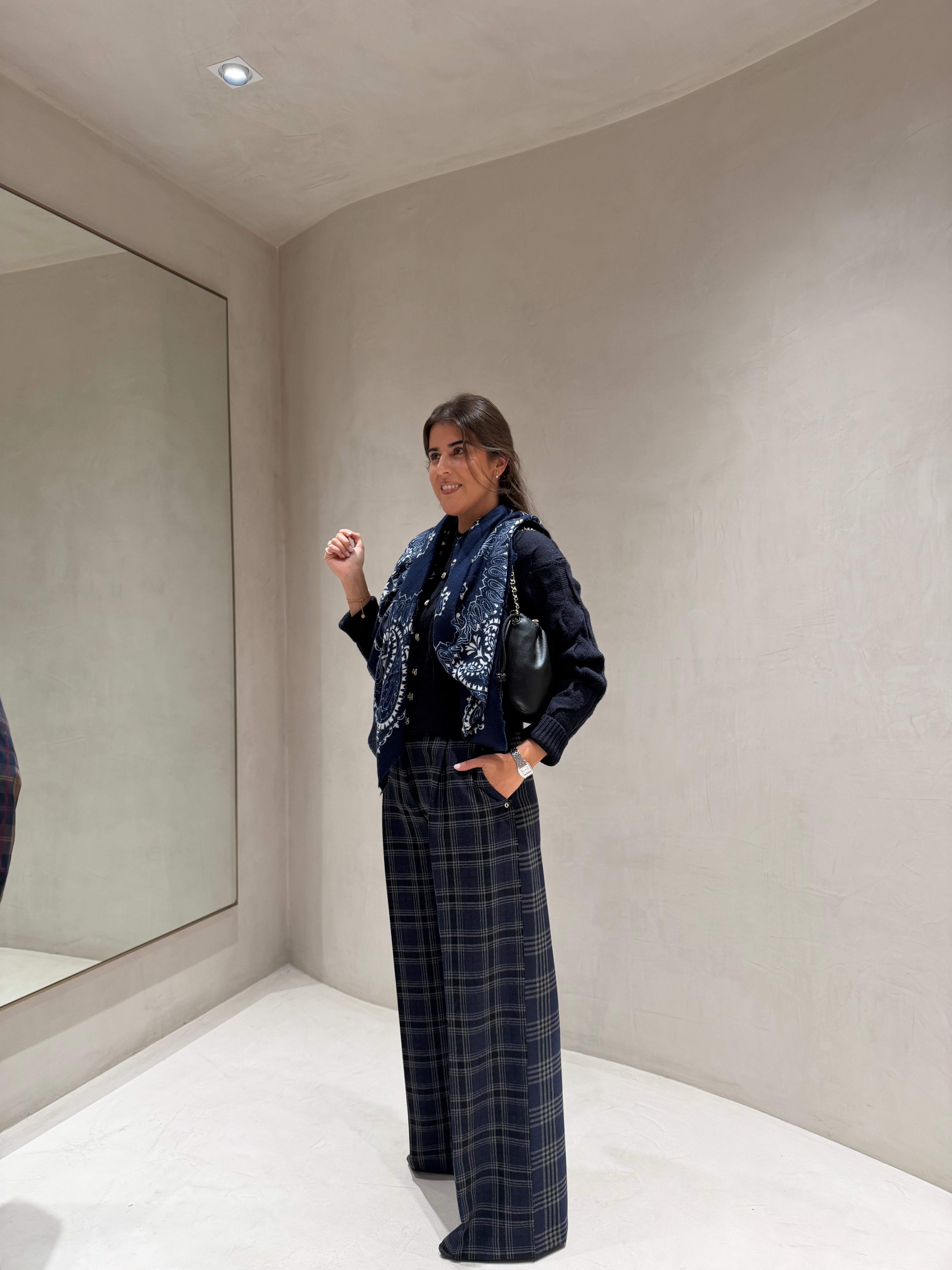 Calça palazzo com estampa xadrez – corte amplo, cintura alta e fluidez marcante. O padrão em tons neutros adiciona personalidade sem pesar, ideal para looks sofisticados e modernos. Combine com camisa lisa estruturada ou cropped minimalista e saltos finos ou loafers para um resultado elegante e contemporâneo.