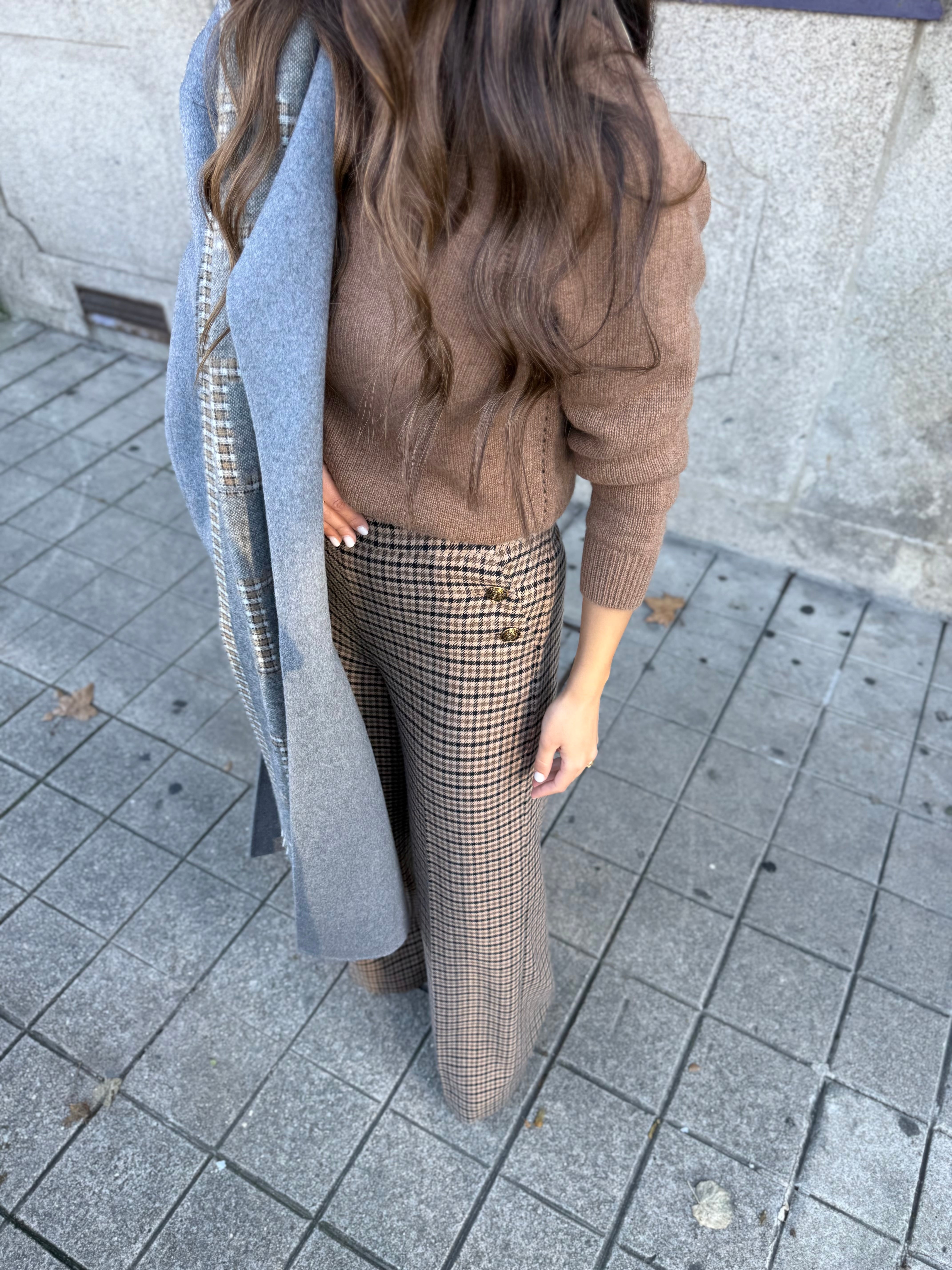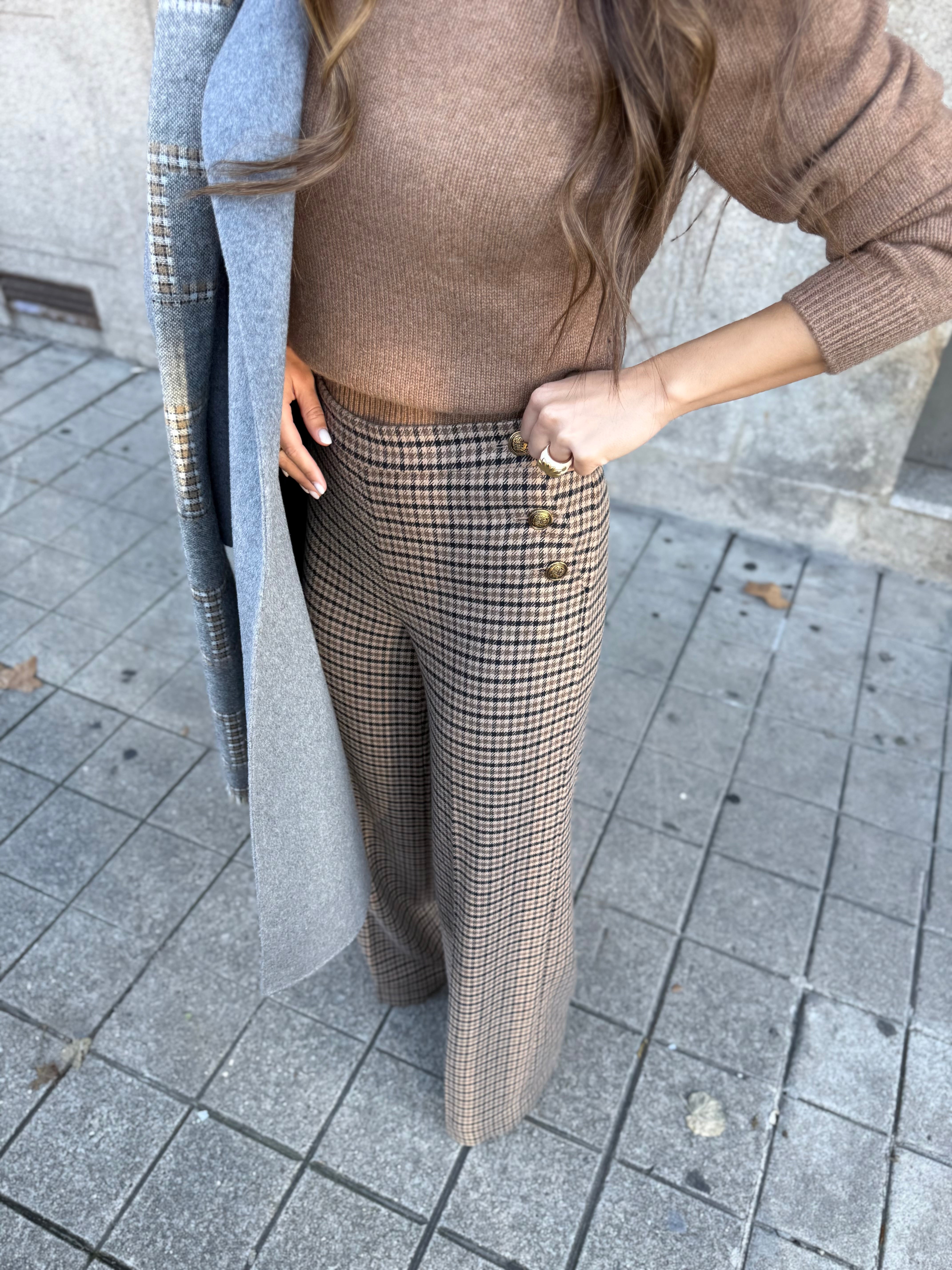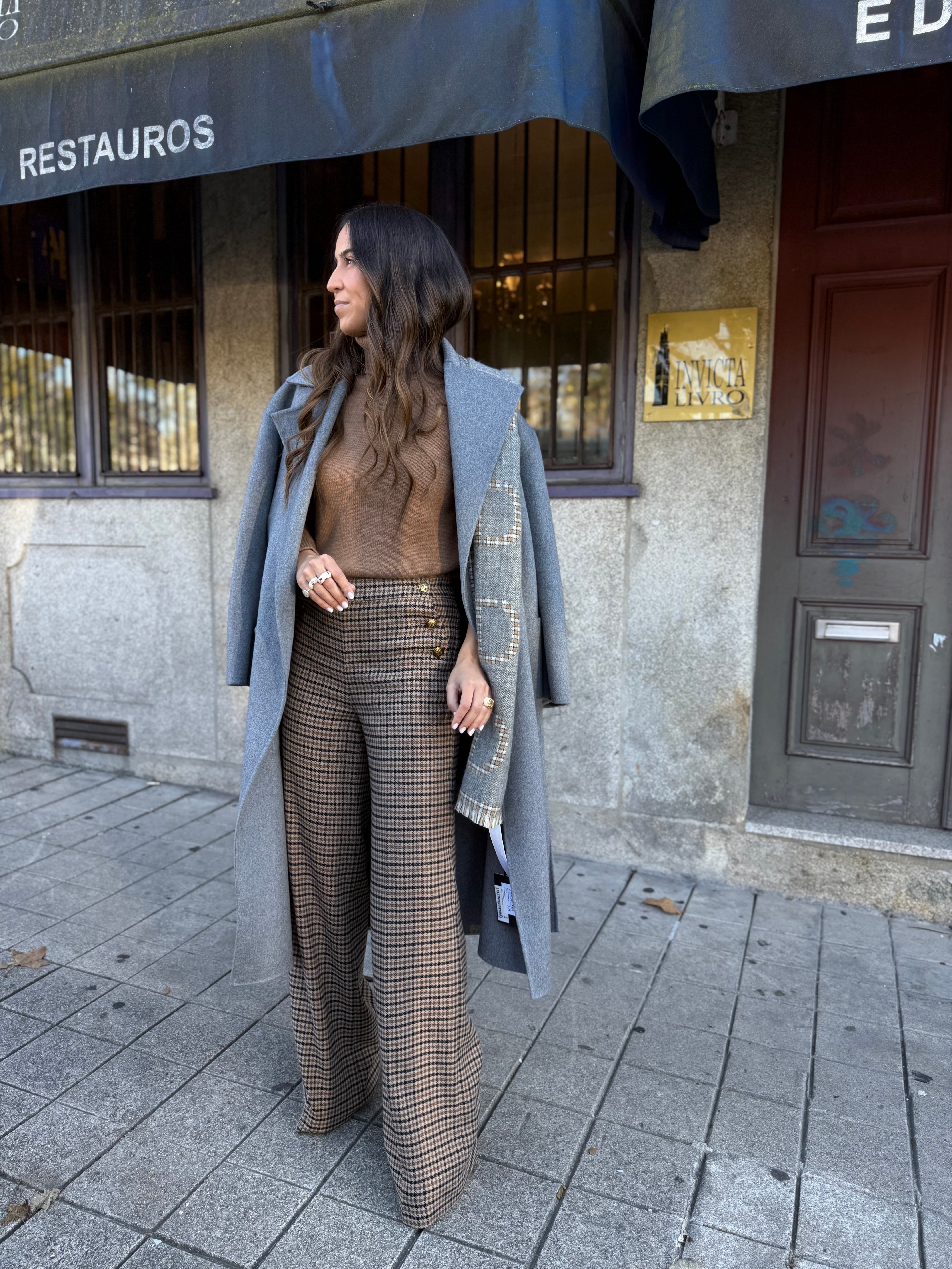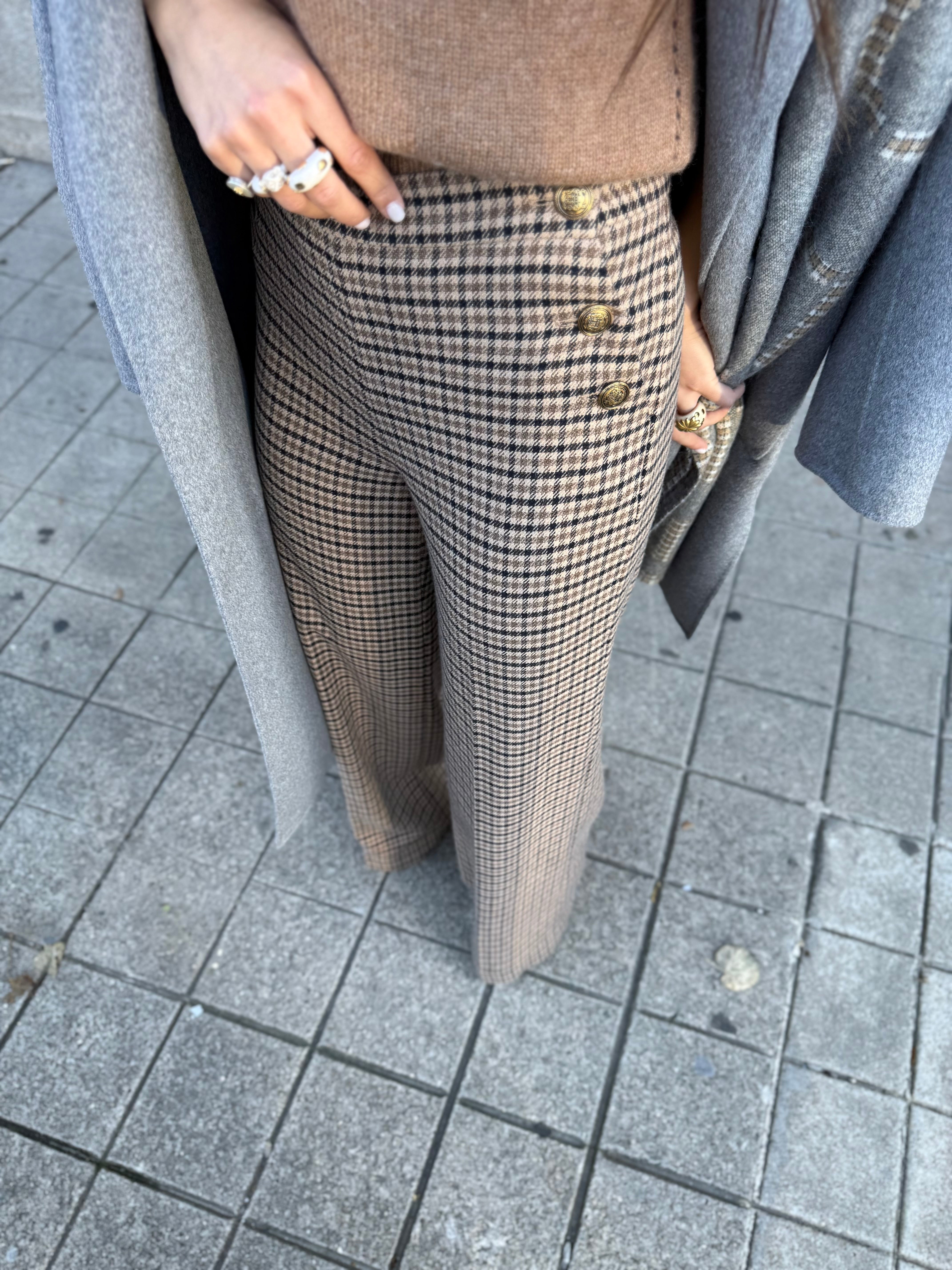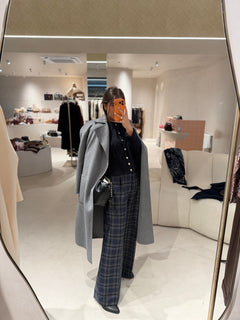Estas calças apresentam um corte recto elegante com padrão “small check” em tons camel e preto, confeccionadas numa mistura premium de lã. Destacam-se pelos botões “half ball” em metal dourado, bolsos inclinados e vincos marcados que criam uma silhueta sofisticada e estruturada. A placa “Oval T” nas costas adiciona um detalhe de assinatura discreto. Uma peça versátil e refinada, perfeita para transitar entre o formal e o contemporâneo.