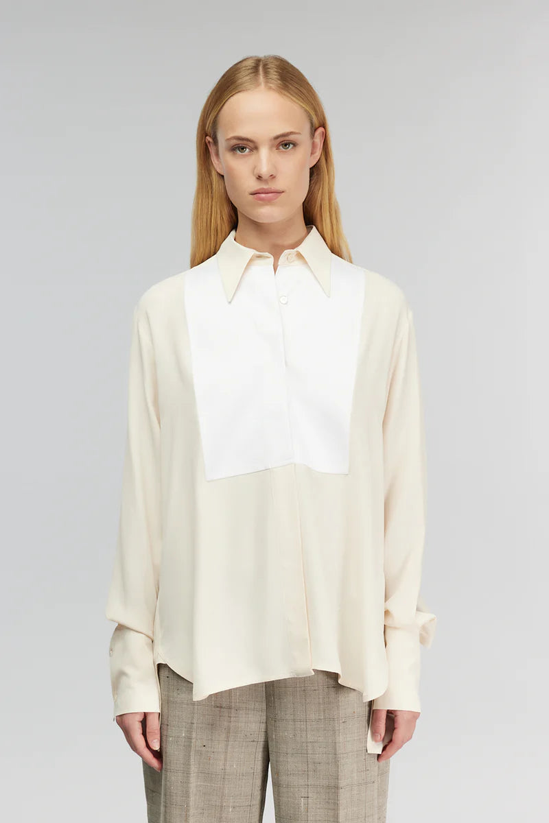 Camisa em Crepe de Chine Bege com Painel em Popelina Branco Krizia | SEMICOUTURE