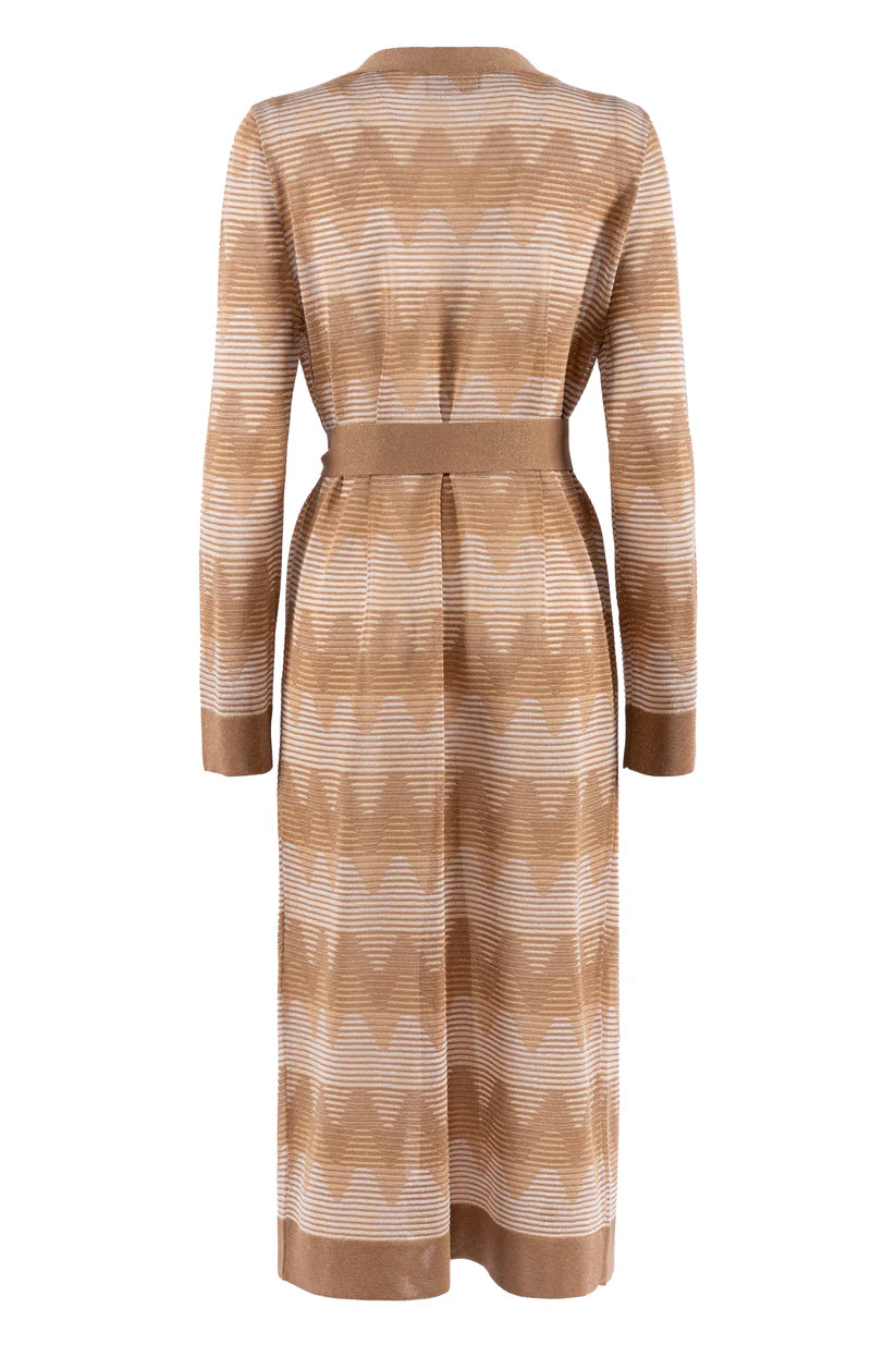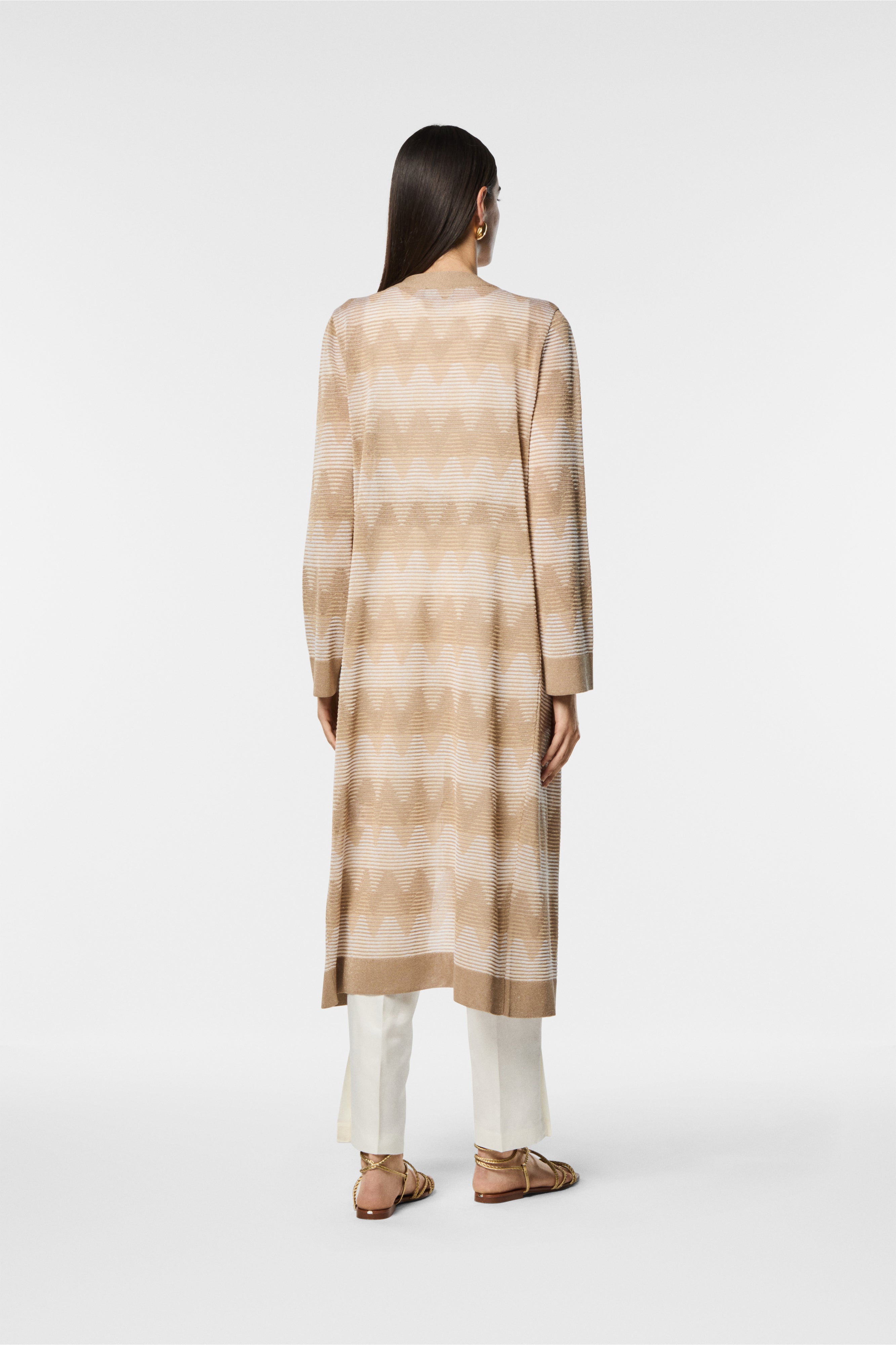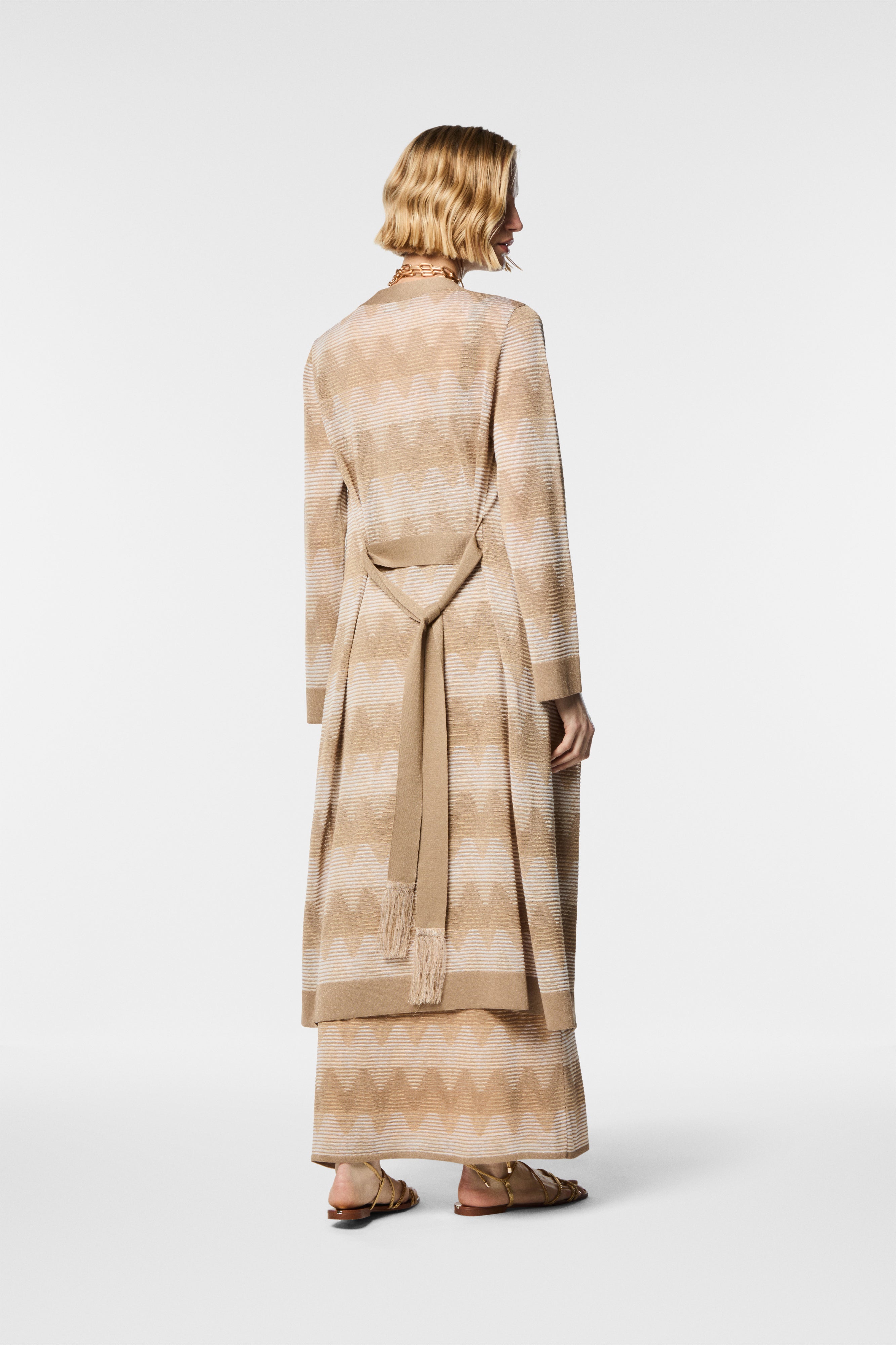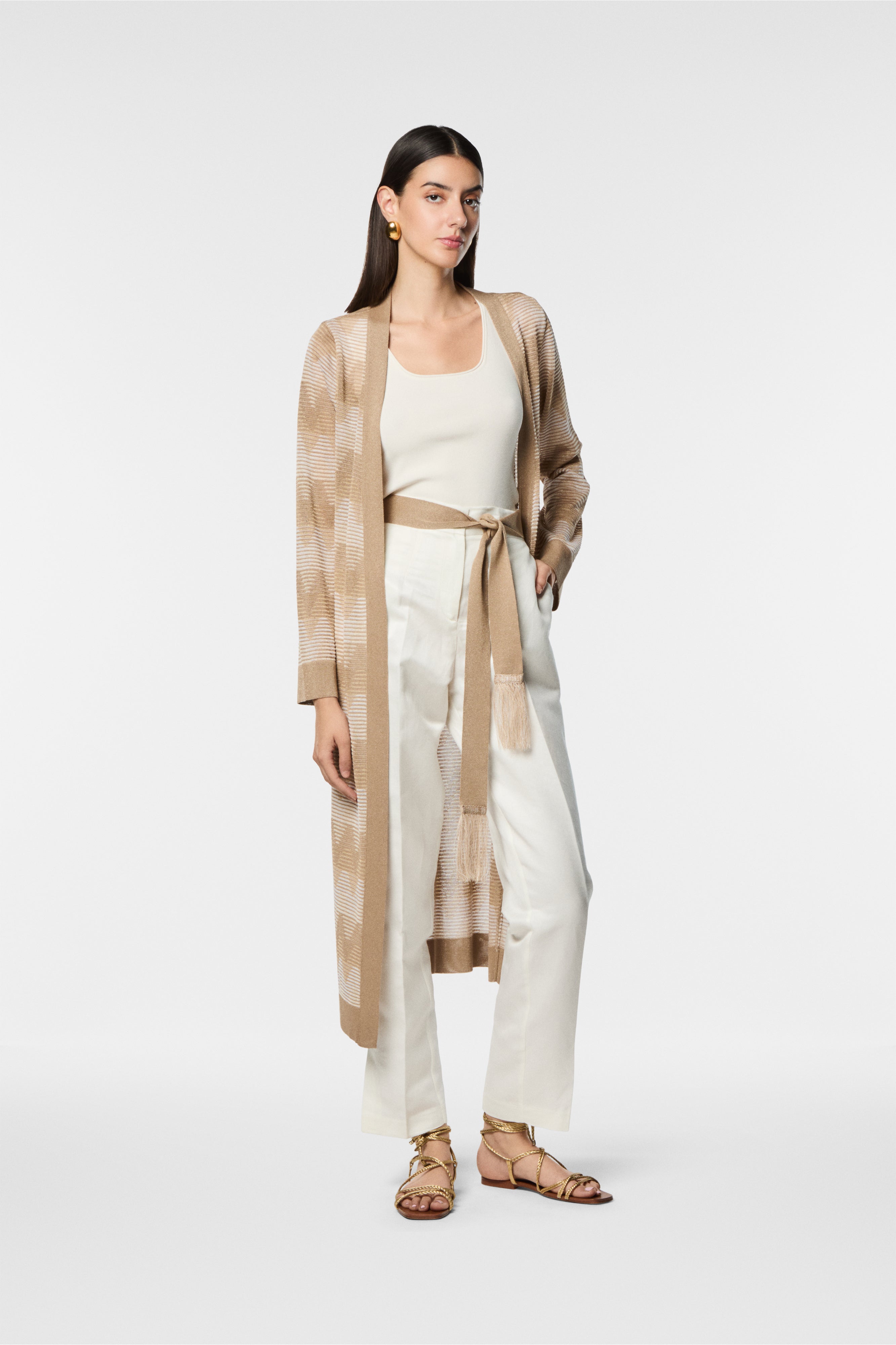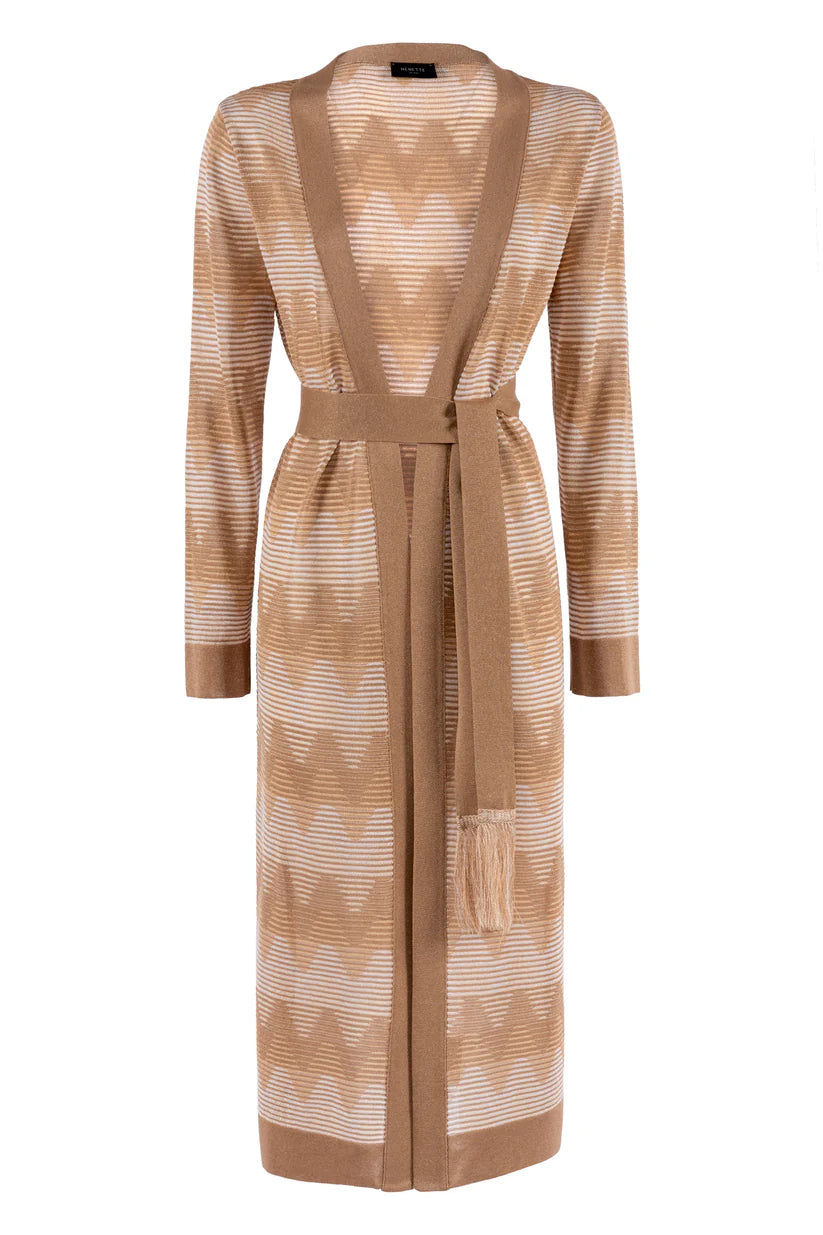 Casaco comprido Nenette em malha lurex com transparência, cinto amovível em malha com franjas nas extremidades, punhos e bainha canelados.