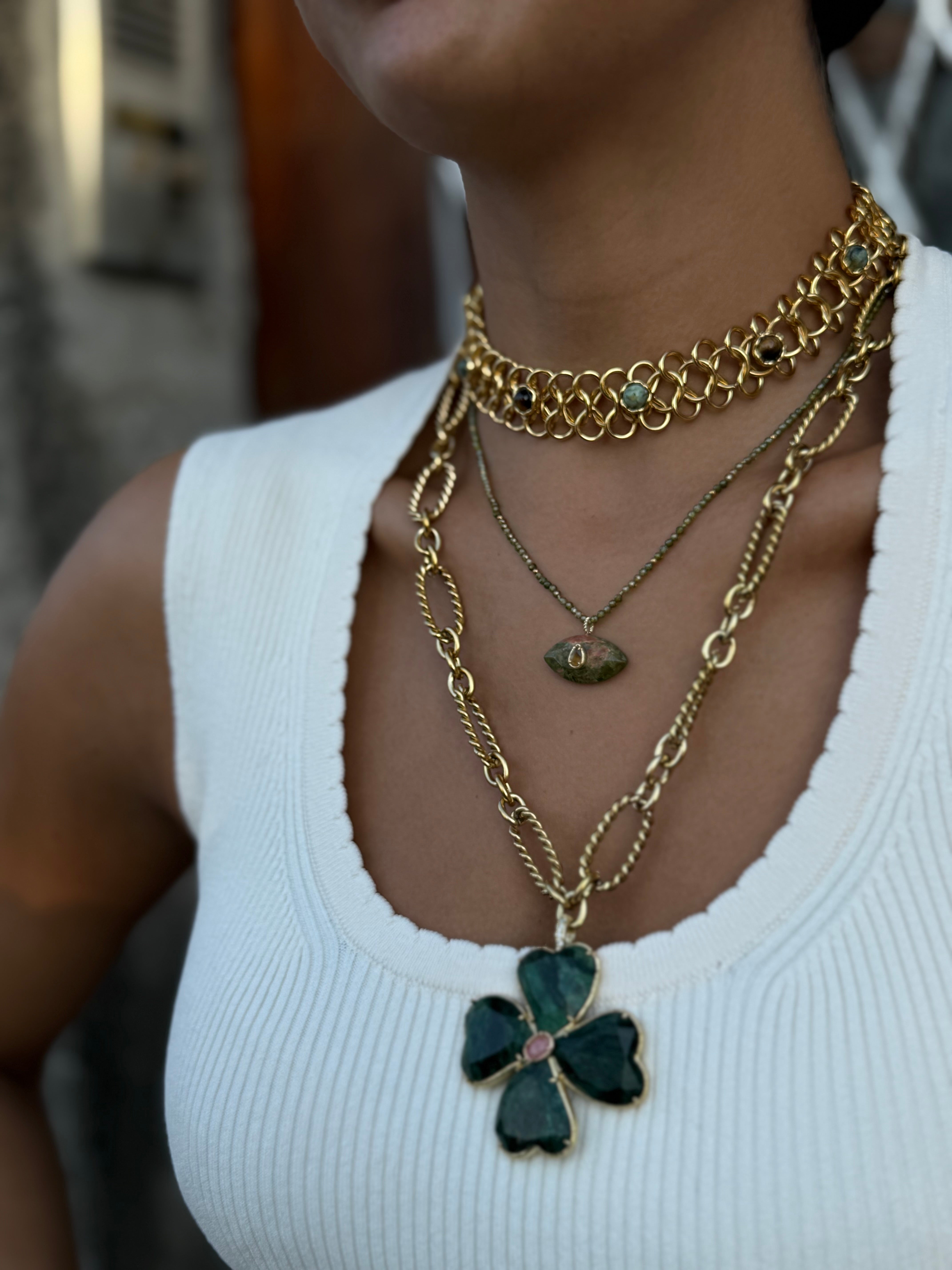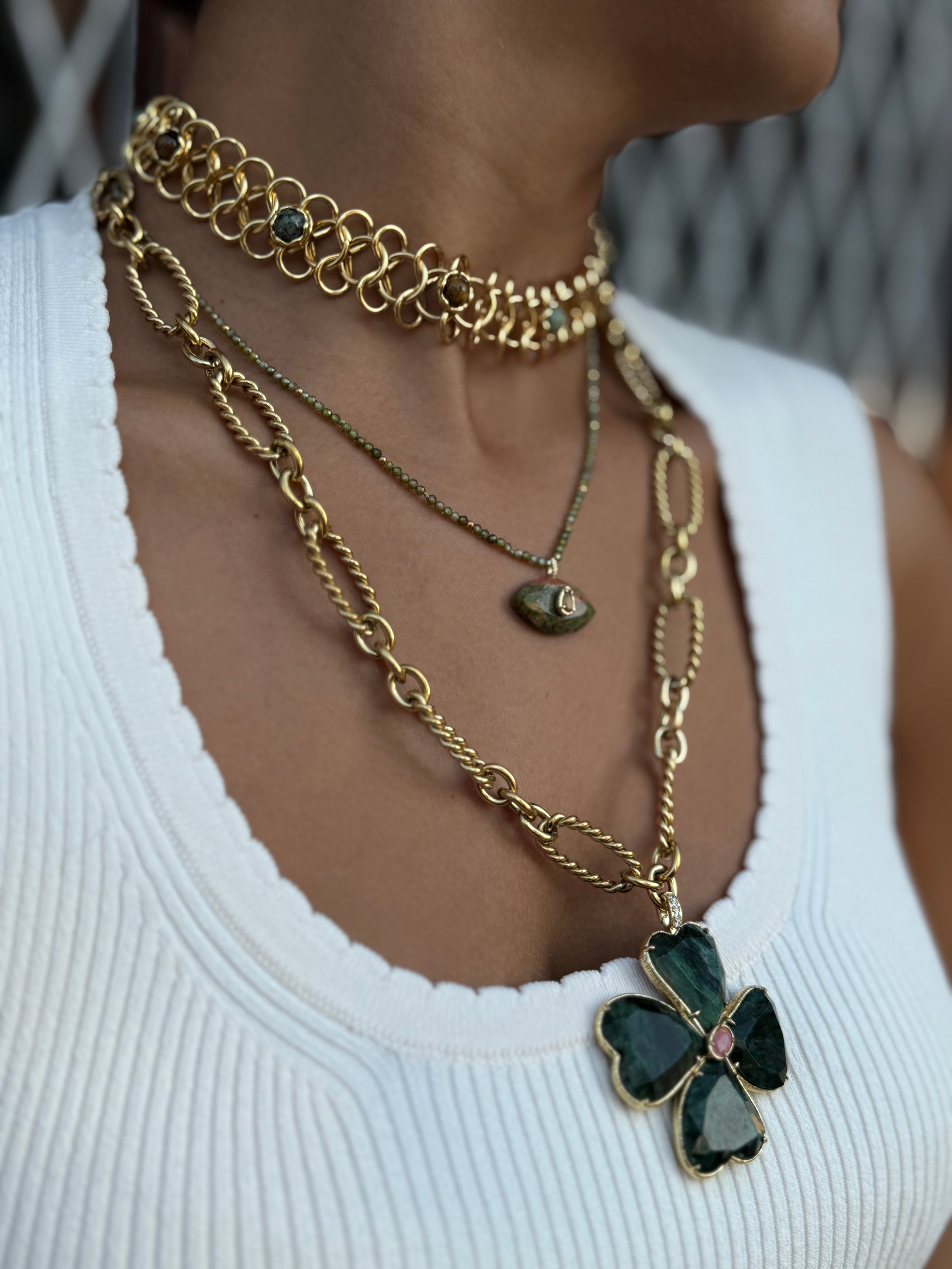 Choker/Colar Corrente Real com 7 Elos Redondos em Nacre e Pedras Naturais