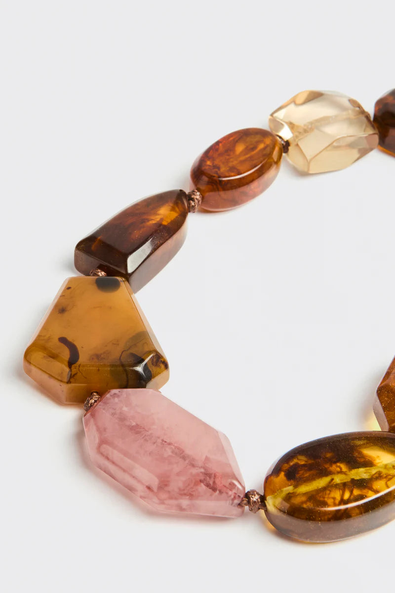 A Liviana Conti Collana Beyza é uma colar longo com elementos em resina multicolores e fecho com cordão de couro sintético, que cria um jogo de texturas elegante e único. A peça combina forma fluida e presença marcante com uma paleta de tons âmbar/quartz, refletindo o design italiano contemporâneo e a atenção ao acabamento da marca.